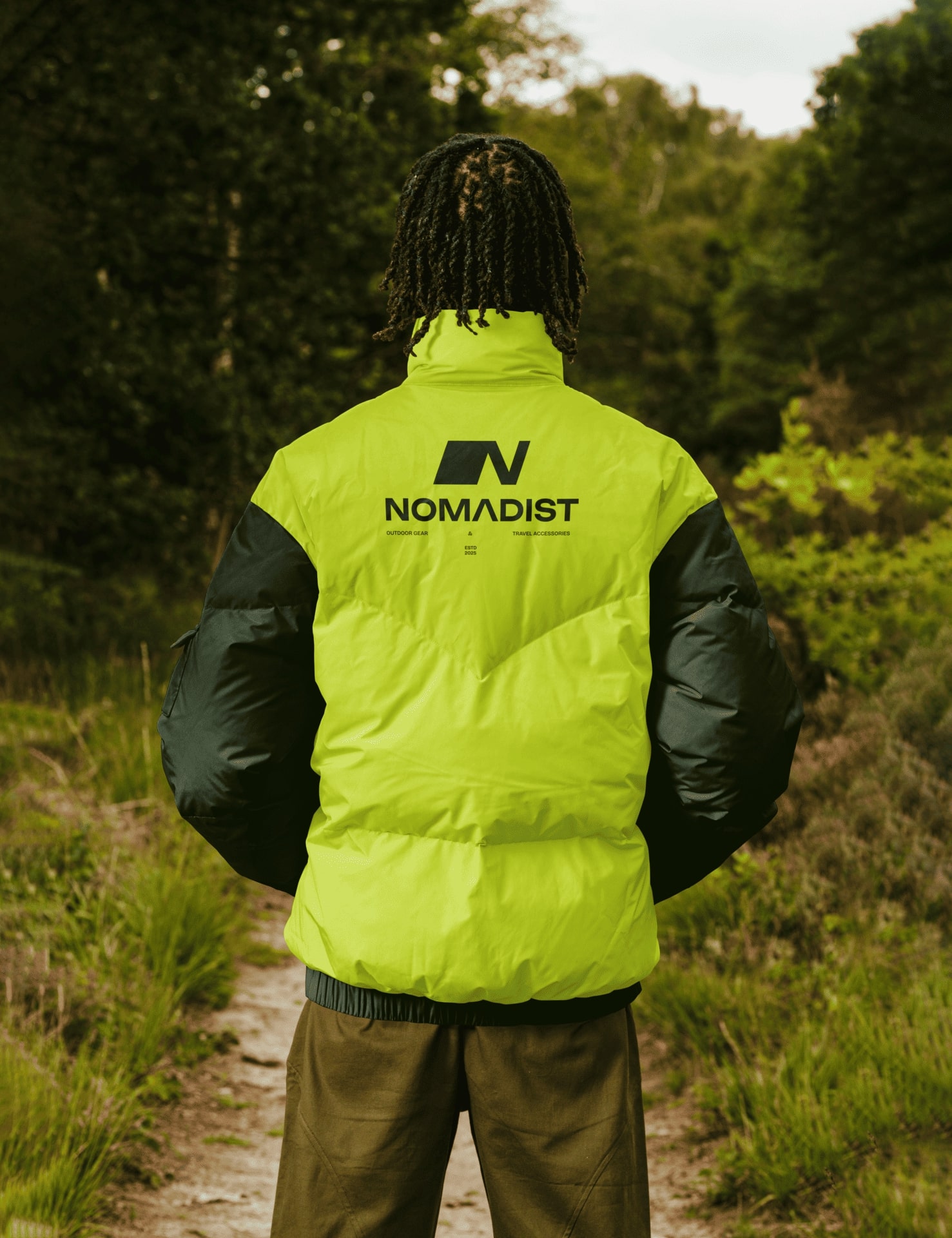 A Palette of Purpose: Our chosen color palette is a bold declaration of intent. The vibrant Electric Lime Green isn’t merely a trendy hue; it’s a beacon of energy, visibility, and a symbol of nature revitalized. Paired with deep, grounding tones of charcoal and forest green, it creates a striking contrast that is both visually arresting and functionally essential in diverse environments. This palette reflects the balance between raw nature and human innovation, ensuring that Nomadist stands out while belonging to its natural habitat.