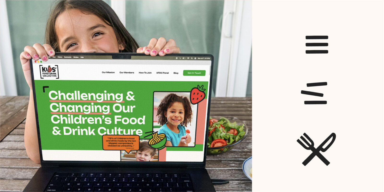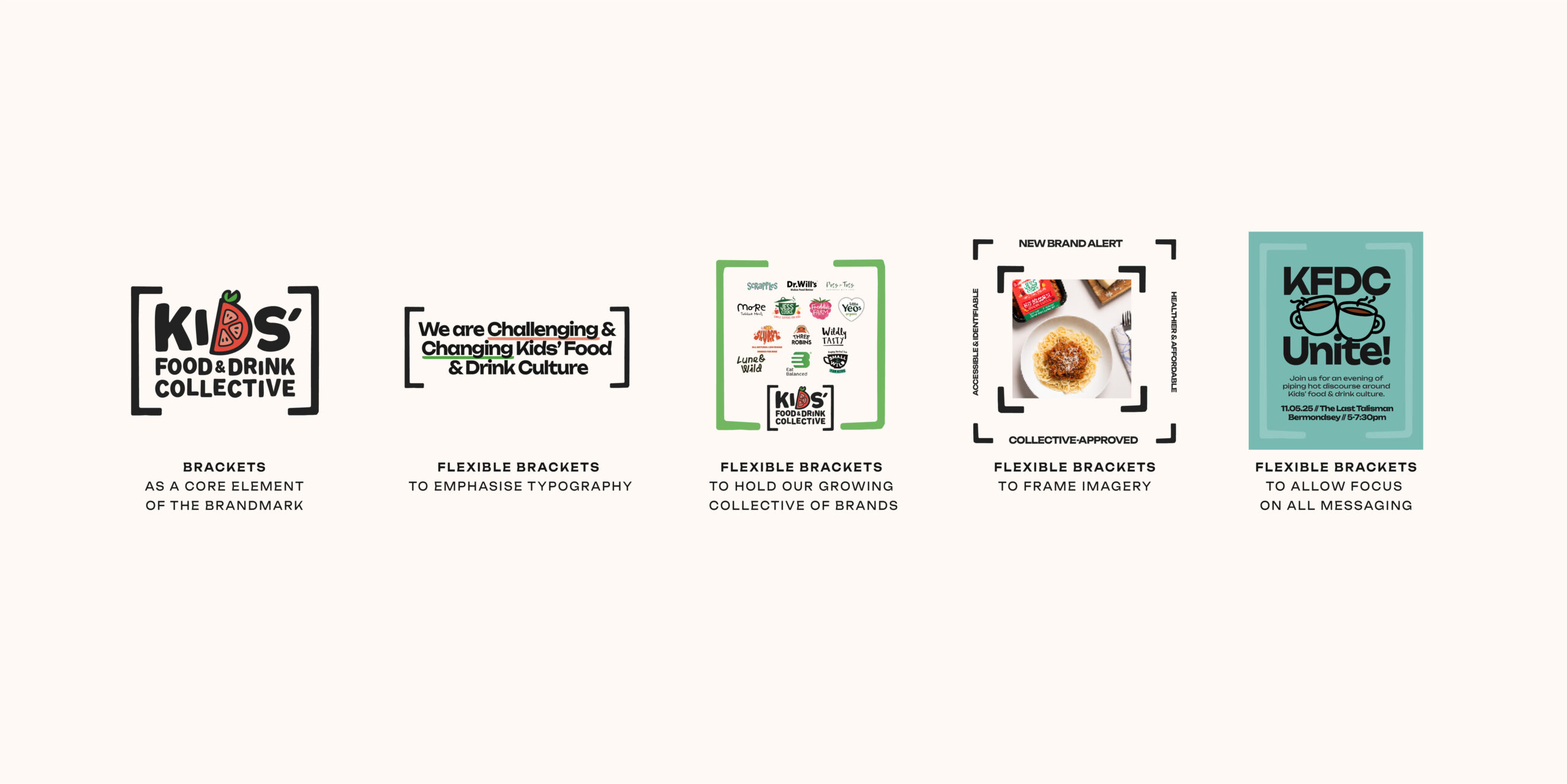 We built a comprehensive identity and toolkit to give them the flexibility to speak to a variety of stakeholders, while creating an engaging, ownable way to communicate the facts and stats around the state of Kids food, and to make them sit up and take notice of the opportunity. Introducing a set of brackets to hold the brandmark helped cement our presence as a collective and formed the foundation for a flexible bracket system – allowing for a consistent graphic language across the wide range of touchpoints we needed to consider.