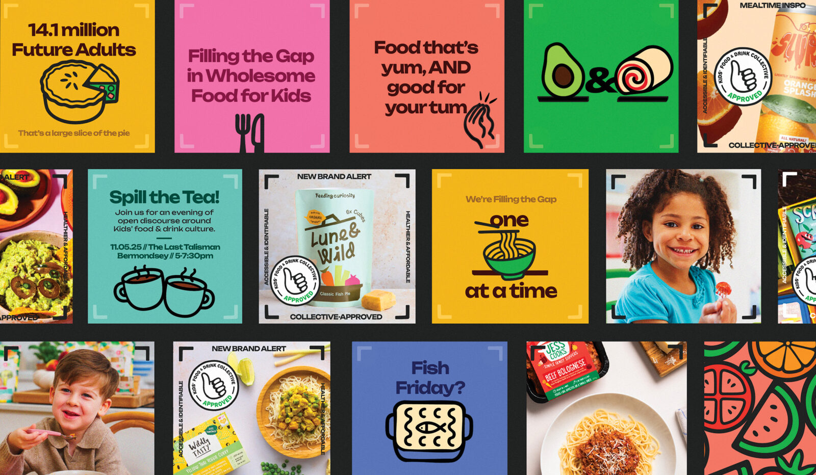 Our redesign shifted the brand into a more optimistic, feel-good space, celebrating the abundance and variety of nutritious and delicious Kids’ food and drink that the Collective’s brands bring. The refreshed identity – guided by the creative vision of “filling the gap” between what’s currently on shelves and what good Kids’ food actually is – brings strength and impact to the messaging, giving the brand presence as a collective movement with a joyful, foodie spirit at its core.