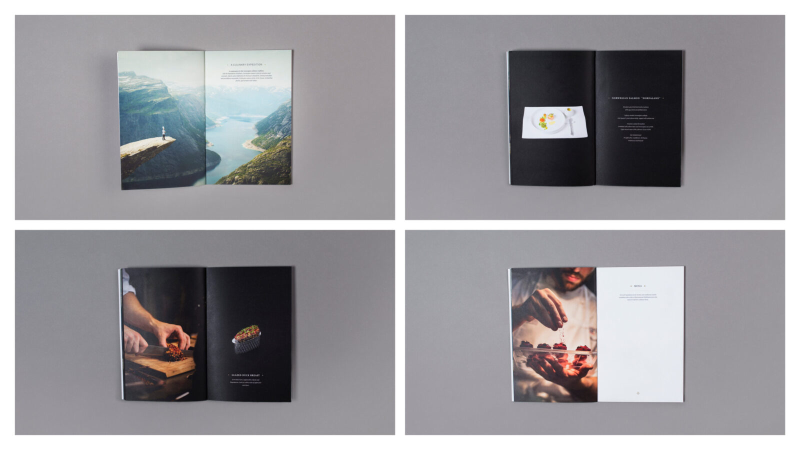 The colour palette draws from Norwegian nature: sea-blues, stone-greys, moss-greens, and warm neutrals, grounding the brand in the landscapes from which its ingredients are sourced. The imagery blends stylised gourmet photography with evocative natural scenes, creating a visual rhythm between haute cuisine and the rugged environments that inspire it.