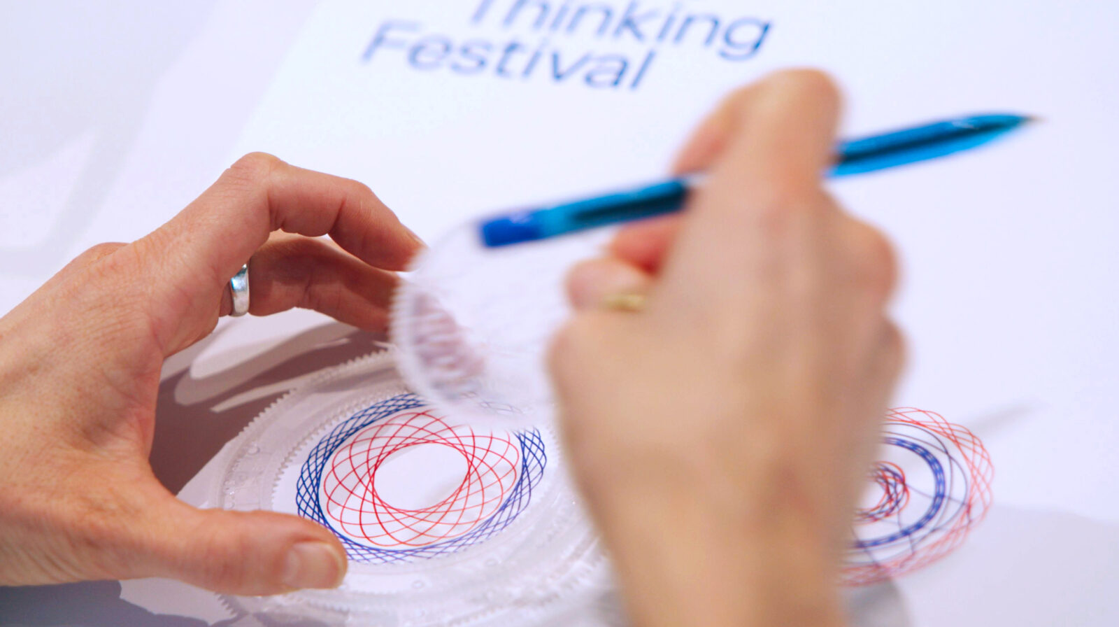 The striking red and blue colour palette reflects the familiar Biro-pen combination traditionally used to create spirographs.