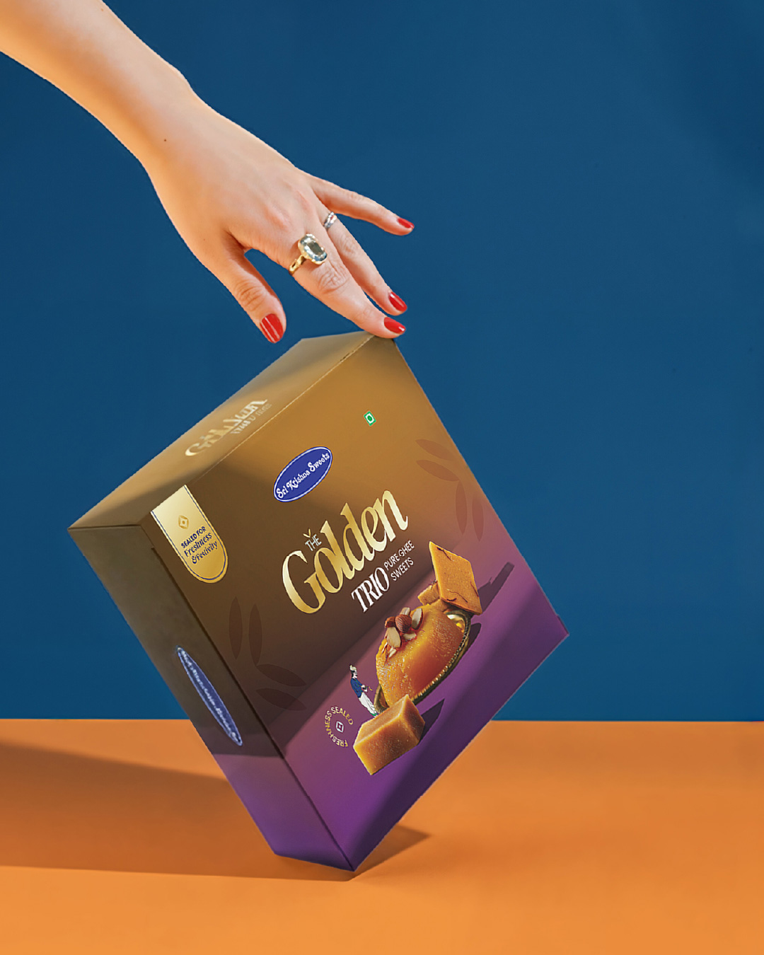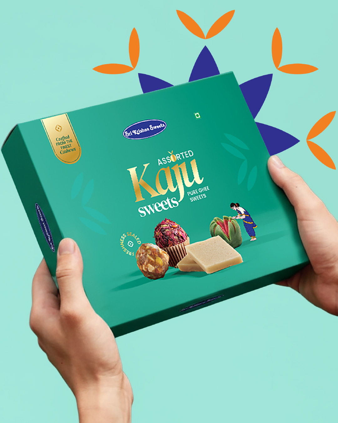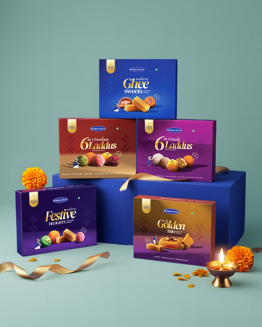 A packaging family with stronger recall, shelf interaction, and clearer ownership. In a cluttered market, it helps people instantly recognise the original Sri Krishna Sweets.