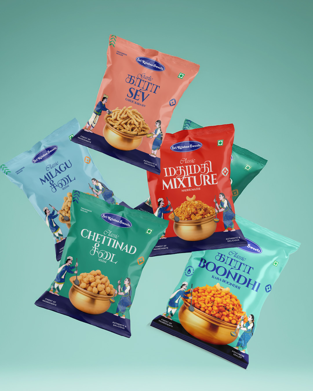 - Keywords: Sri Krishna Sweets, Kirukal, Studio Kirukal, Packaging Redesign, Tamil Nadu, Chennai, South India, Tamil Brand
