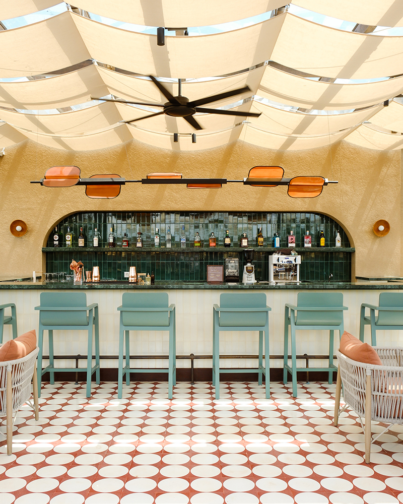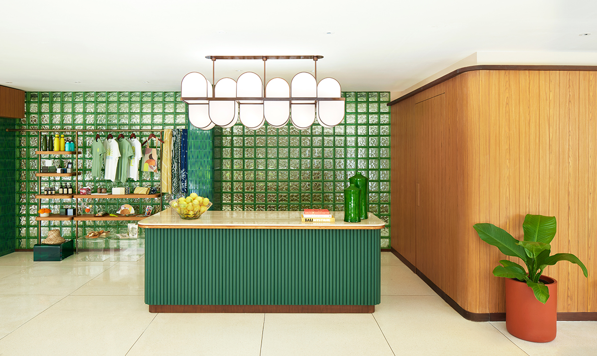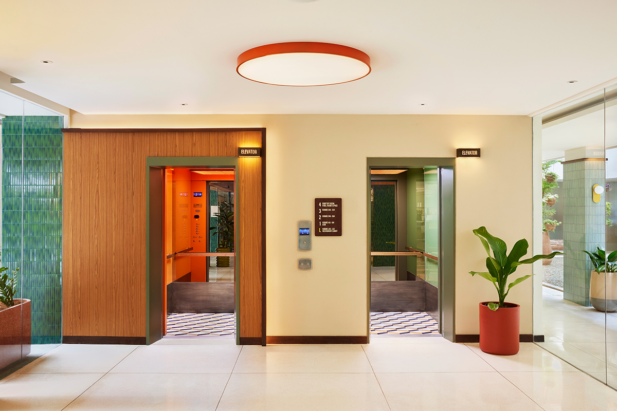 This philosophy extends into the interior design, which focuses on using locally sourced Indonesian materials interpreted through a mid century lens. Custom lighting, coloured glass, fluted details, and soft curves help to balance the more industrial lines of the existing building. Bold tiling and bespoke colour palettes introduce a modern Riviera spirit on the rooftop and evolve into a more artistic and curated aesthetic throughout the public areas. Expressive moments appear in the vinyl listening lounge, the lobby, retail corners, the gym, and other social spaces, each with its own character yet unified by the Kleo narrative. A standout feature is the set of elevators, mirrored and finished with Indonesian tile motifs reimagined in a contemporary mid century style. Lush indoor and outdoor planting adds an almost biophilic feeling, grounding the property in the climate, the street, and the surrounding neighbourhood.