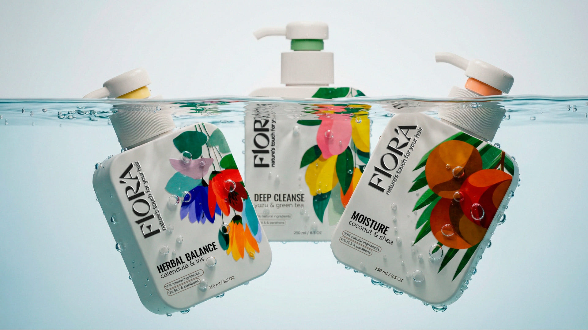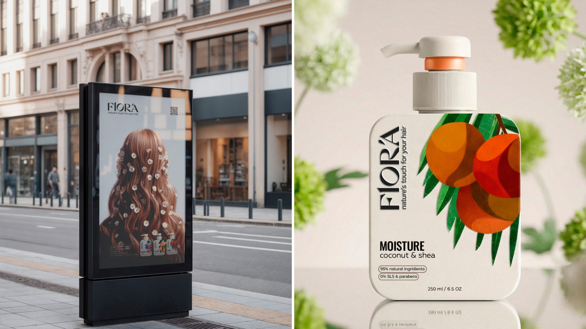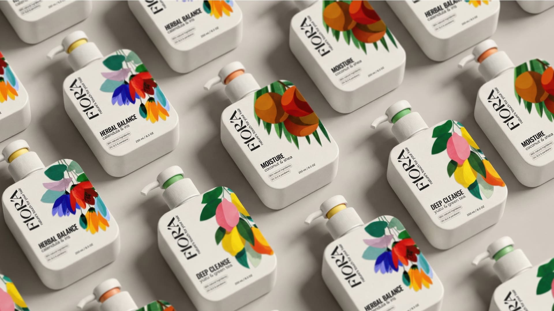 The typography is clean and confident. The vertical FLORA logotype creates a distinctive brand block and adds character, setting the product apart from typical “natural” brands that often rely on overly decorative visuals. The minimalist layout highlights key benefits – natural ingredients, no SLS, no parabens – allowing consumers to grasp the value proposition within seconds.