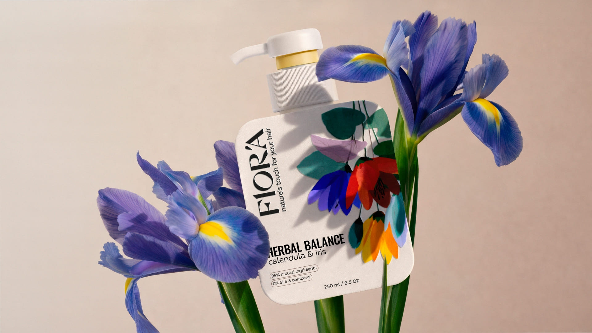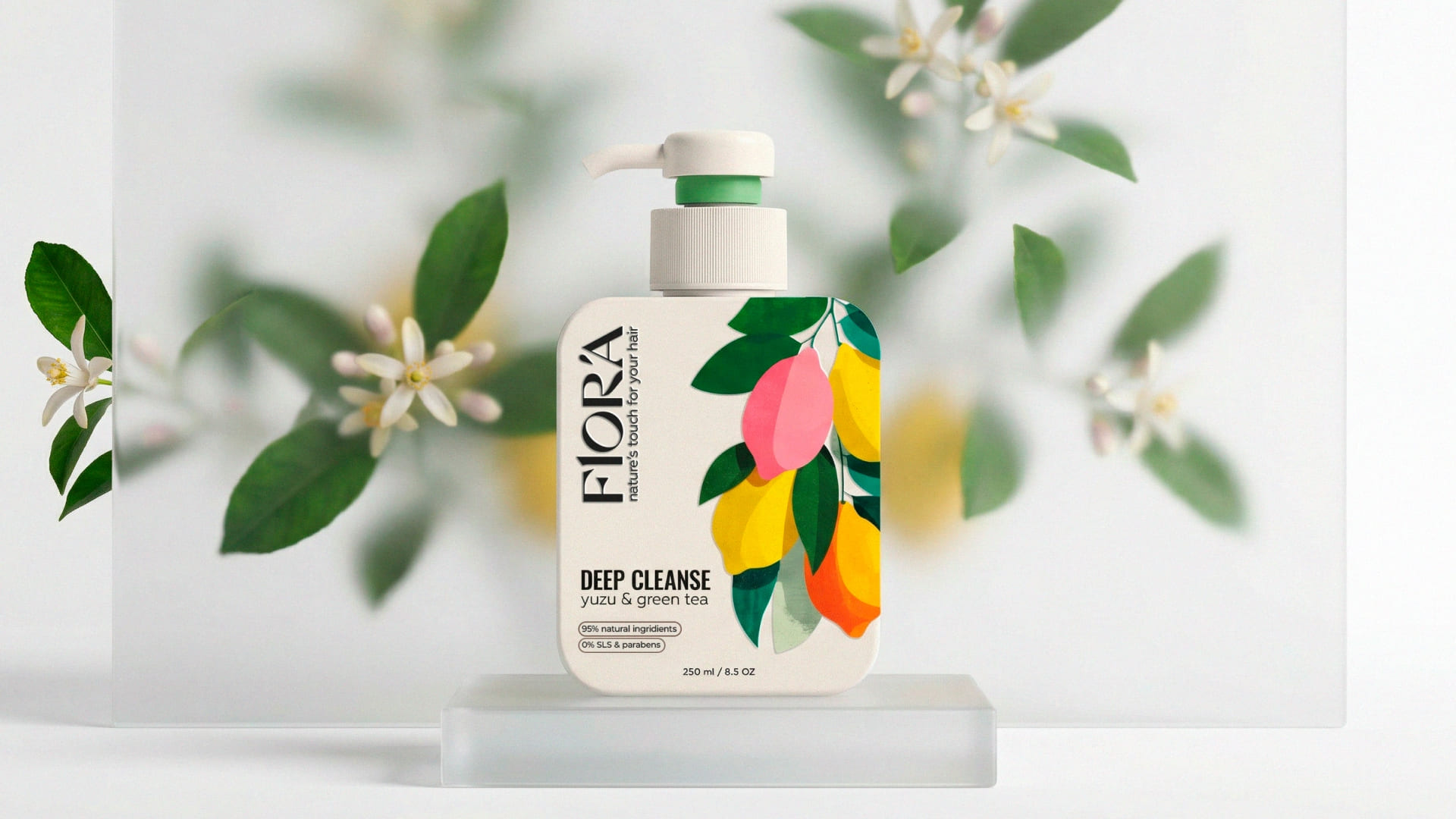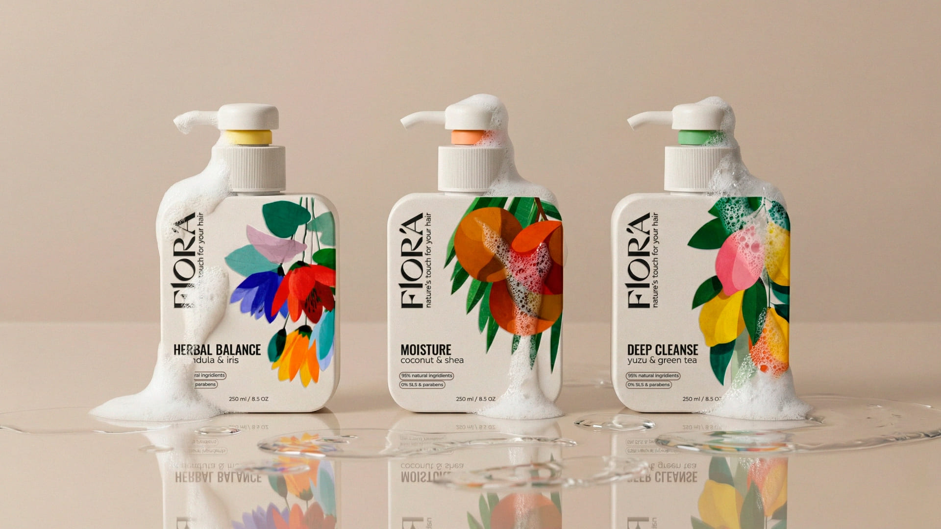 The typography is clean and confident. The vertical FLORA logotype creates a distinctive brand block and adds character, setting the product apart from typical “natural” brands that often rely on overly decorative visuals. The minimalist layout highlights key benefits – natural ingredients, no SLS, no parabens – allowing consumers to grasp the value proposition within seconds.