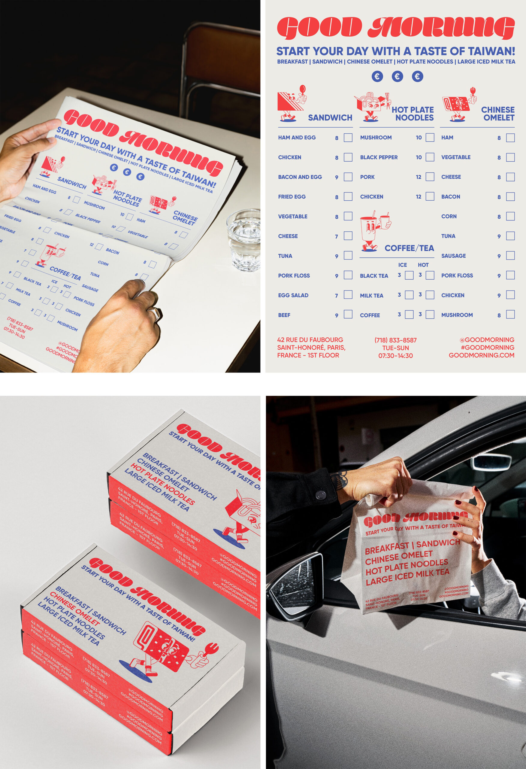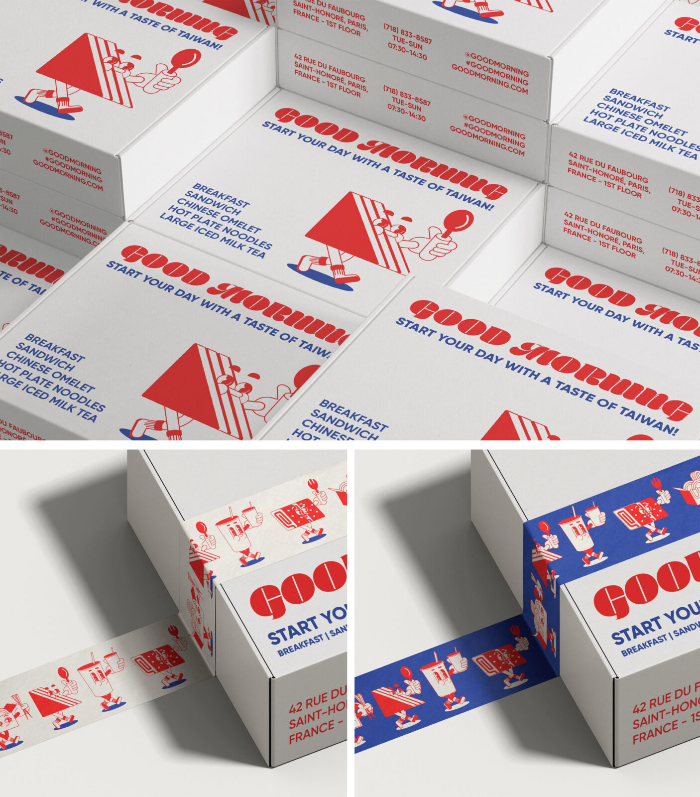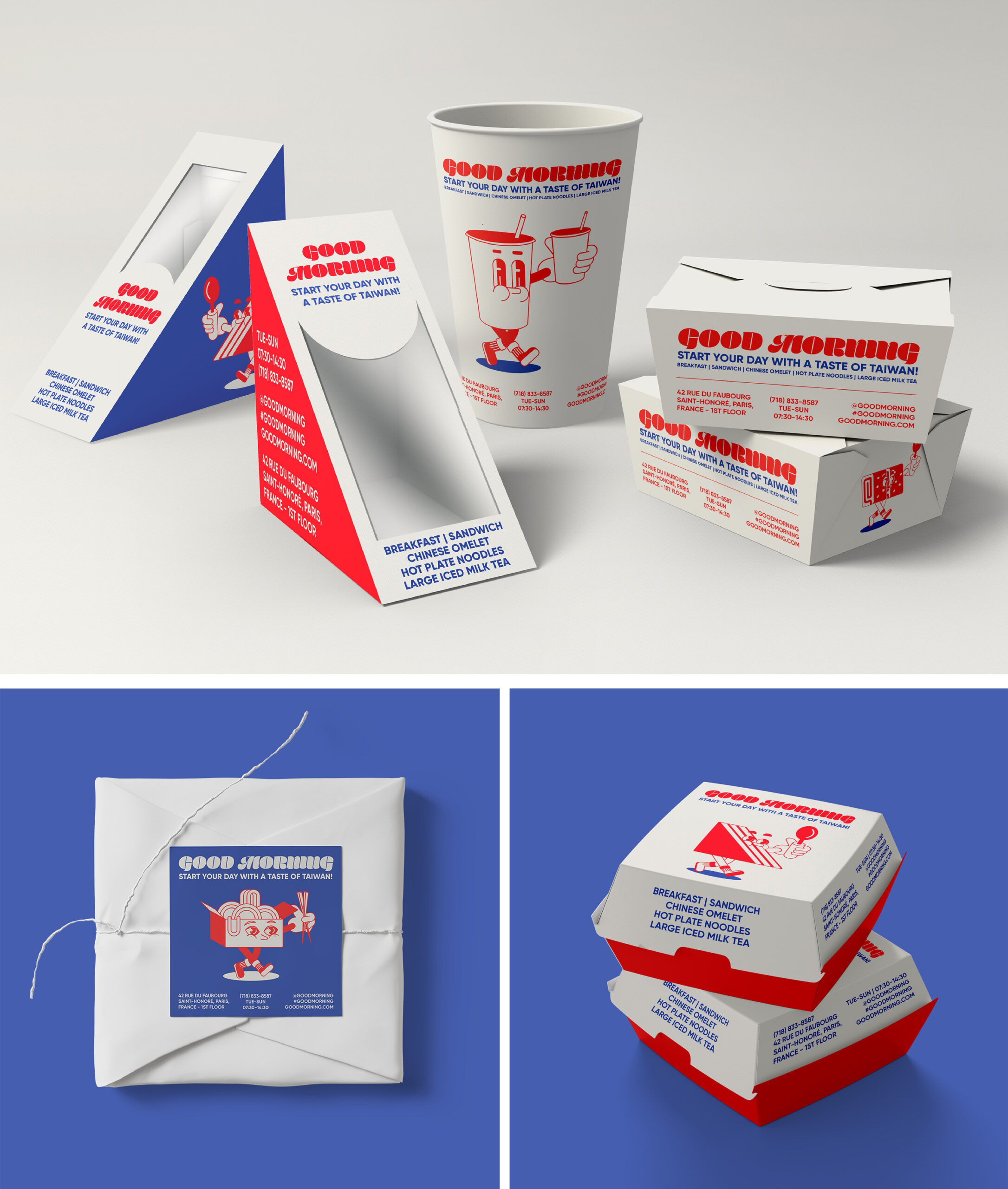 Good Morning is a fictional Taiwanese breakfast brand concept set in Paris, thoughtfully designed to fuse the visual and cultural identities of both Taiwanese and French cultures. The brand identity draws from the shared color palette of the two nations—red, blue, and white—creating a symbolic and aesthetic bridge between East and West, while reflecting the vibrancy of both food and community.