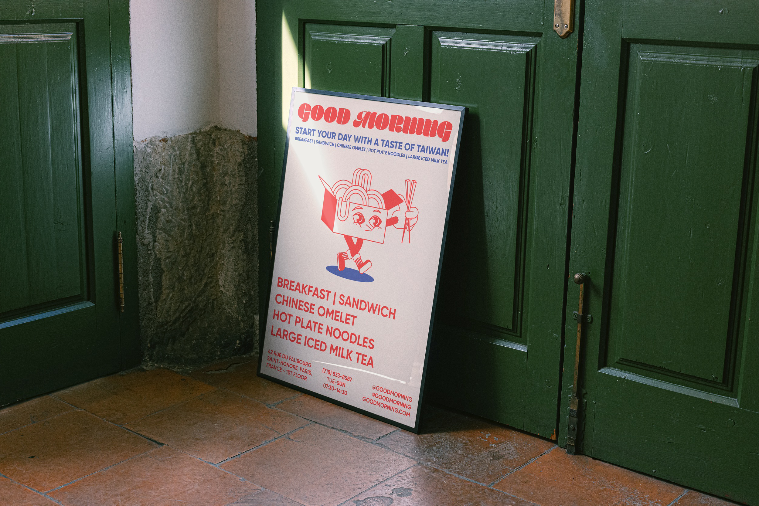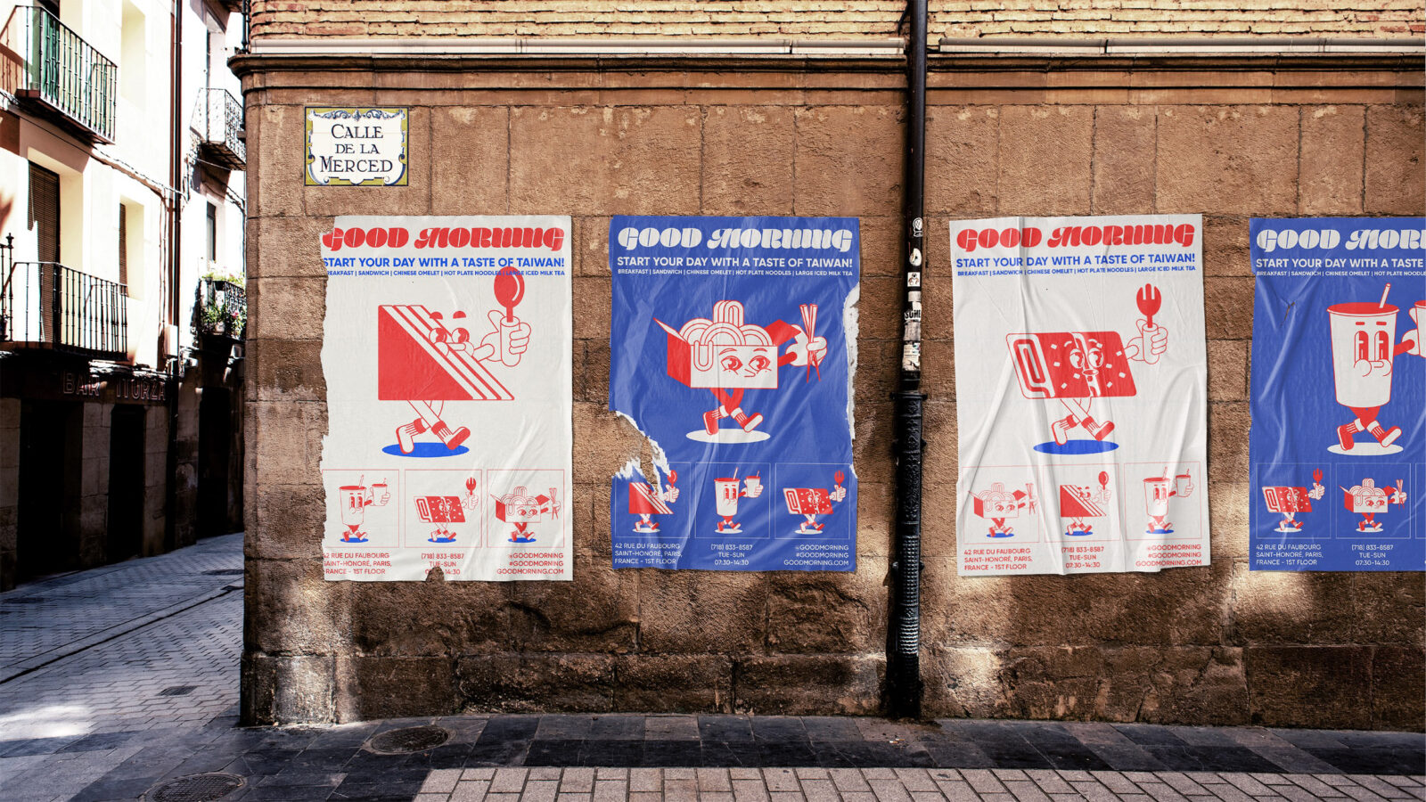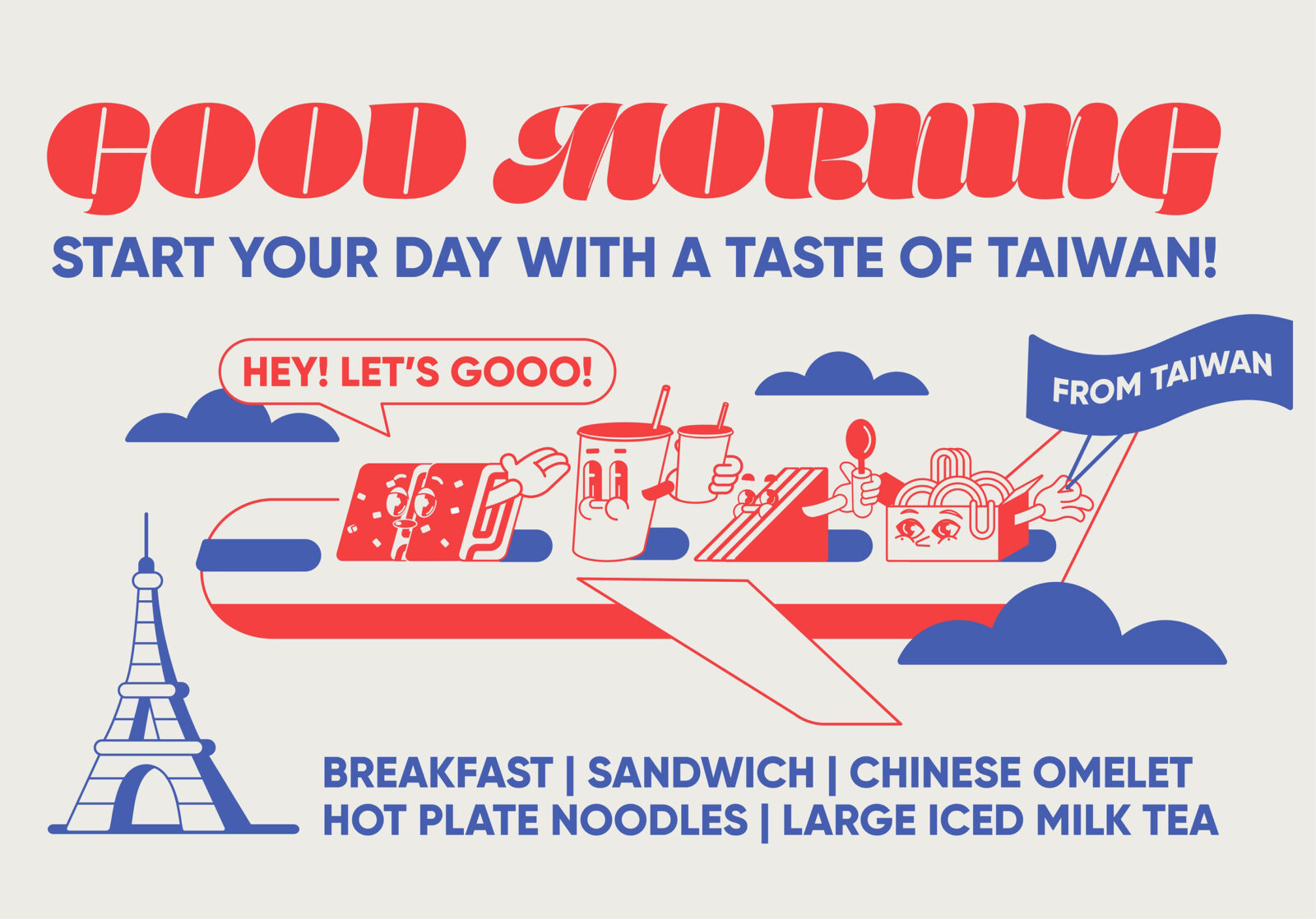 Good Morning is a fictional Taiwanese breakfast brand concept set in Paris, thoughtfully designed to fuse the visual and cultural identities of both Taiwanese and French cultures. The brand identity draws from the shared color palette of the two nations—red, blue, and white—creating a symbolic and aesthetic bridge between East and West, while reflecting the vibrancy of both food and community.