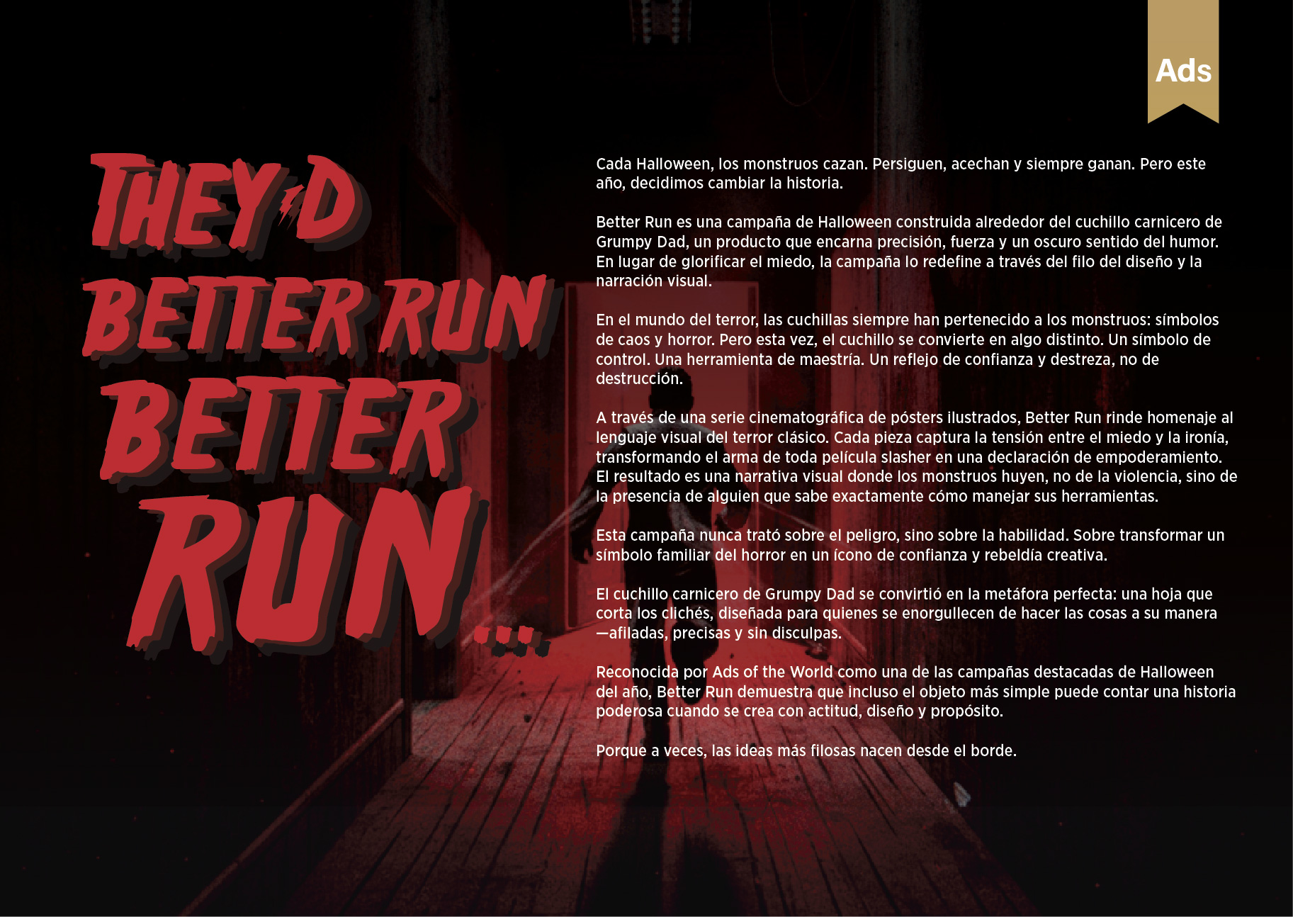 Rather than relying on traditional product advertising, Better Run positions the knife as a cultural icon. The exaggerated fear of the monsters amplifies the product’s strength and sharpness without the need for explicit claims. Humor replaces intimidation, nostalgia replaces shock, and design becomes the primary storytelling tool.