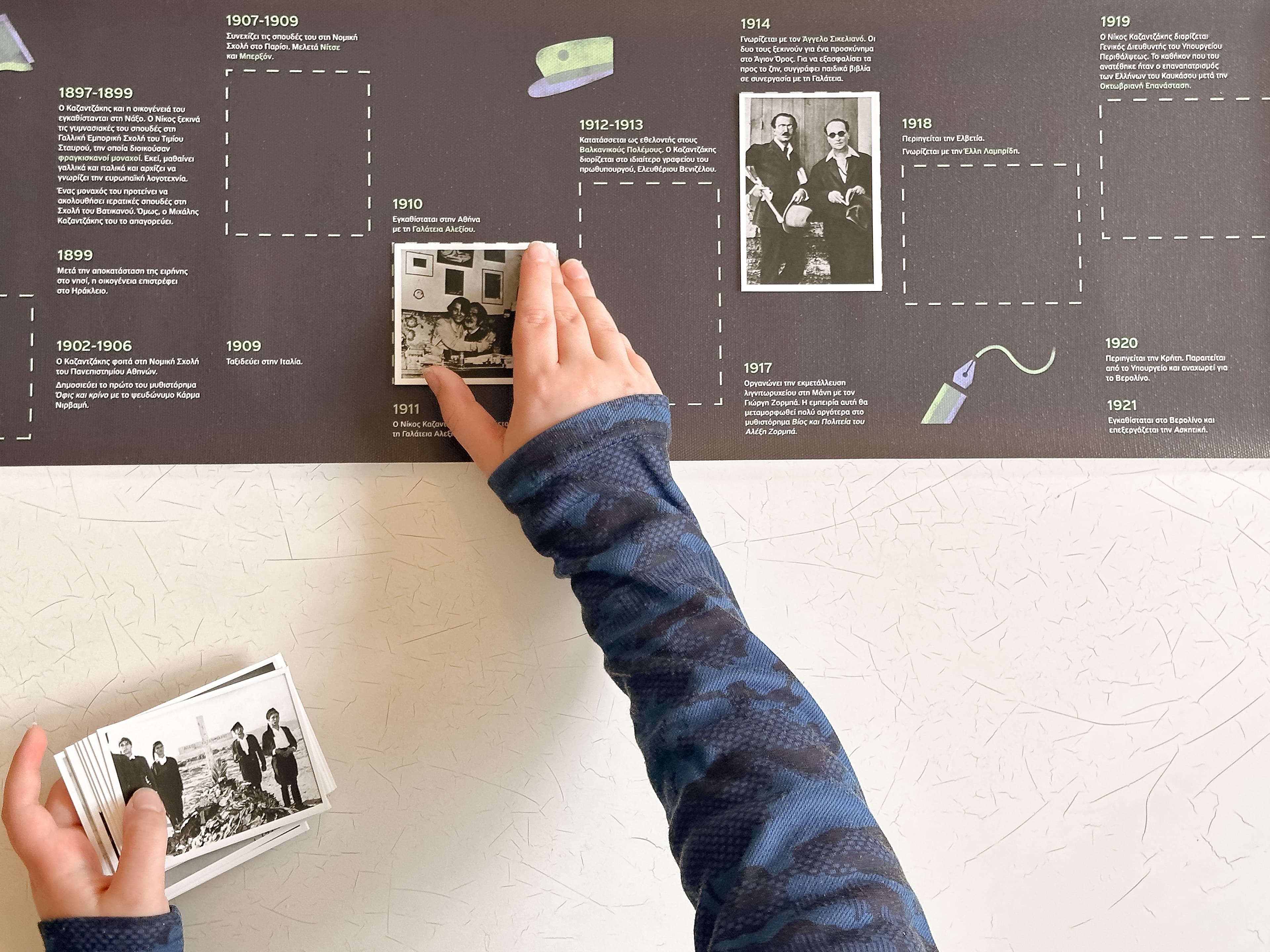The materials of the kit including wood, fabric and paper, were carefully selected to evoke a sense of authenticity and tactility. Combined with replicas of personal objects belonging to Kazantzakis, the kit invites students to explore his world through a tactile and immersive learning experience.