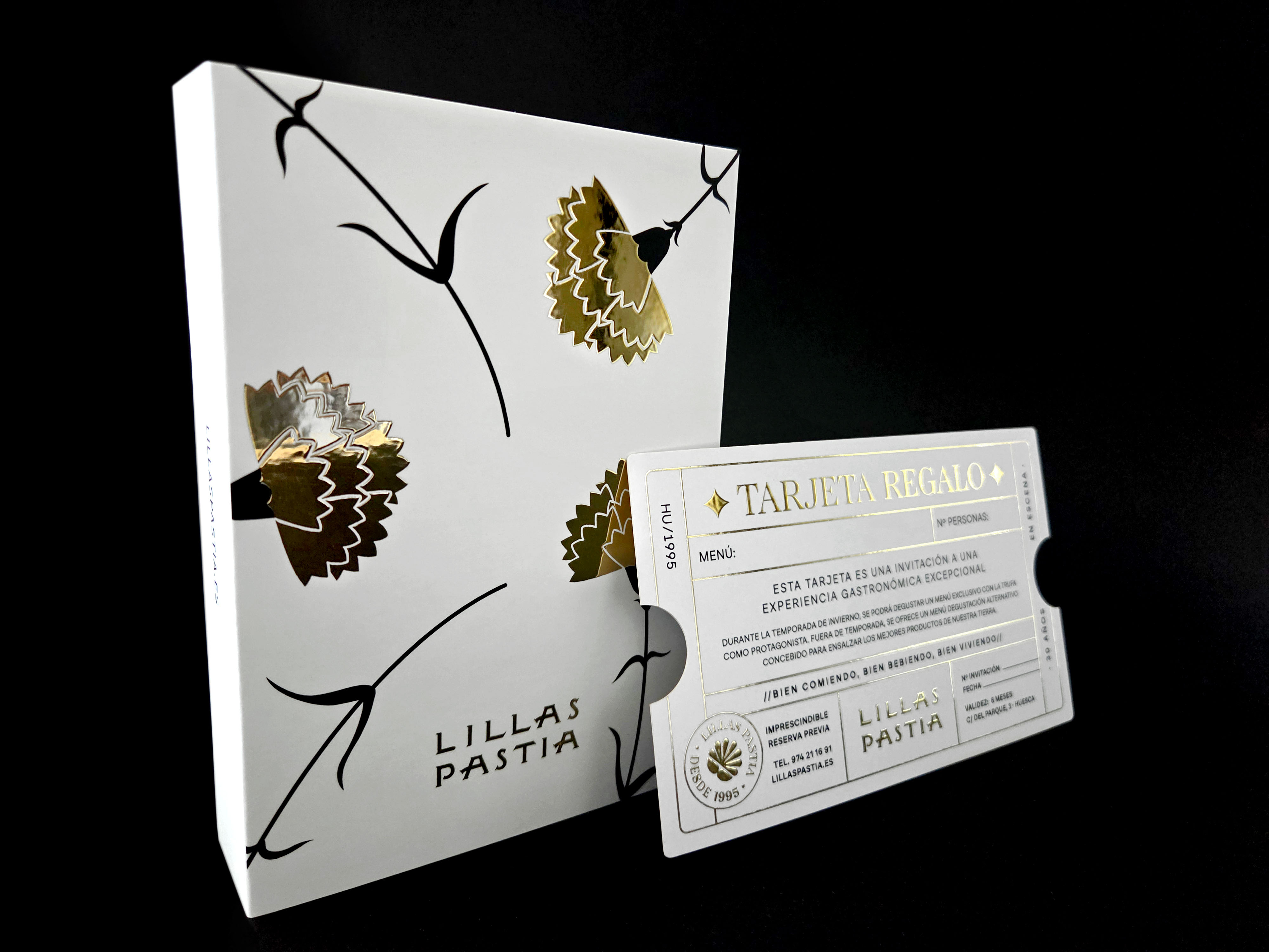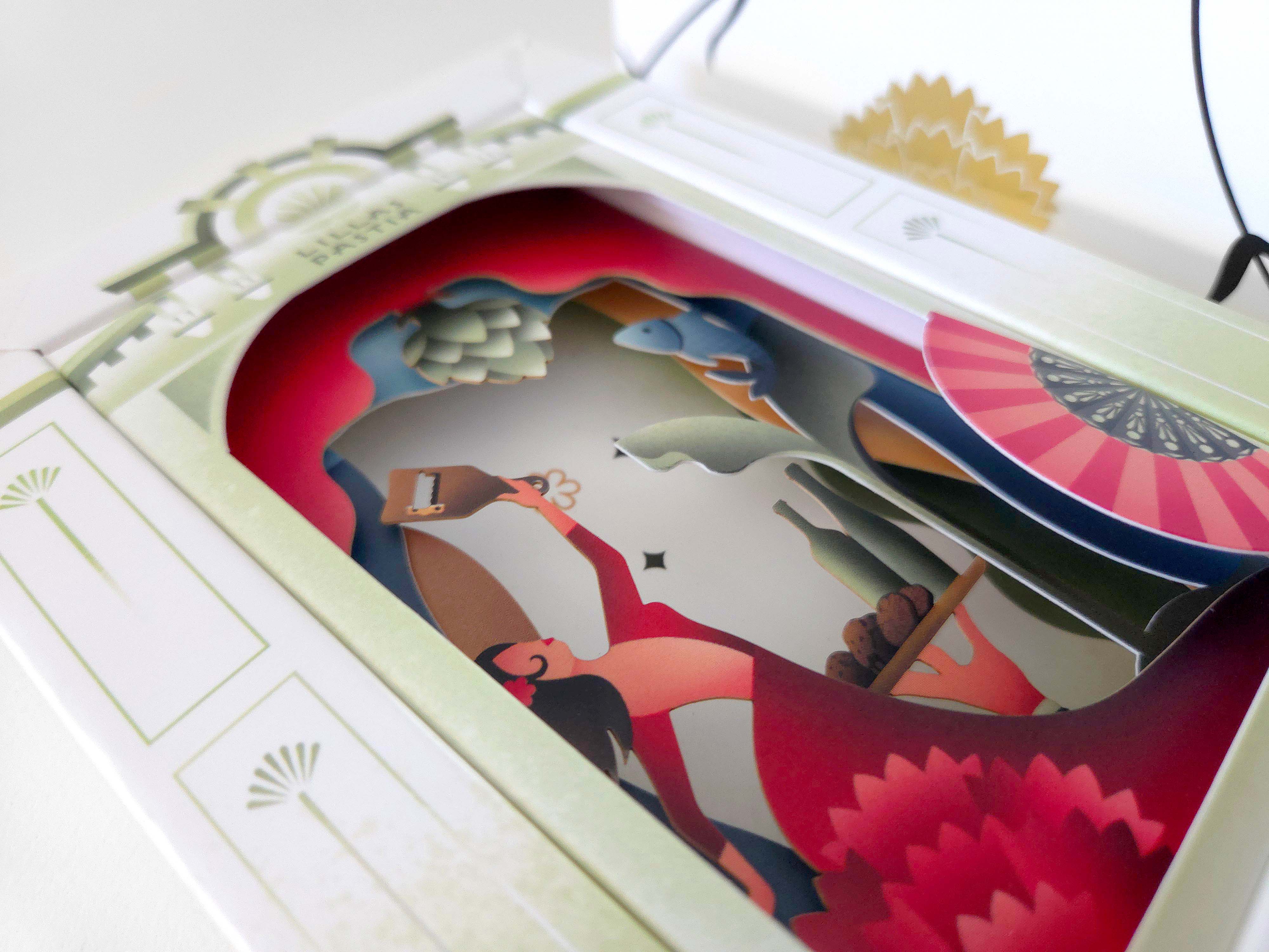 The exterior of the box features the façade of the former Casino of Huesca, the restaurant’s home for 29 years and a key part of its memory and legacy. Once opened, the box unfolds through a sequence of die-cut layers that reveal different scenes, much like stage sets in a theatre. In some of them, Carmen appears dancing with a truffle slicer, blending operatic drama with culinary symbolism. In others, emblematic ingredients of the cuisine emerge (such as artichoke or fish) paying tribute to the product-driven philosophy of the restaurant. Another layer reveals the hand of the tavern keeper Lillas Pastia himself, holding truffle, the restaurant’s star ingredient, alongside wine.