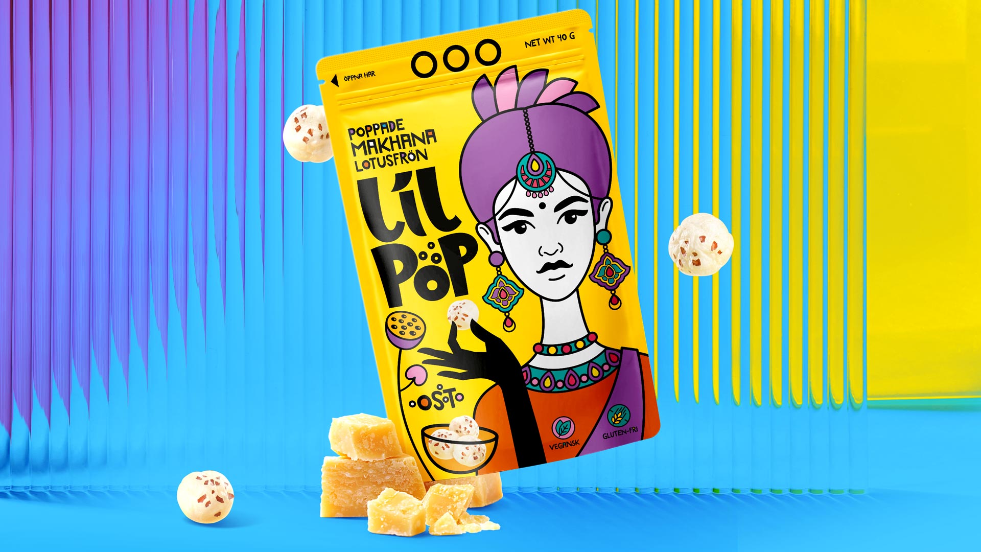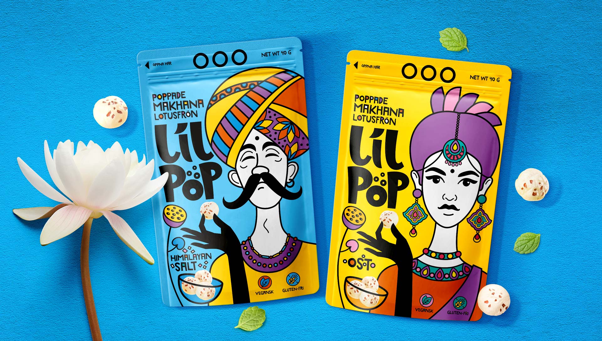 Our agency was commissioned to create packaging for LilPop, a new brand specializing in makhana — traditional Indian popcorn made from water lily seeds. The goal was to design bold and eye-catching packaging that highlights the product’s Indian heritage while appealing to the Swiss market.