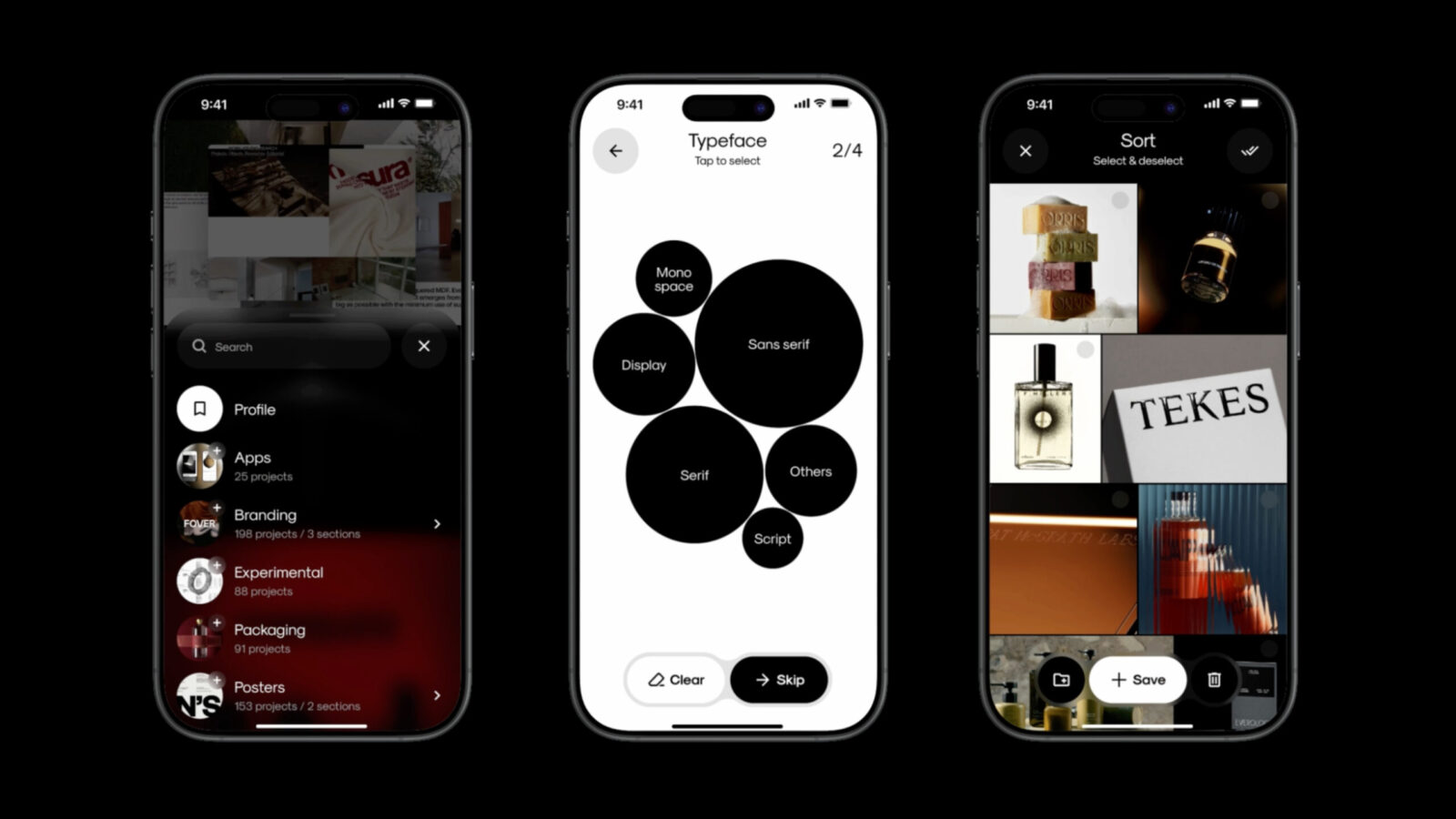 The app includes smart filters for typography, color, style, and category, making it easy to find exactly what you’re looking for. Its interface also changes depending on how you use it: when no filters are applied, it stays black; when filters are on, it turns white, offering a subtle visual cue.