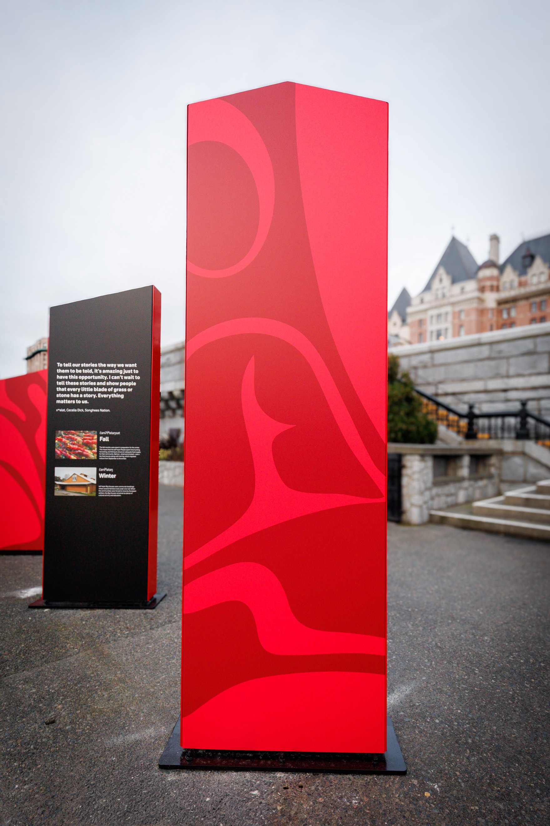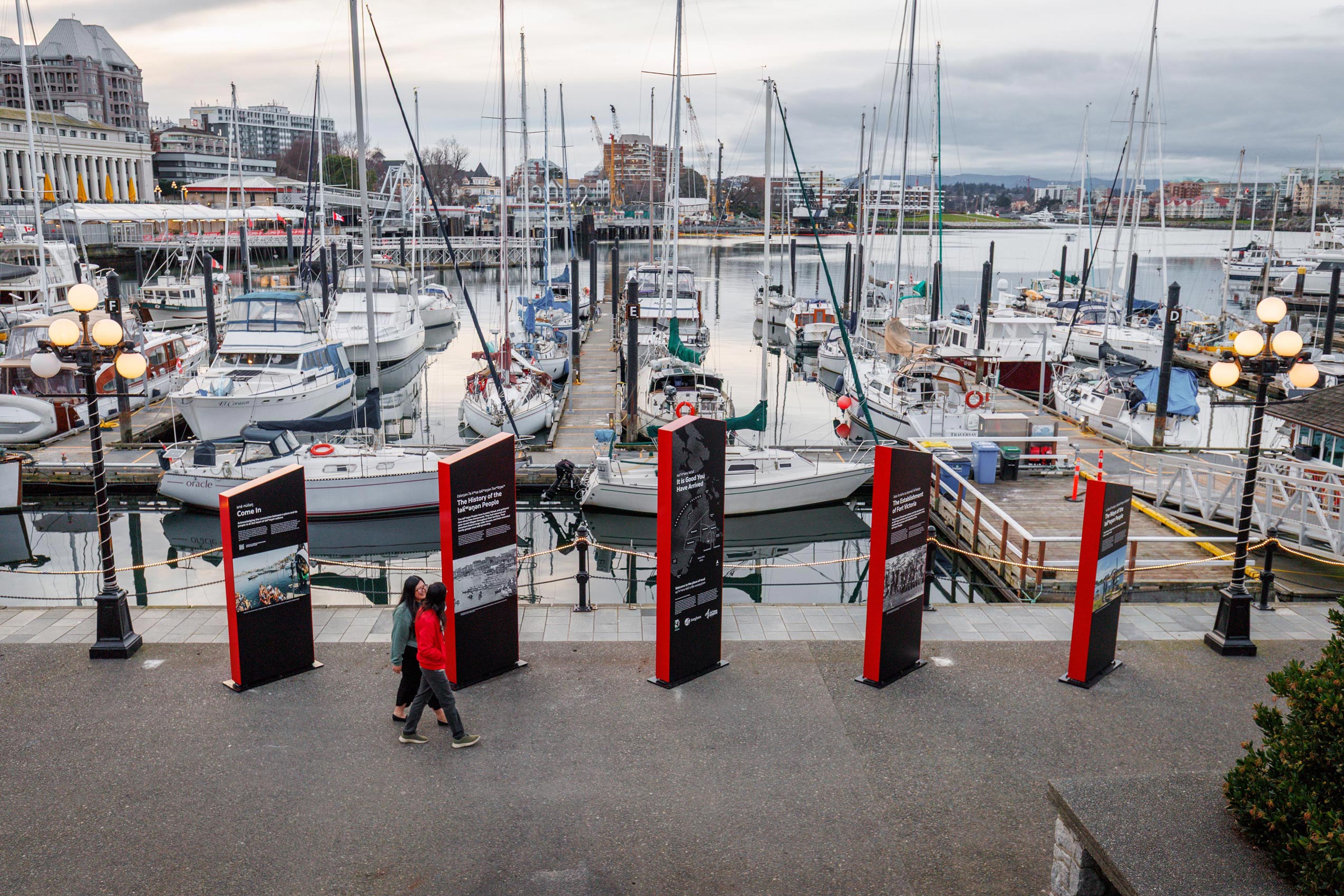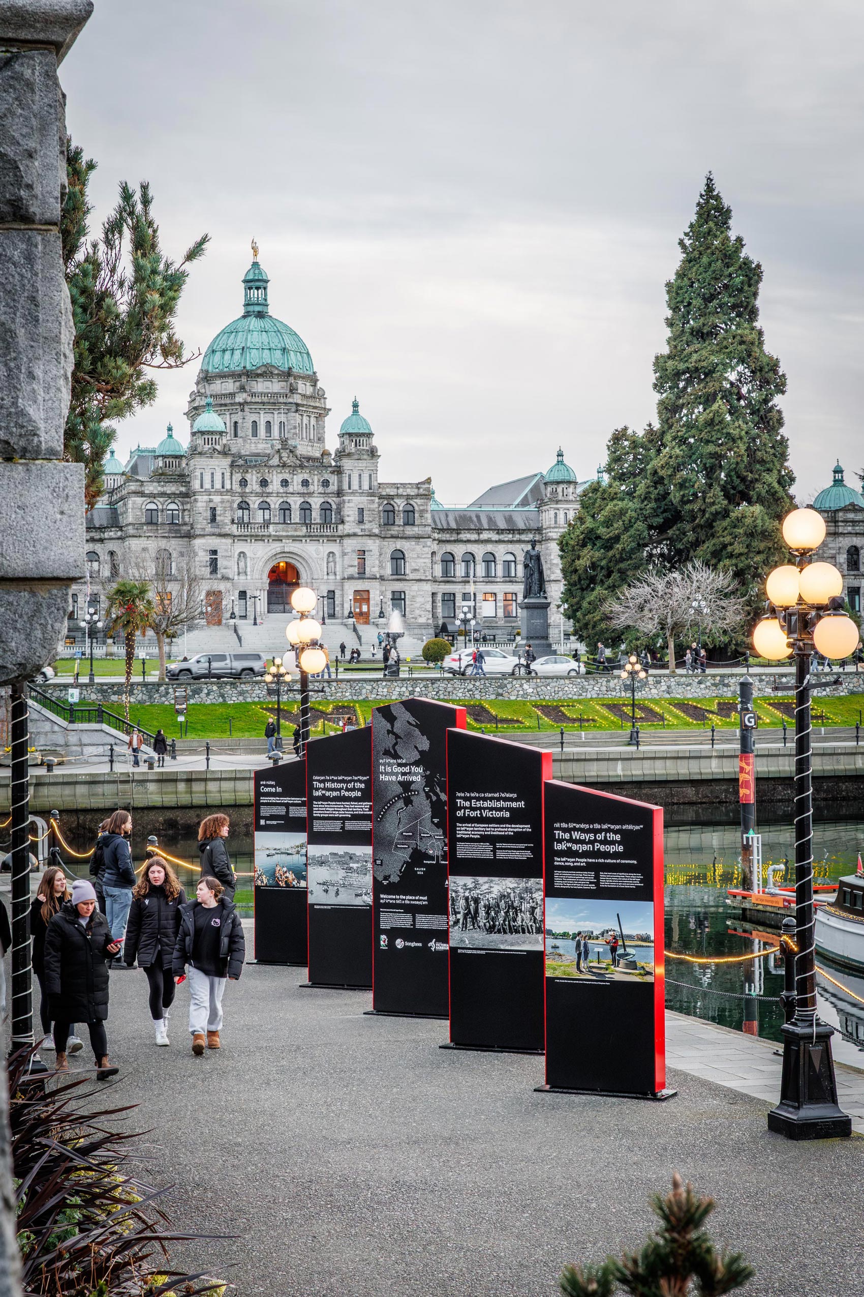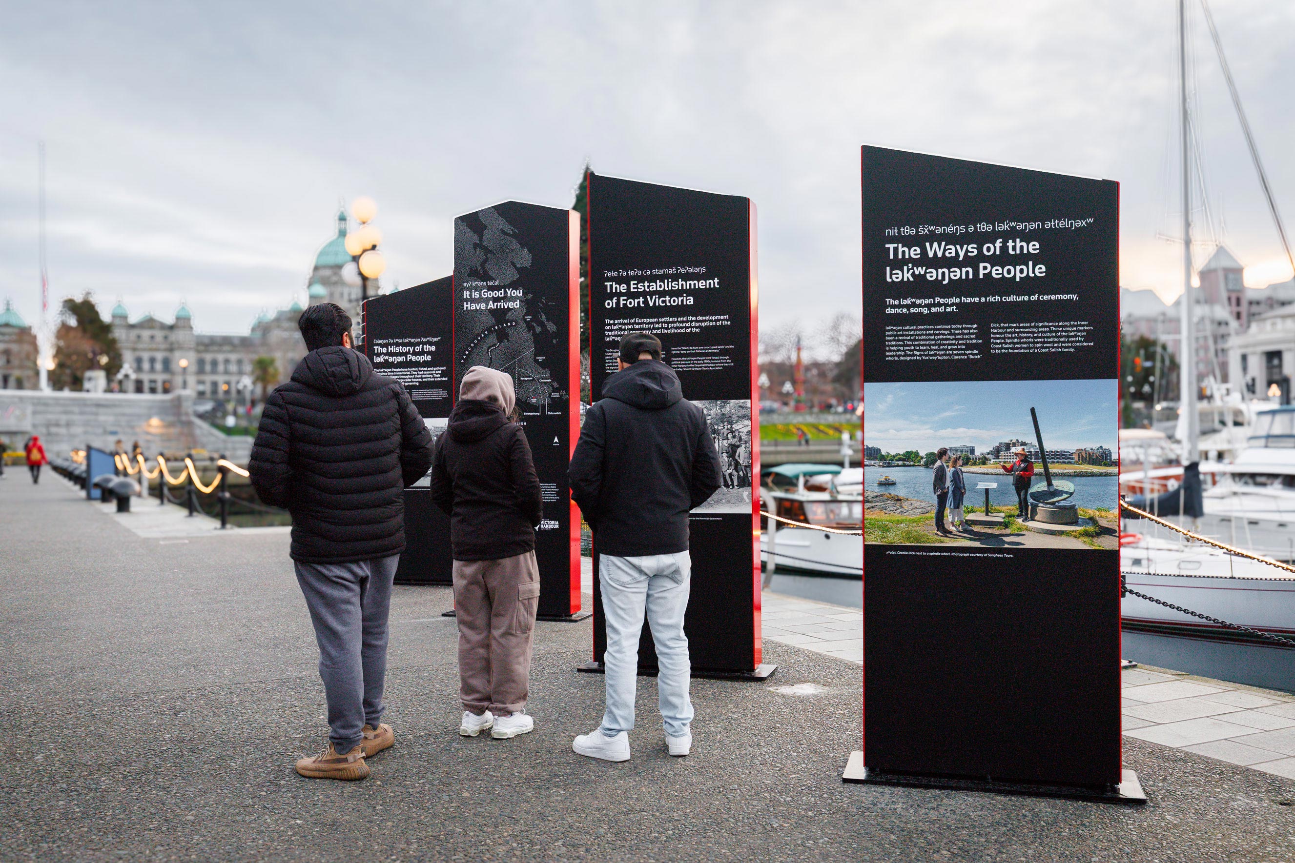 The purpose of this placemaking project was to centre the lək̓ʷəŋən People, their language, their history, their relationship to the land and water, and their vibrant, ongoing culture. The interpretive panels, developed in close collaboration with both Nations, tell these stories in their own words and on their own terms. The panels highlight the lək̓ʷəŋən language, pre-contact history, the arrival of the Hudson’s Bay Company and the building of Fort Victoria in 1843, and the Nations’ enduring living culture of ceremony, dance, song, and art, transforming a high-traffic public space into a place of cultural education, reflection, and recognition.