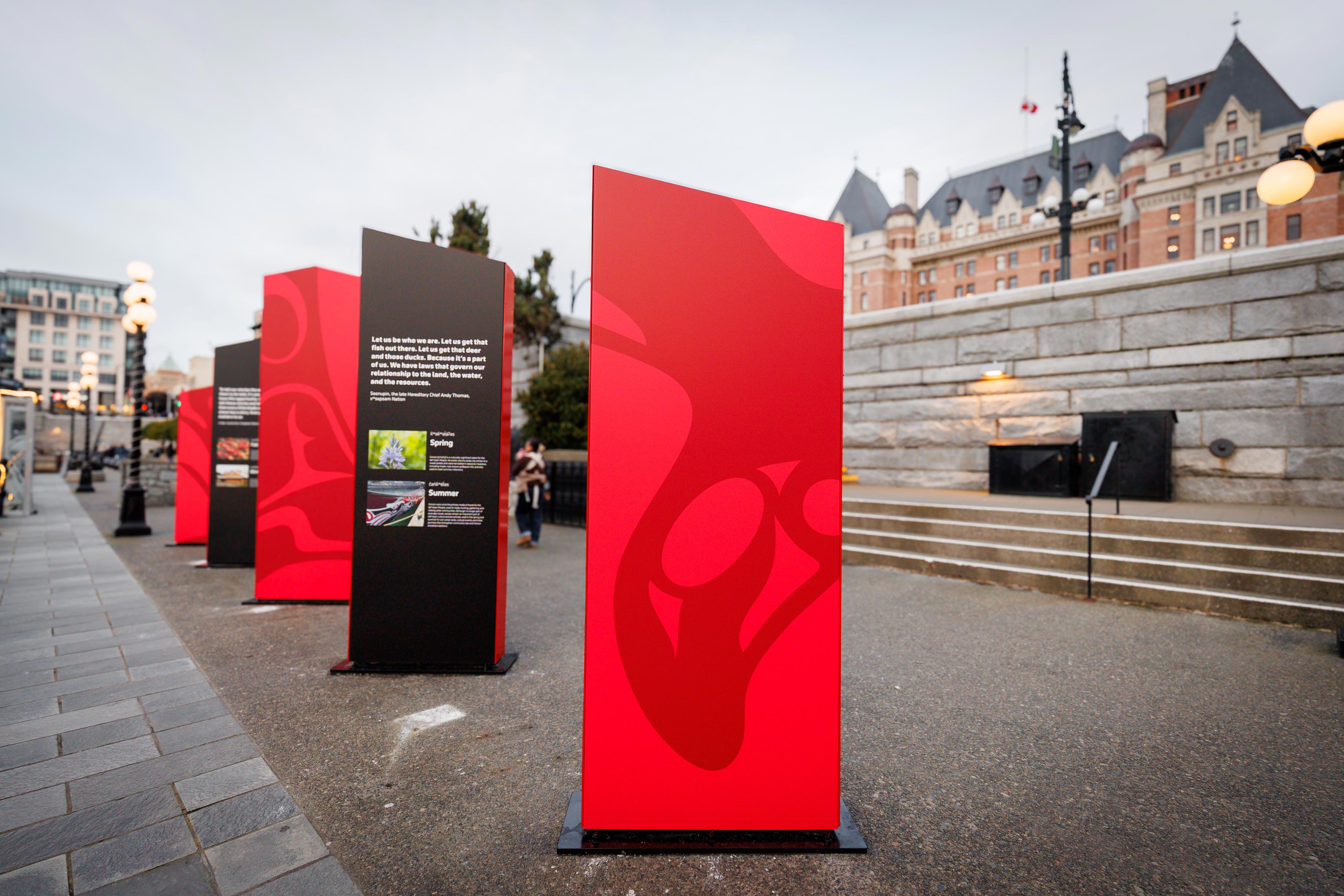 The placement of the five structures on the Lower Causeway is intentional and poetic. By bringing the silhouette of the Big House back to this waterfront, the installation asserts the continued presence and living culture of the lək̓ʷəŋən People on their traditional lands, in a space that millions of residents and visitors move through each year. Oriented to engage pedestrian movement and sightlines toward the harbour, the installation creates moments of reflection along the waterfront. And the repetition of form establishes rhythm and presence without overwhelming the space, allowing the structures to assert visibility while maintaining permeability and openness.