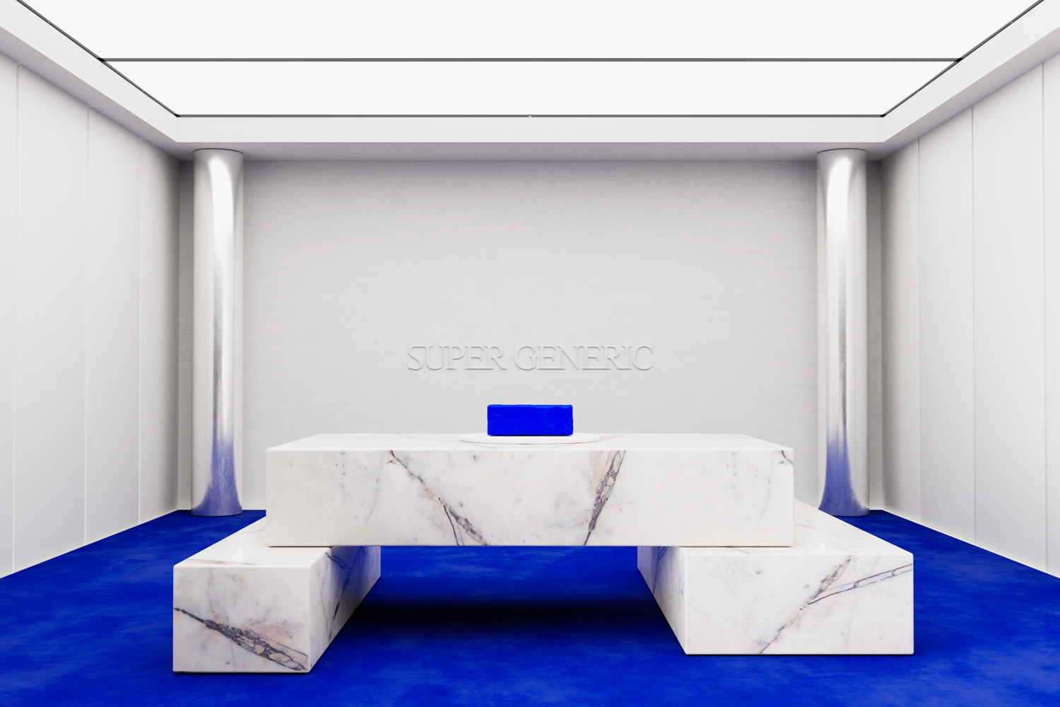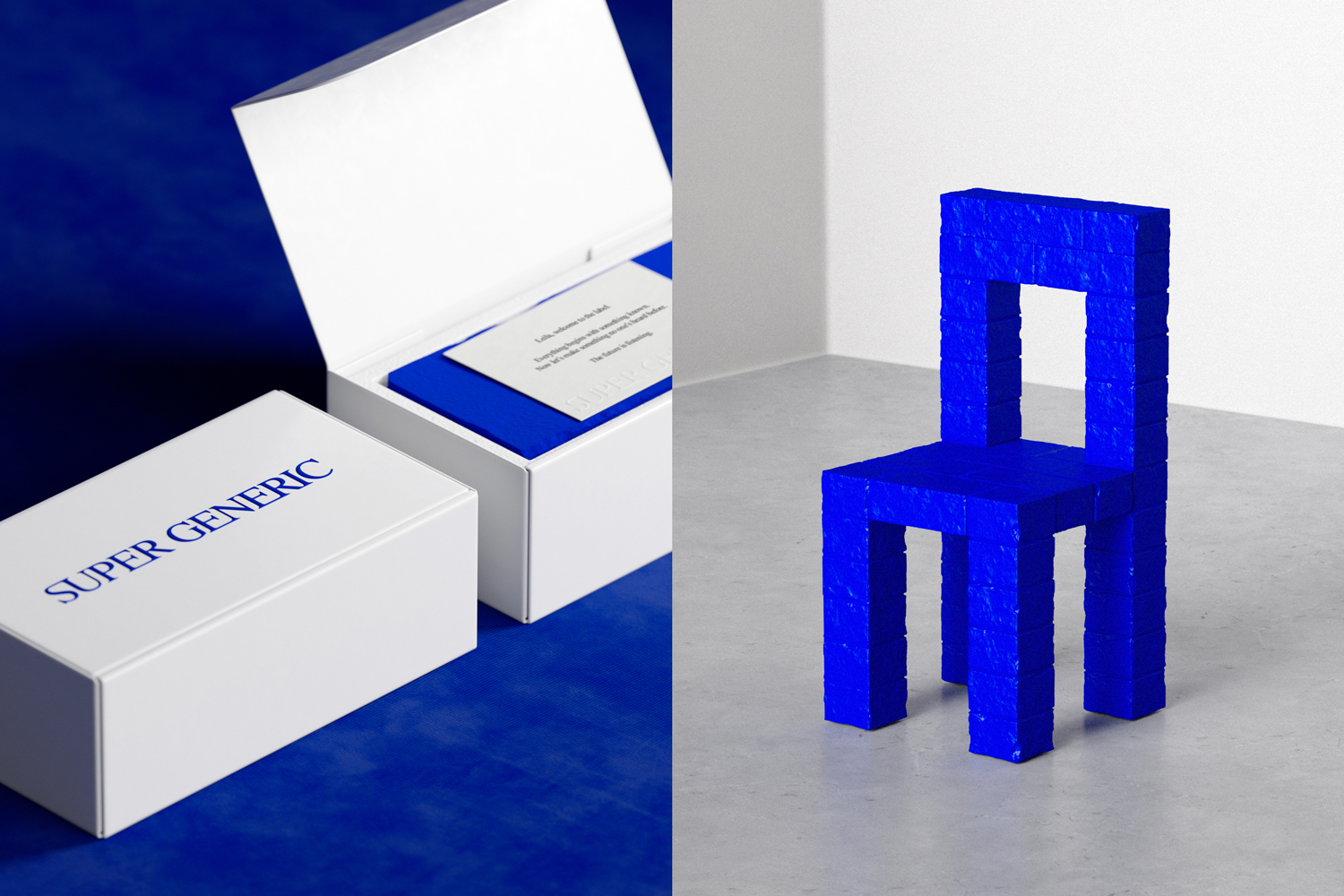 The colour palette follows the same tension. We were drawn to electric blue not only for its intensity, but for its history: for centuries, blue was notoriously difficult to produce. With no easy natural pigments, it became rare, expensive, and symbolic of value and power – hence Royal Blue. Klein’s work in the 1950s shifted that, driven by a mission to find the perfect blue. Today, blue is taken for granted – cheap, digital, available in a tin from B&Q. That contradiction is exactly what interested us: something once precious, now overlooked. In SuperGeneric, electric blue is used as a deliberate disruption – a mark of superness. Applied with restraint, each time it appears is intentional, charged, and expressive. Set against a bright, neutral monochrome palette, it punches through, much like how Klein’s blue behaves in an art gallery.