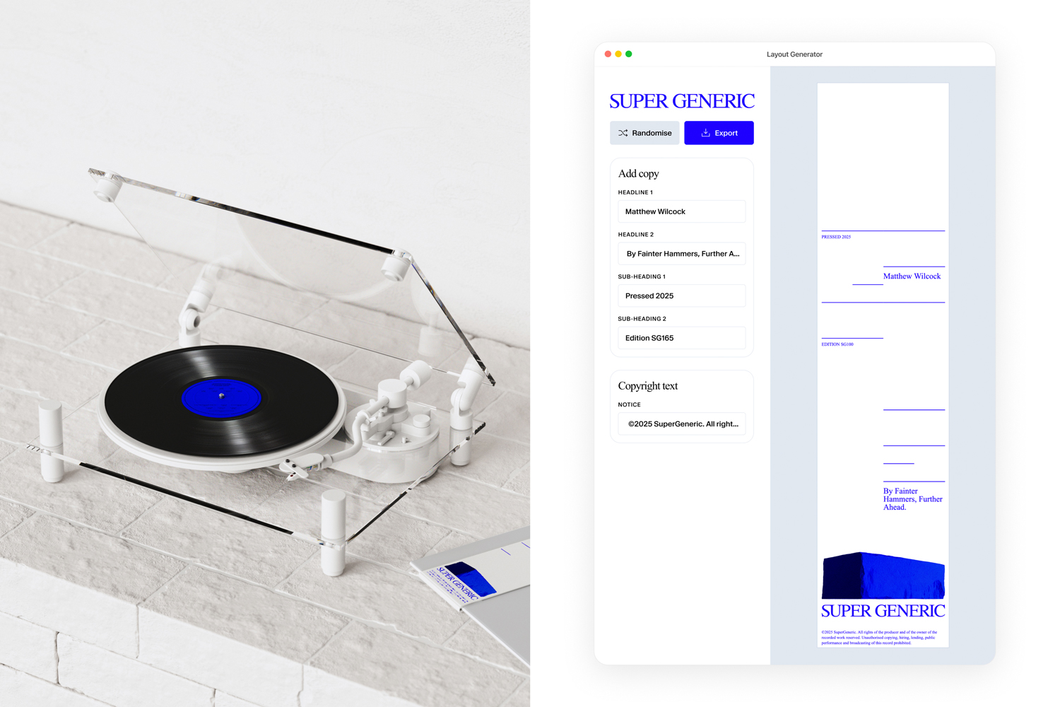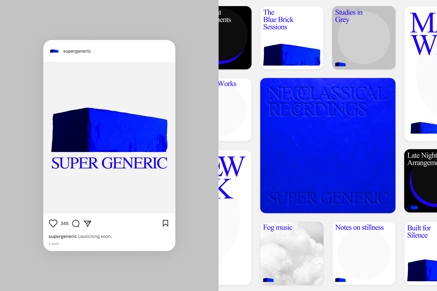 SuperGeneric is a neoclassical record label built to put art and artists first. It sits at the intersection of the classical and the contemporary – championing musicians who blend timeless instrumentation with experimental, electronic, and ambient forms. The label’s sound lives in contrast: natural and artificial, orchestral and synthetic, restrained and expressive. The name became the concept for the identity itself, rooted in a single design principle: make the generic, super. Rather than inventing an elaborate mythology, the work leans into familiarity – default materials, default typographic codes, default cultural objects – then pushes them until they feel charged with meaning. The result is a visual system that bridges past and future, framing the genre as both rooted and radical, serious but not precious.