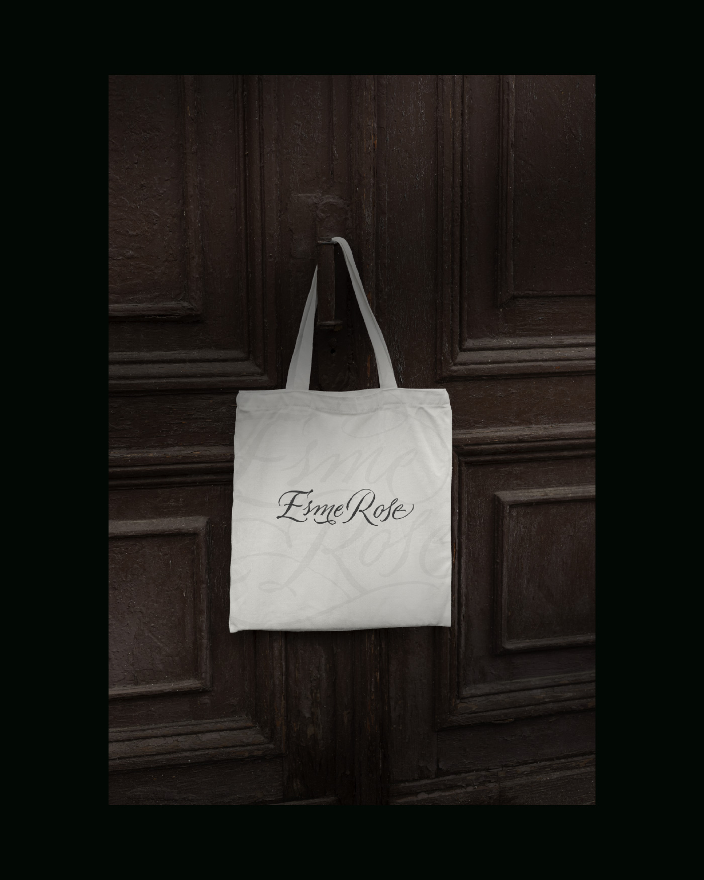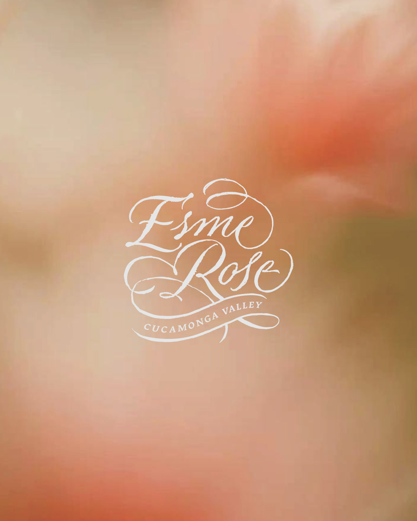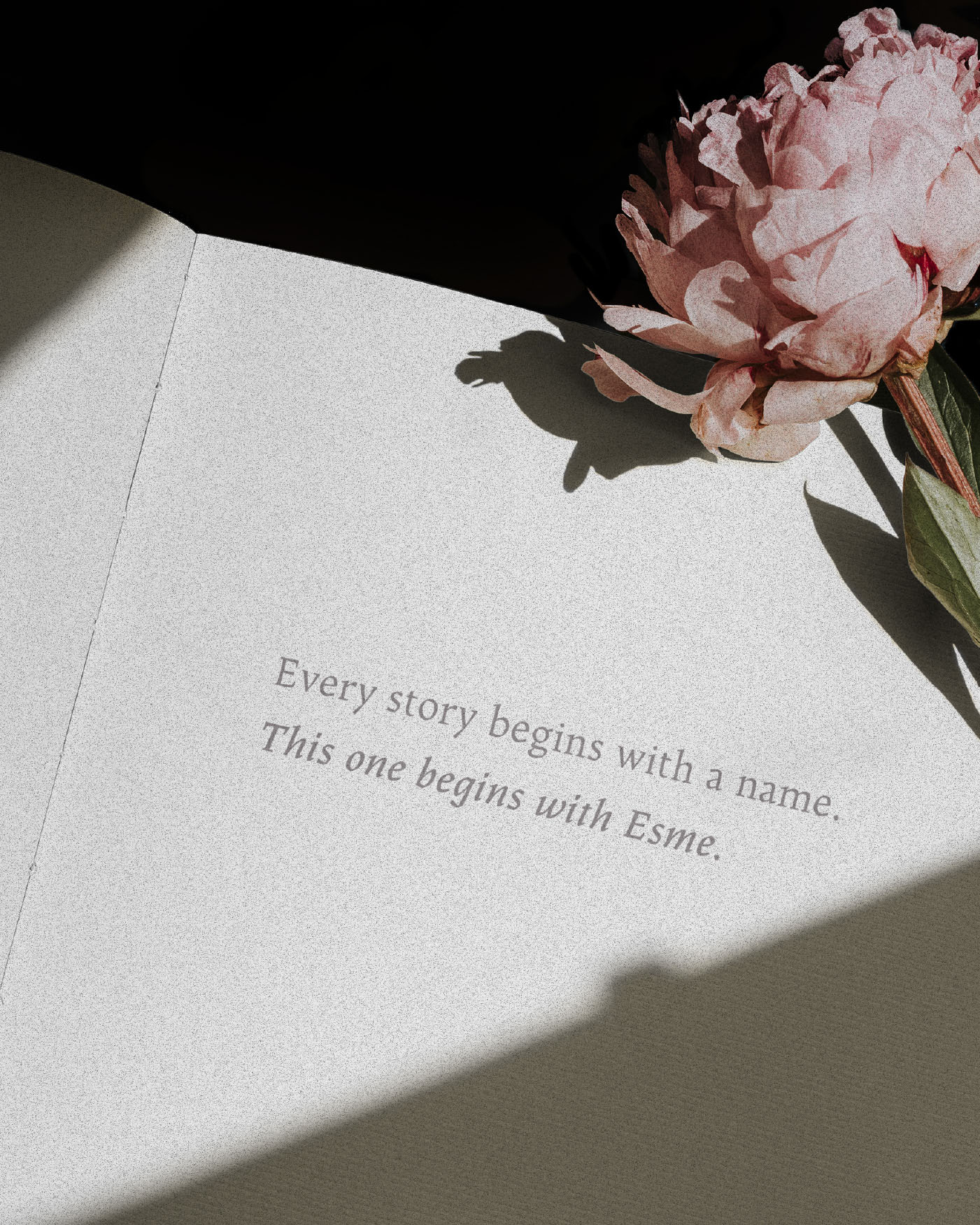 At the center of the composition is the name “Esme”, written in a delicate calligraphic script that conveys personality and warmth. The typography becomes the main expressive element of the label, balancing elegance with a sense of softness and affection.
