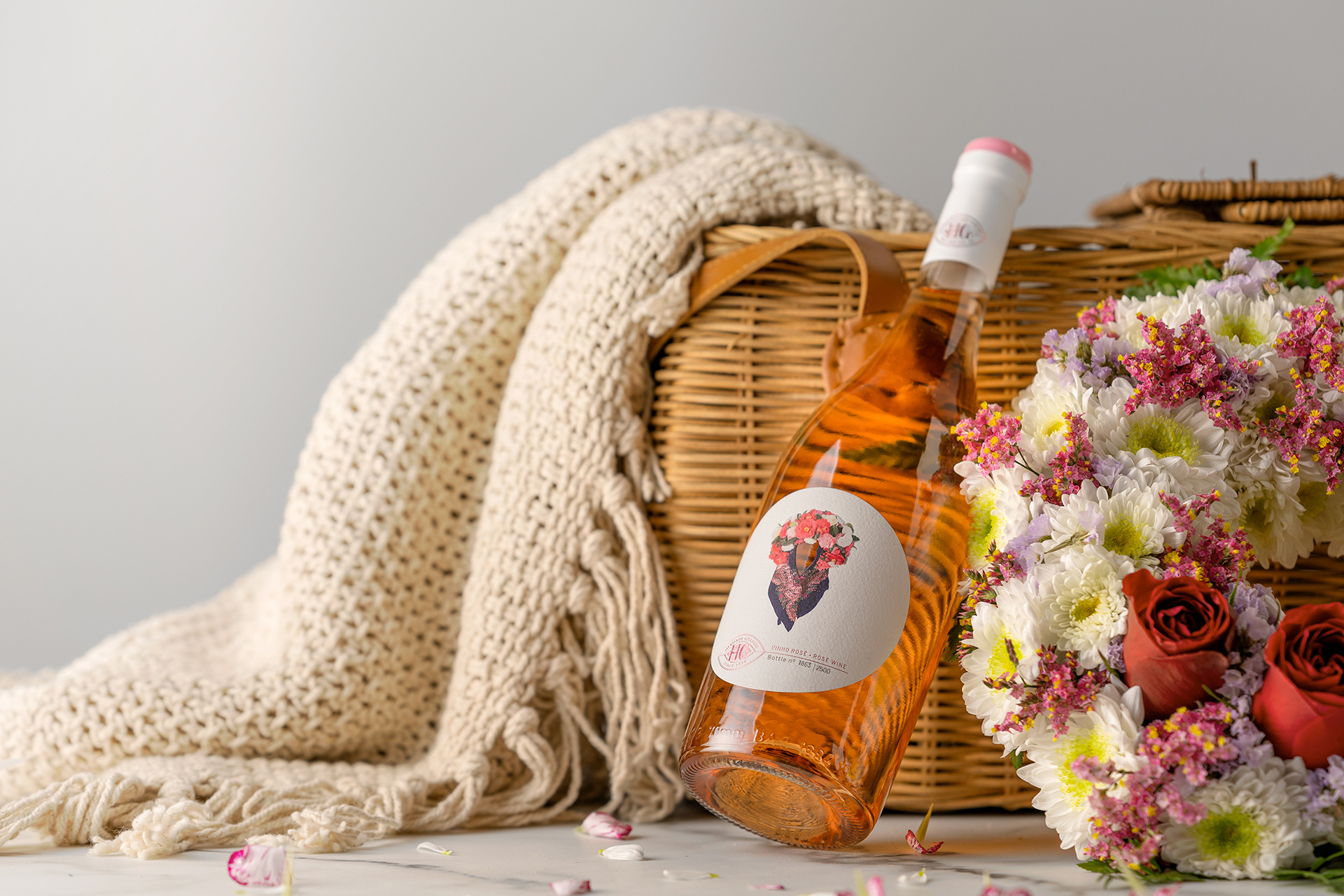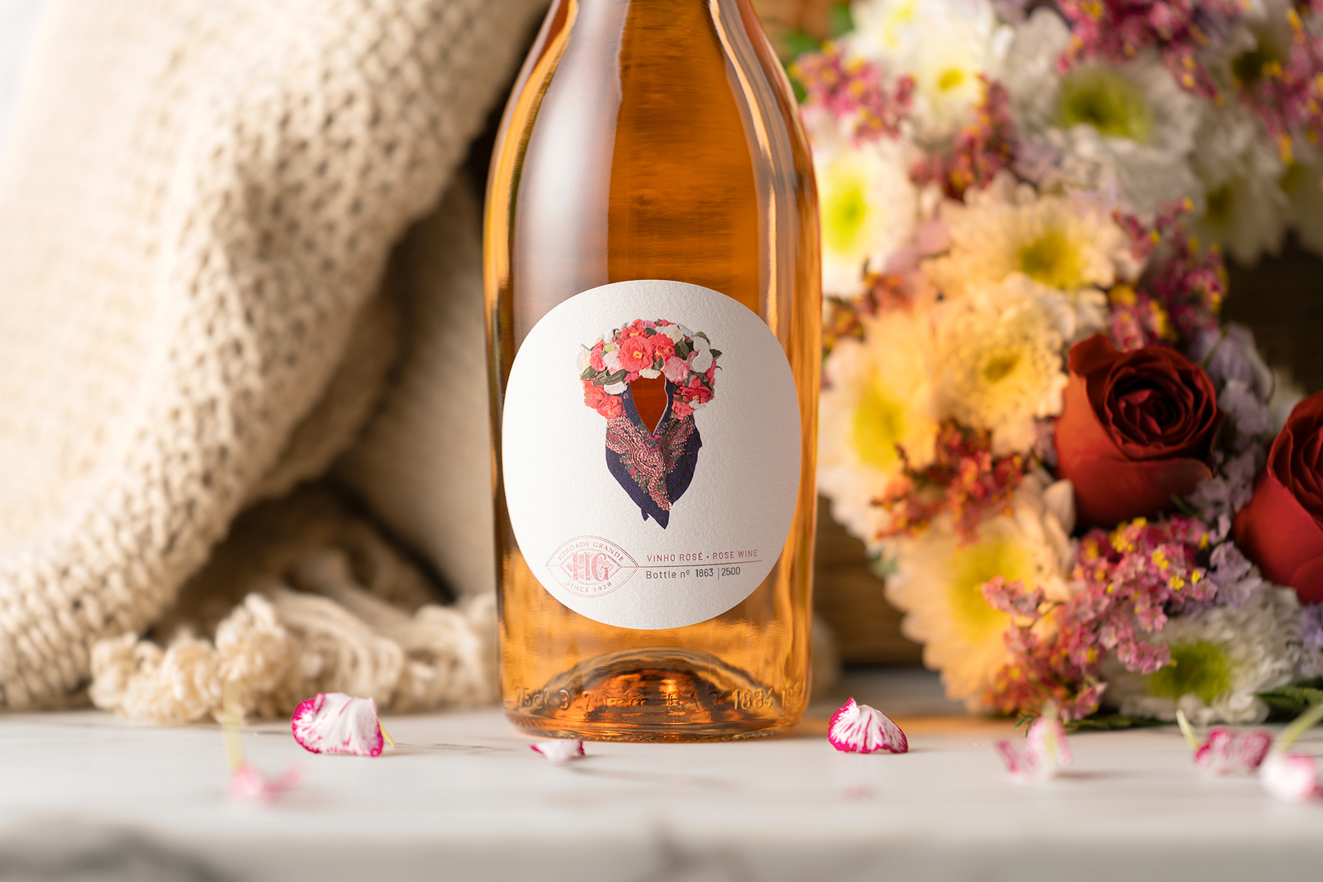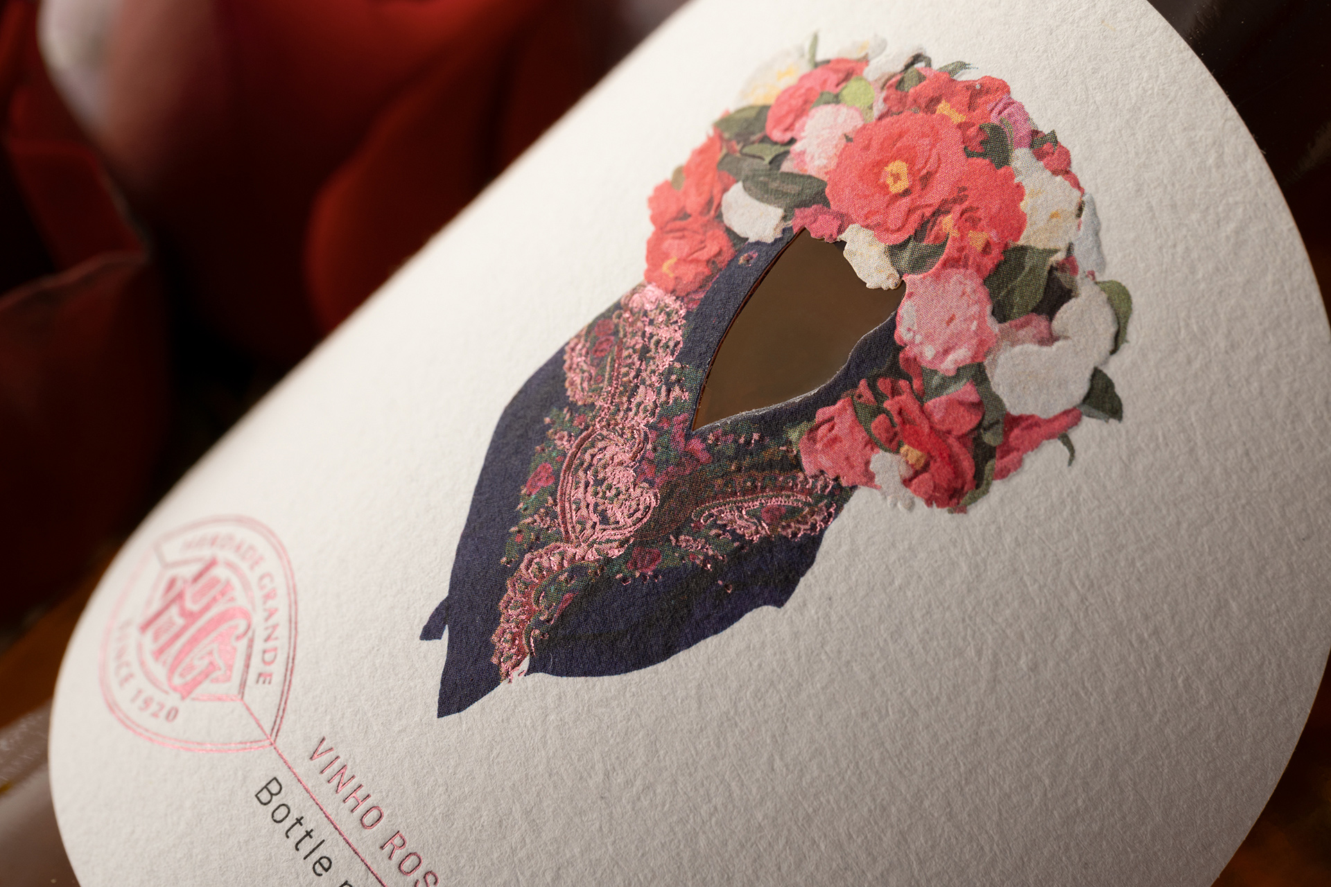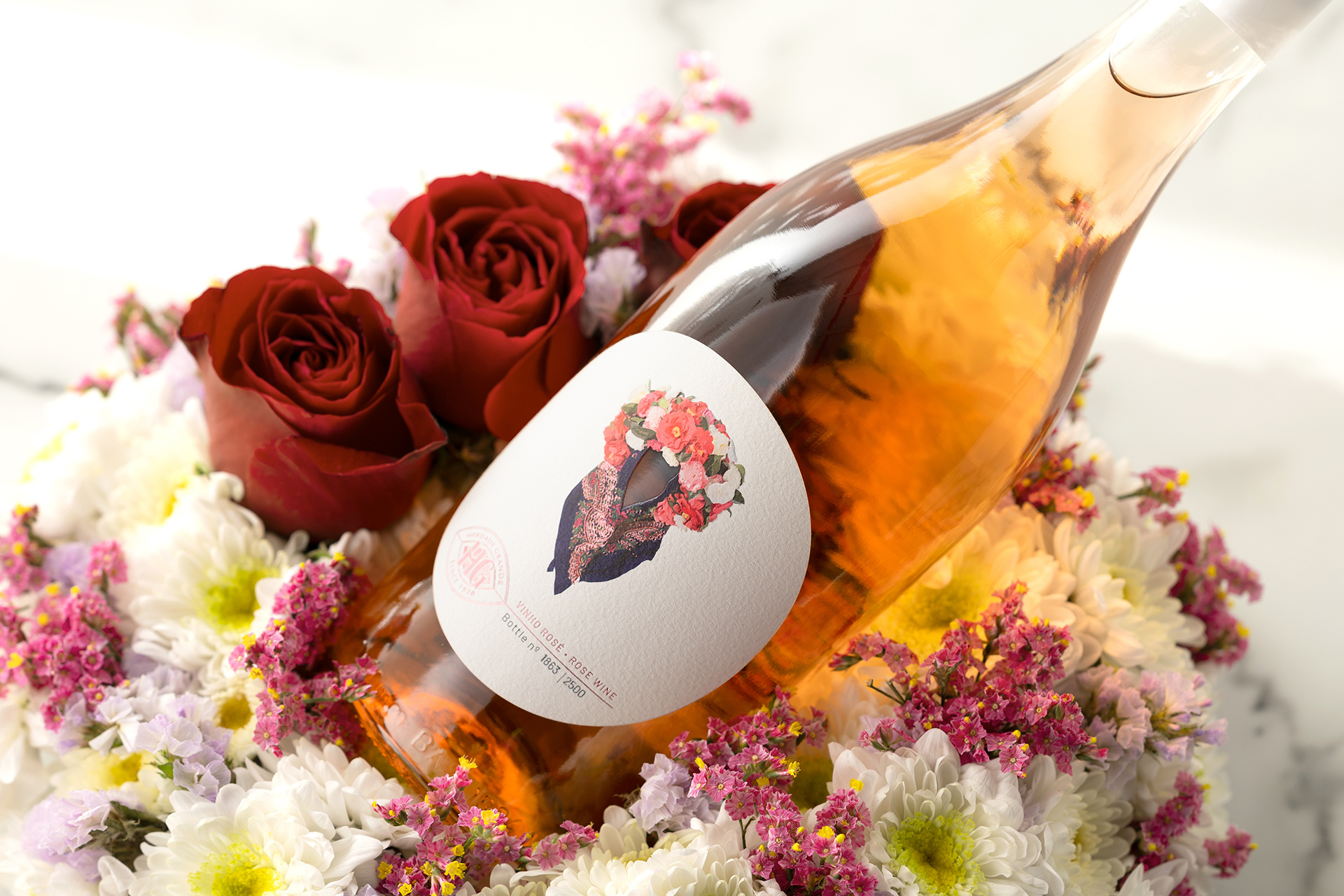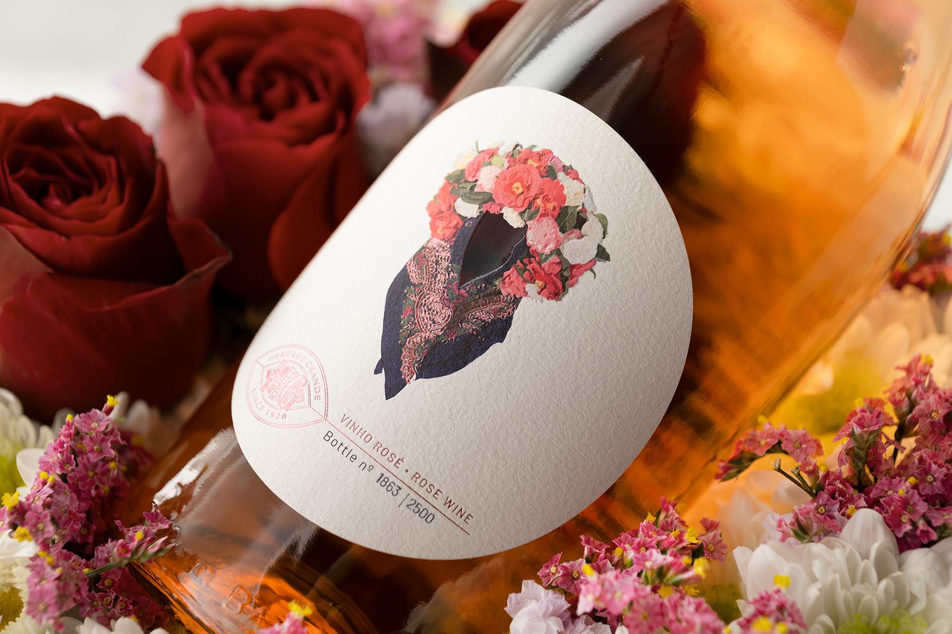 The color palette, while restrained at its base, bursts into life within the illustration, creating a deliberate contrast between sobriety and expression. It is precisely within this balance that the concept of “less is more” is realized: every element has a purpose, every color carries meaning, and nothing is excessive. The translucent glass of the bottle complements this approach, allowing the rosé hue of the wine to interact with the label design and enhance the overall visual experience.