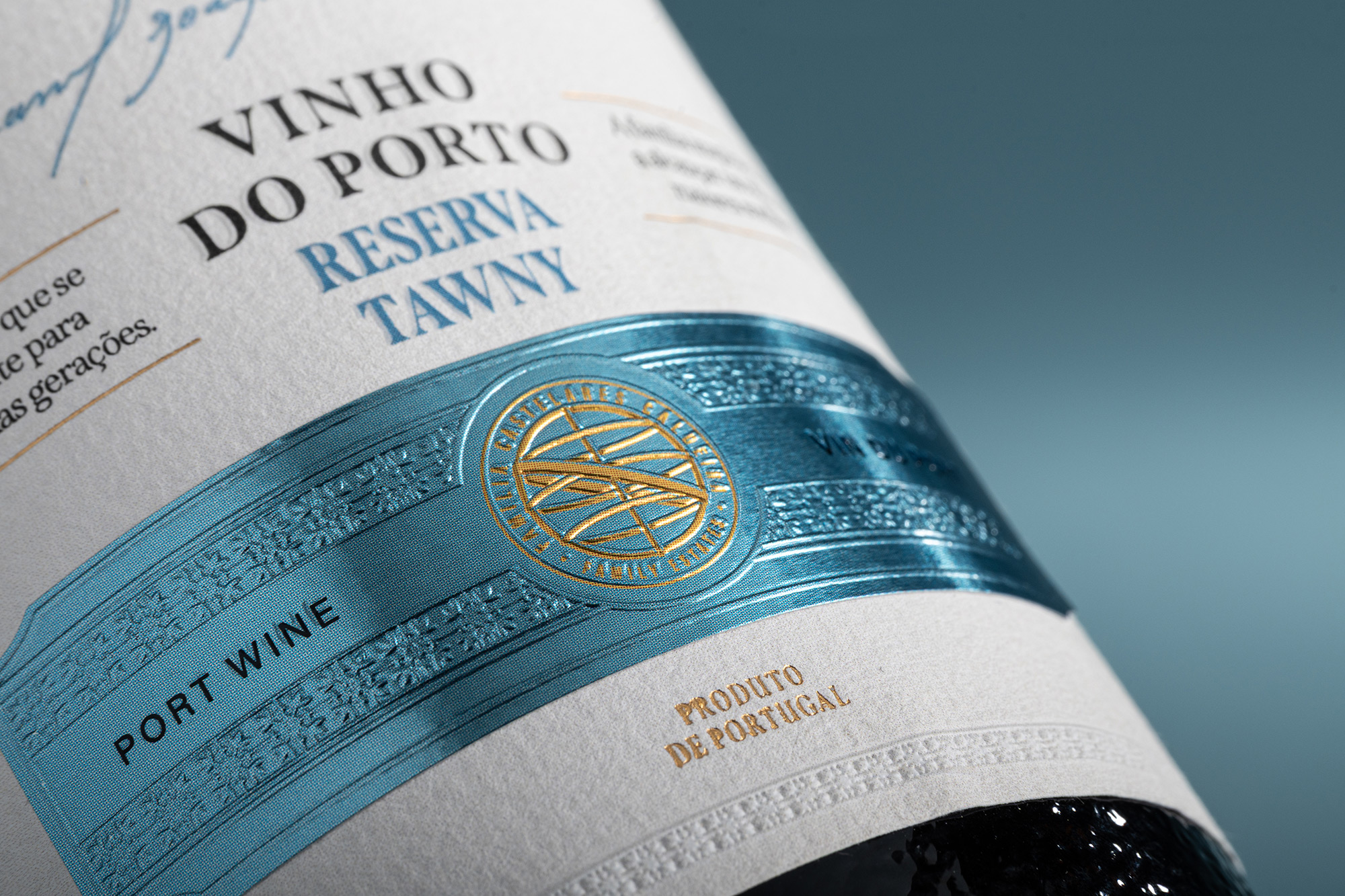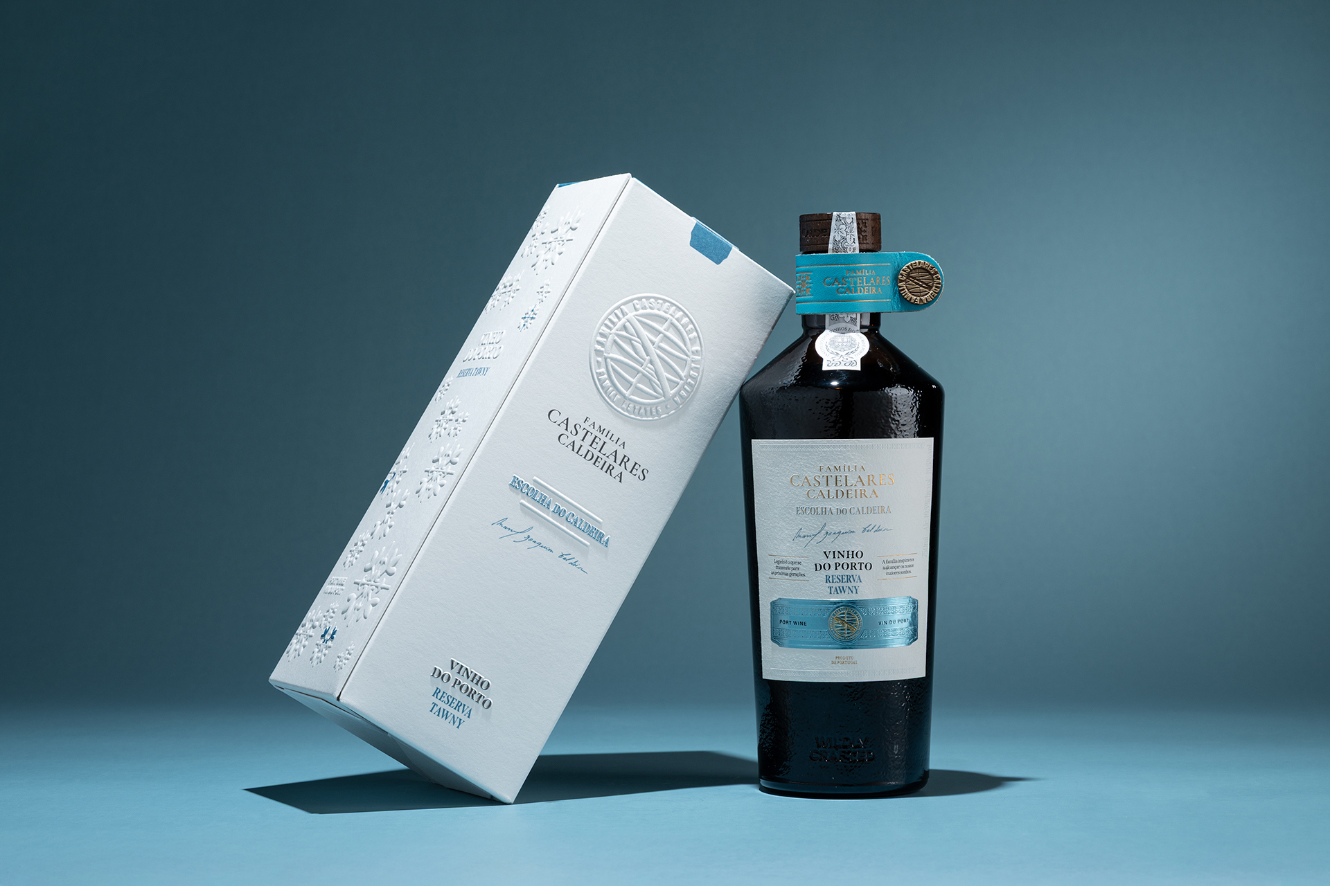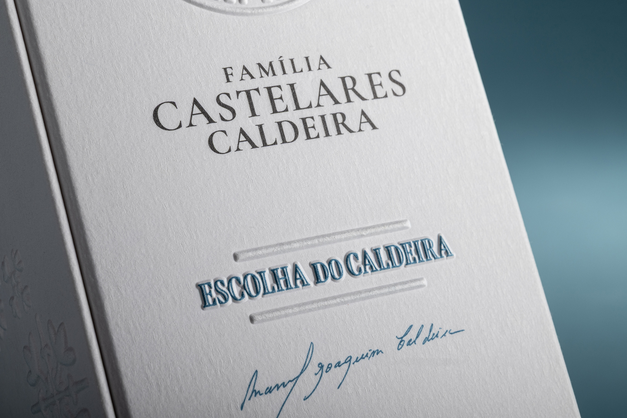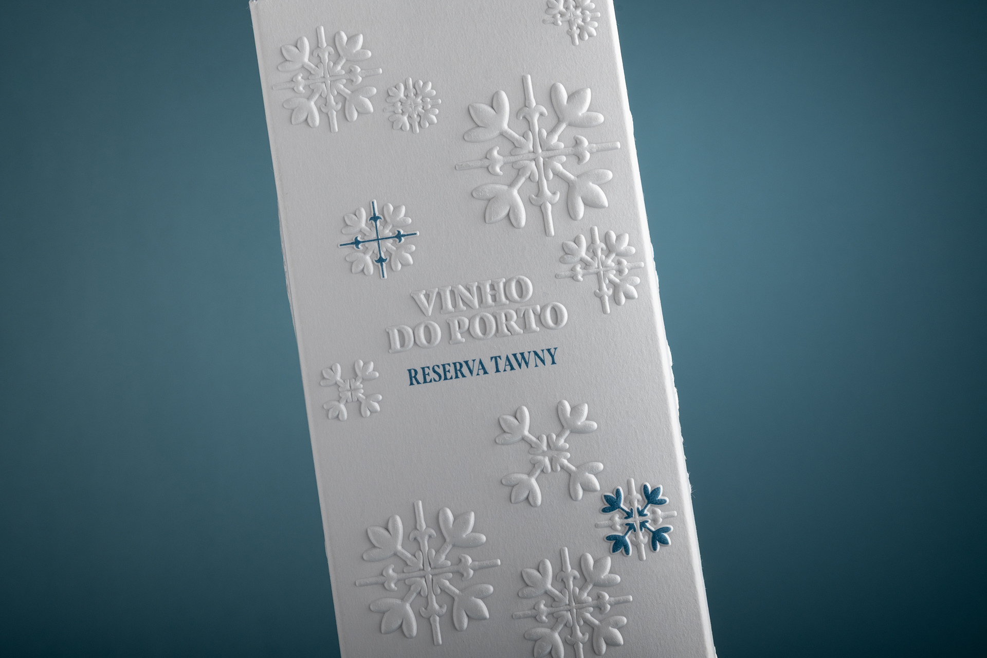 The subtle interplay between matte white embossing and selective blue ink detailing adds both visual depth and quiet refinement. This contrast enhances the sense of craftsmanship and attention to detail, qualities that are inseparable from the tradition of high-quality wine packaging. The design speaks softly yet confidently, reflecting a balance between modern elegance and the timeless heritage of Portuguese winemaking.