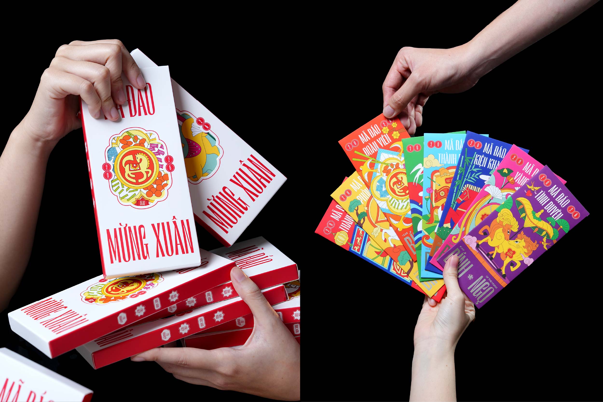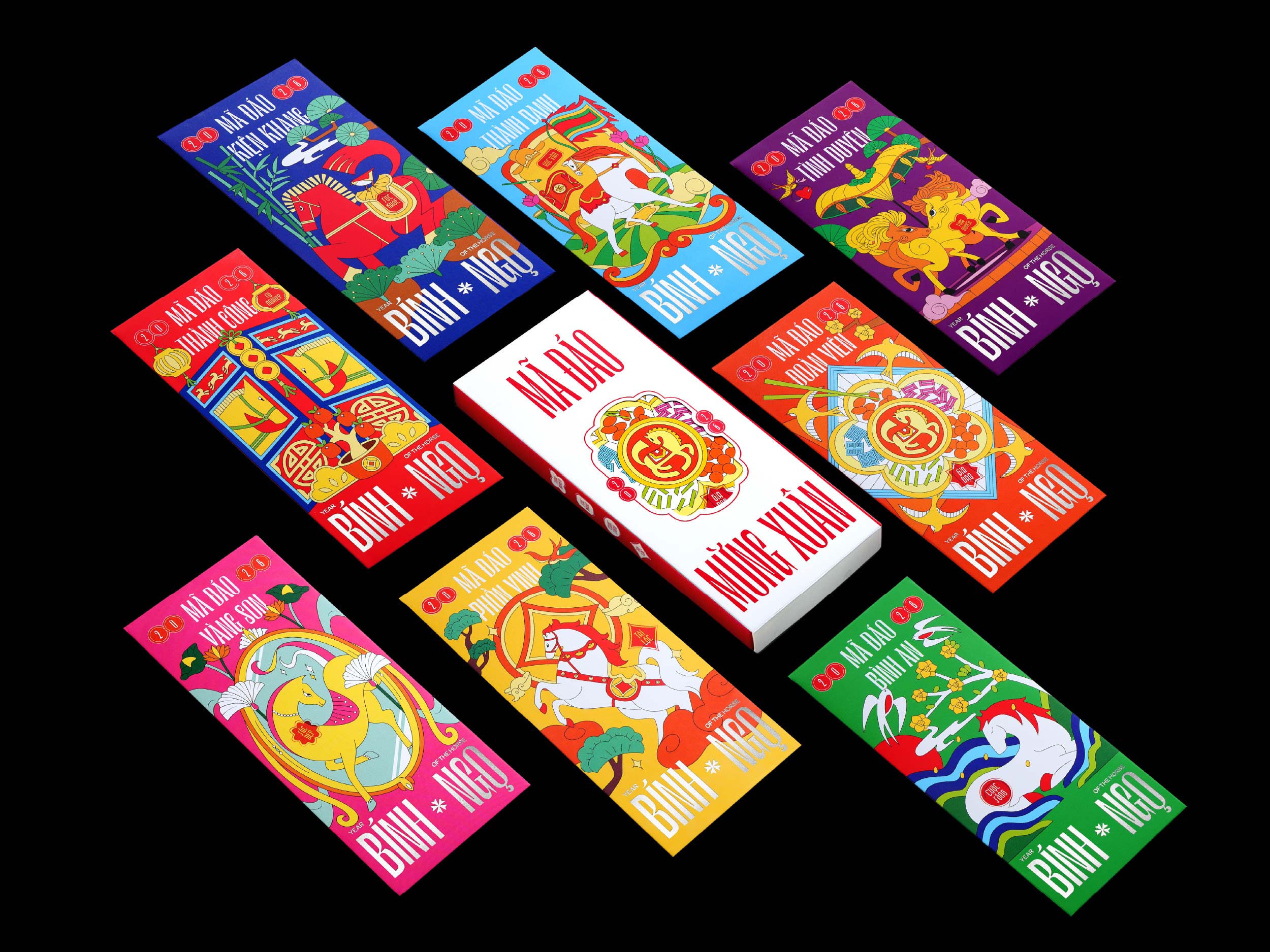 Inspired by this traditional idiom, the “Mã Đáo Mừng Xuân” lucky money envelope collection was created. Each box features a complete set of eight creatively word-played blessings, carrying heartfelt wishes for every aspect of life: