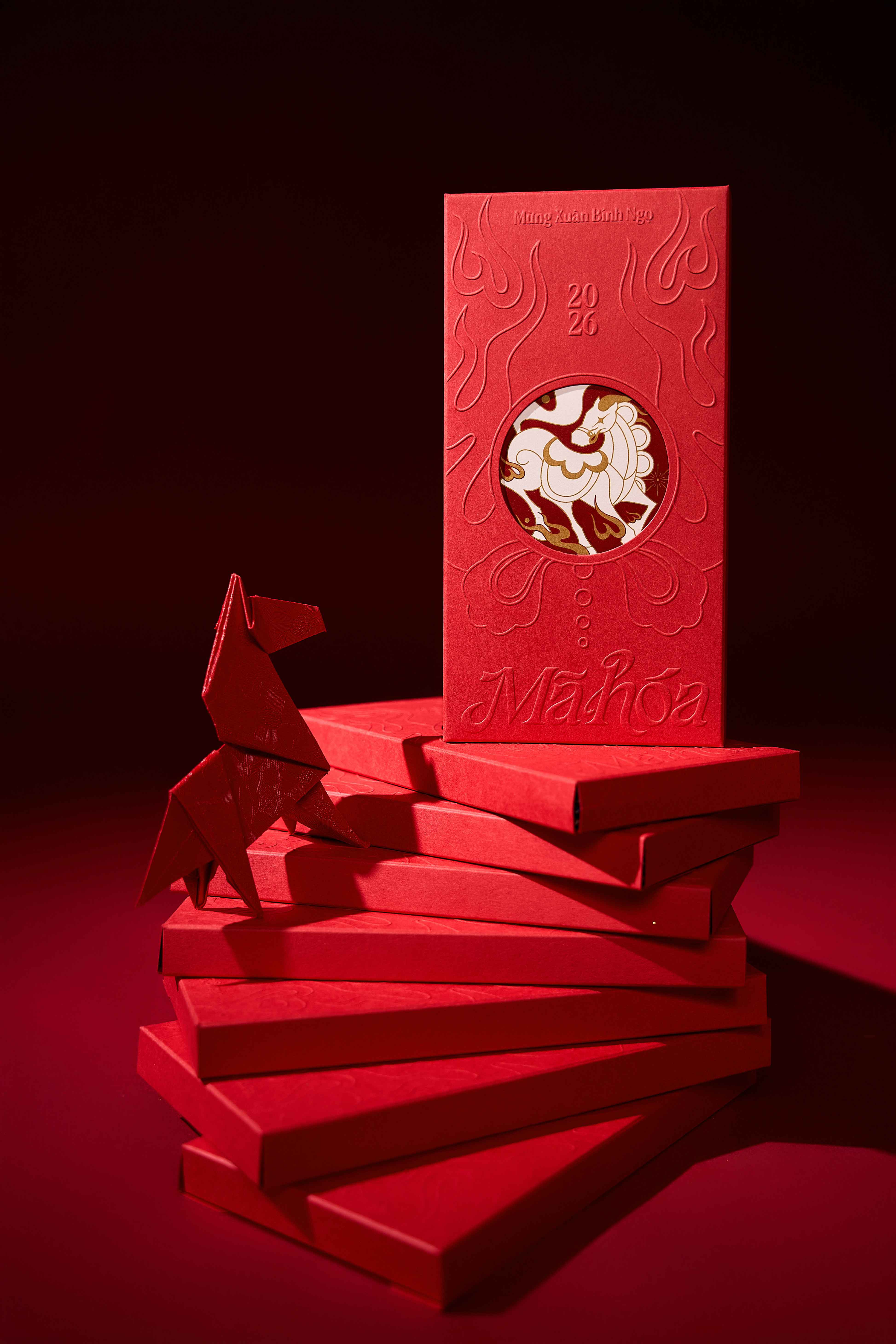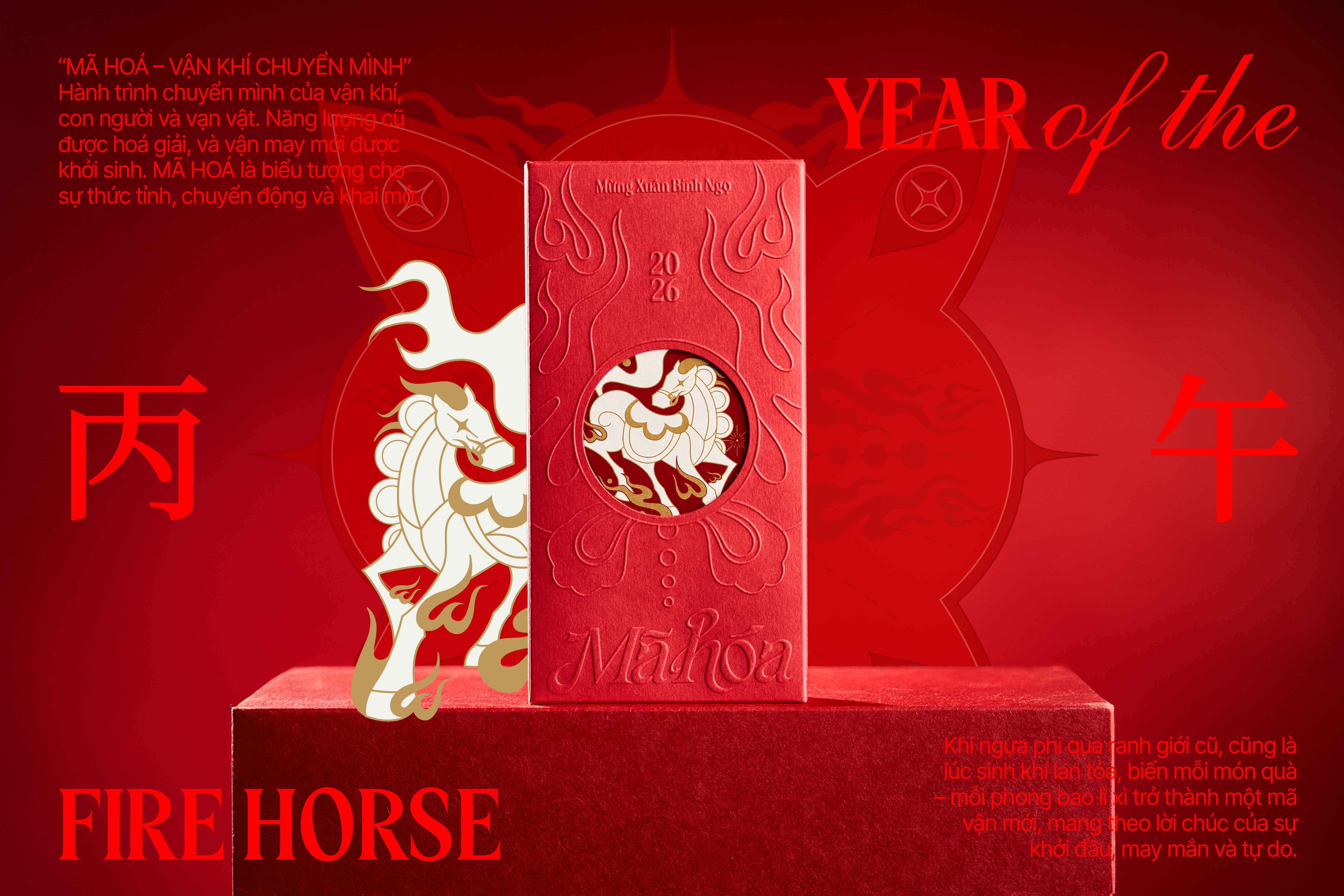 “Mã hoá” is a Vietnamese wordplay carrying dual meanings: “Mã” (Horse) and “Mã hoá” (encoding or activating data). As the Horse charges beyond old boundaries, vital energy radiates outward, transforming each gift – each red envelope – into a new encoded fortune, carrying wishes of new beginnings, luck, and freedom.