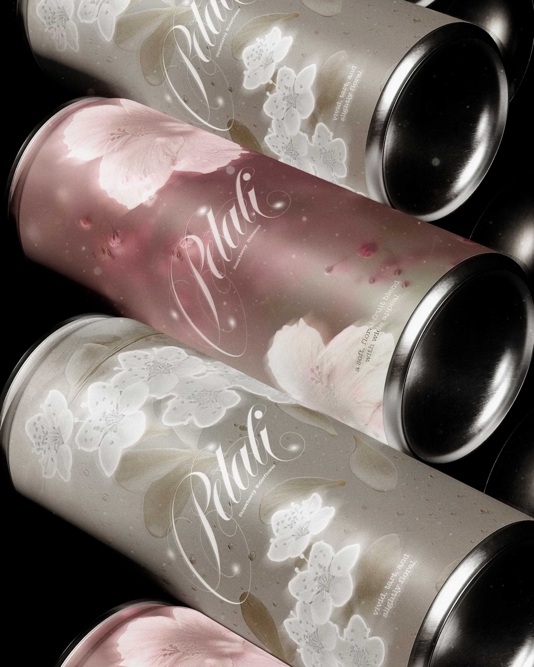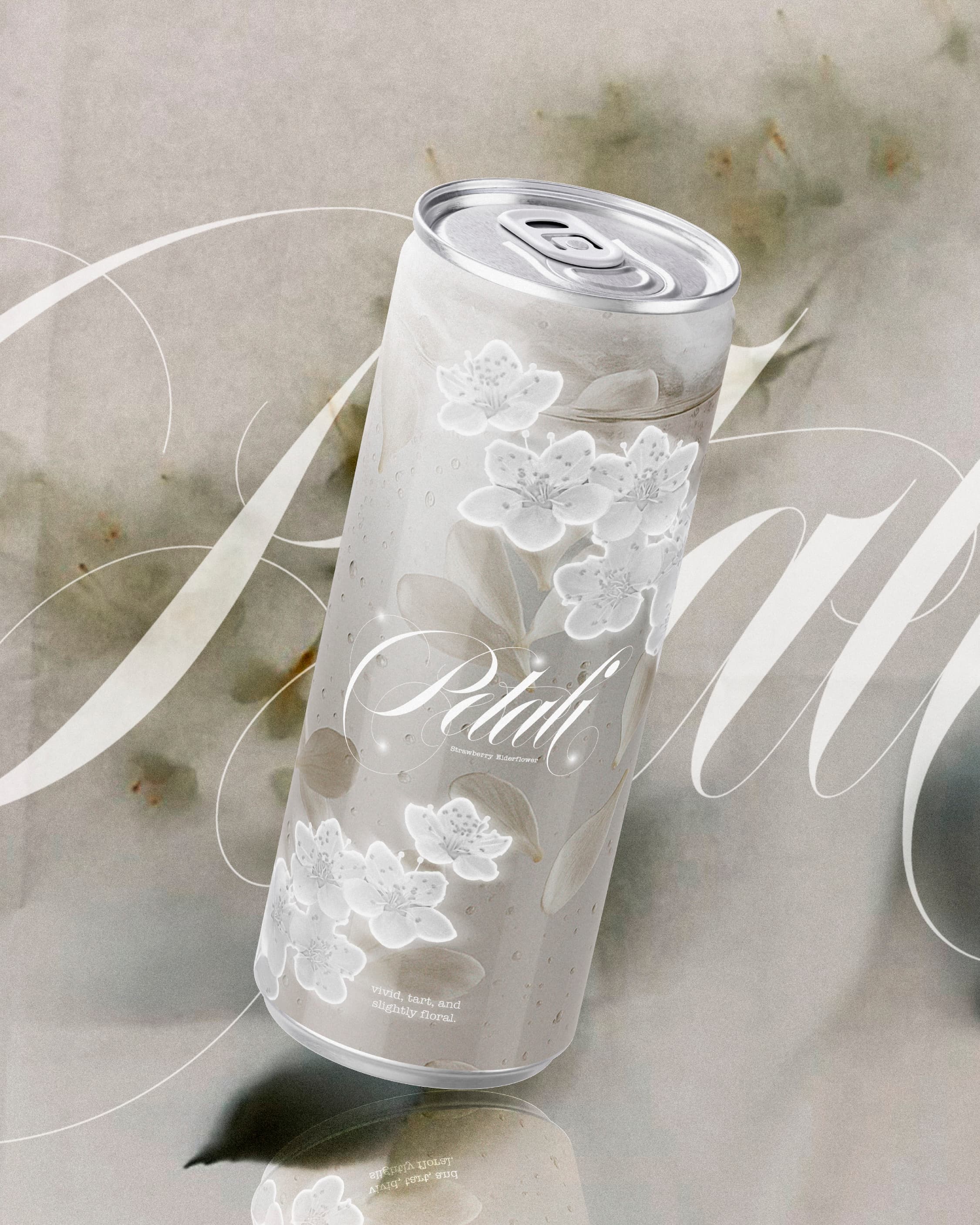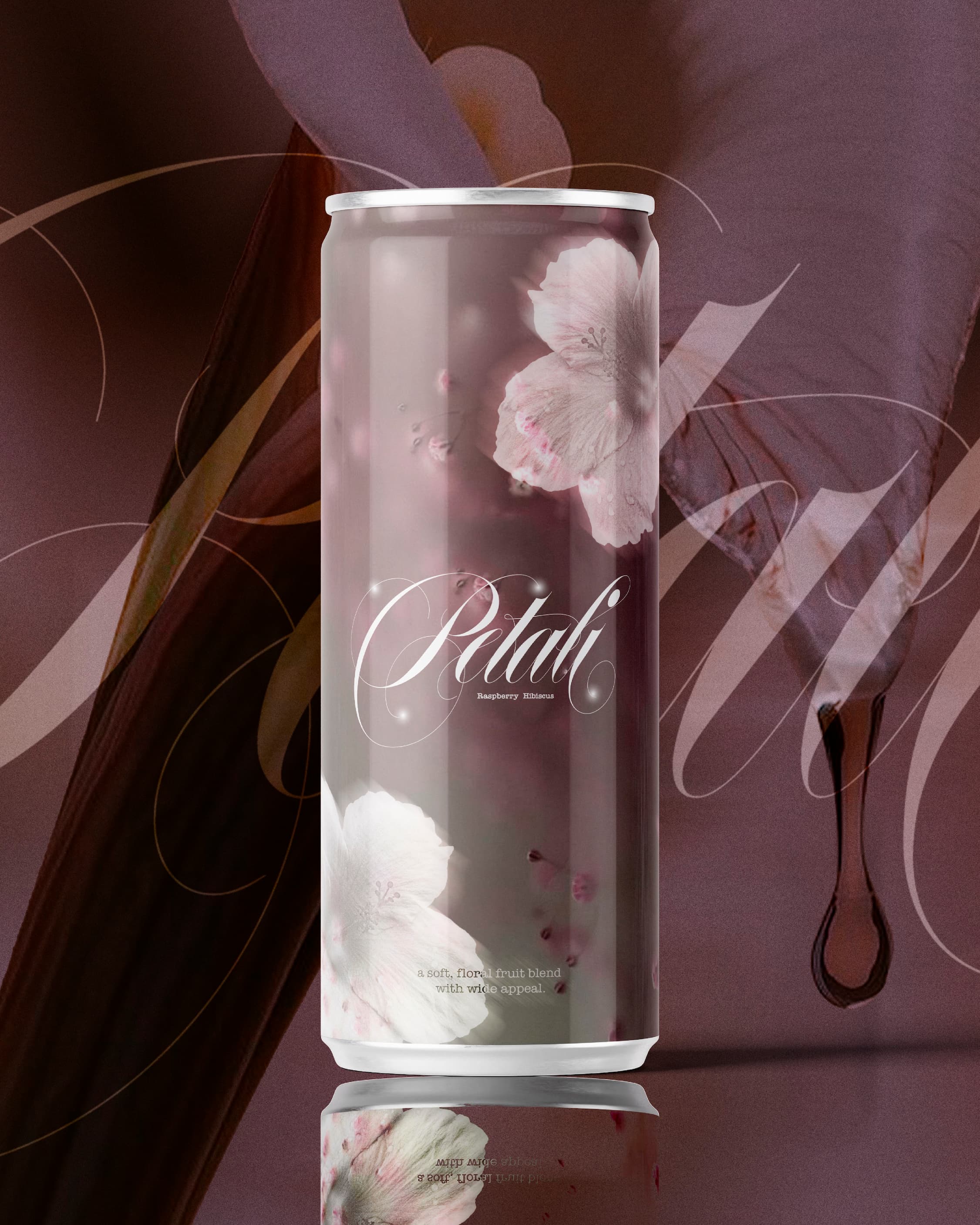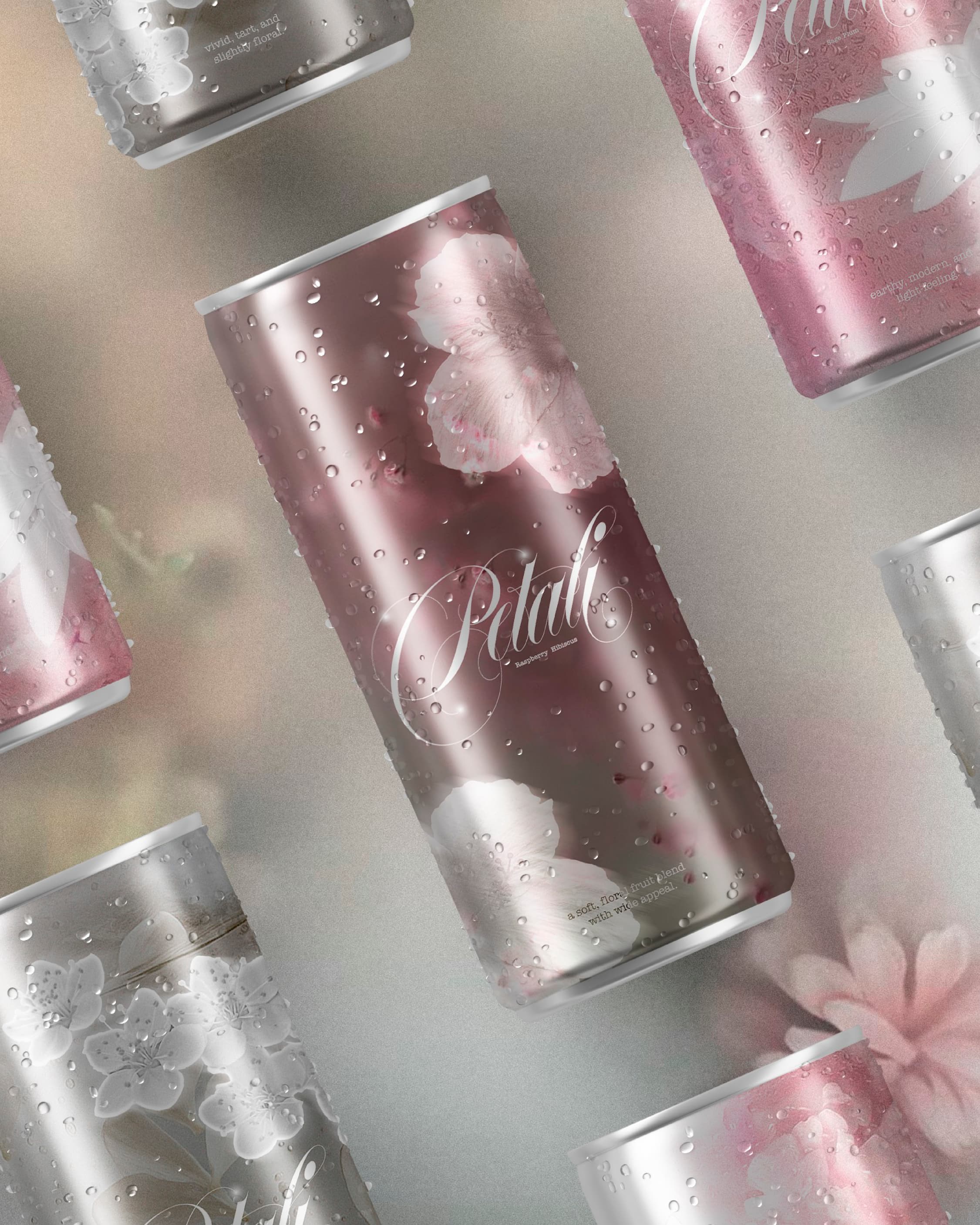 The visual identity plays a central role in shaping this experience. Petali is designed to be felt before it is tasted. Through layered floral textures, translucent materials, and soft silhouettes, the brand creates what can be described as visual smell. Condensation, mist, and light interact with the surface, suggesting freshness and movement while maintaining an ethereal calm. Petals appear suspended, drifting across the cans as if carried by air, reinforcing a sense of lightness and serenity.