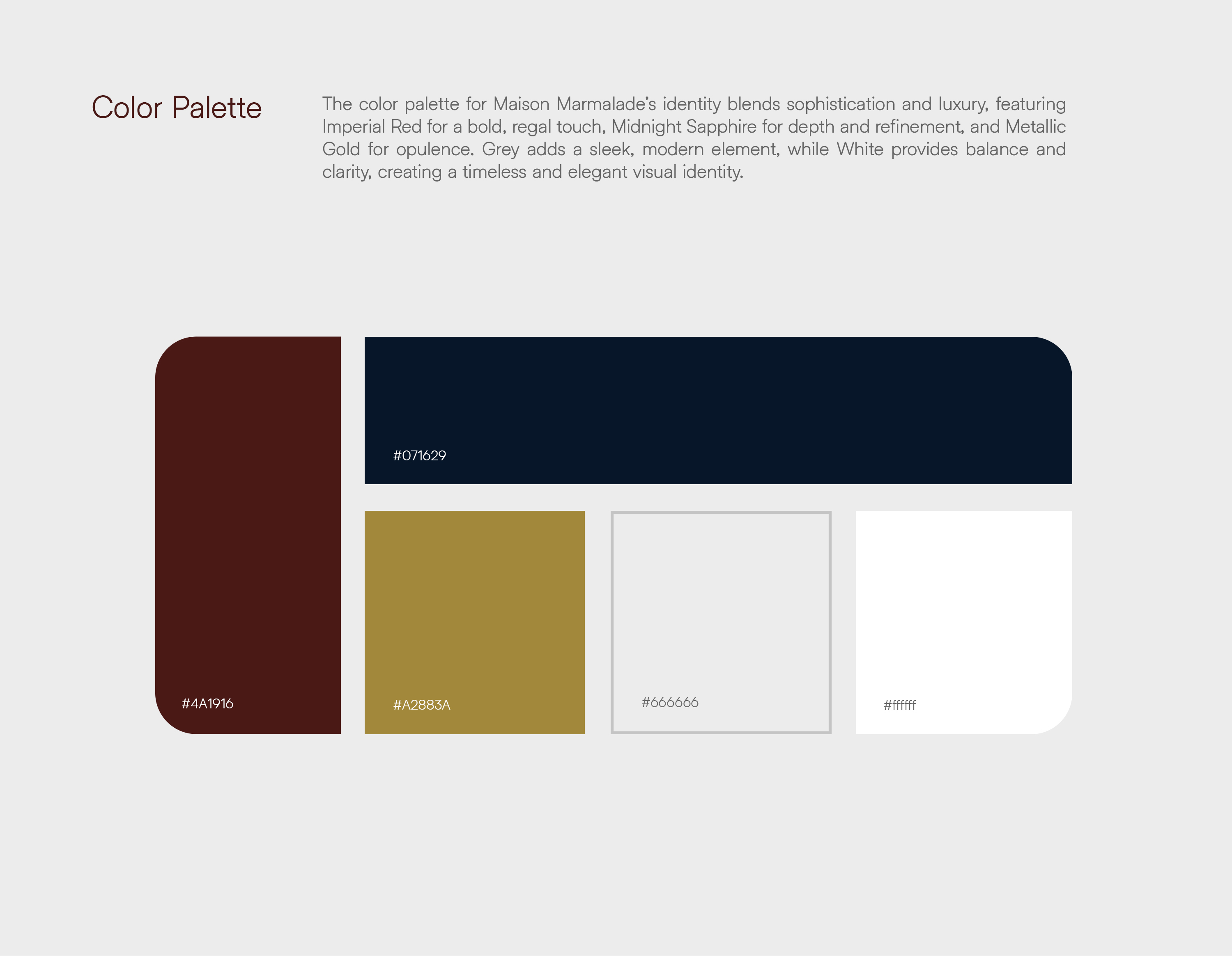 Color plays a crucial role in shaping the emotional language of Maison Marmalade. The palette was carefully curated to evoke luxury, depth, and timeless sophistication. Imperial Red, a deep and regal tone, forms the emotional foundation of the brand, symbolizing indulgence, passion, and opulence. This shade draws inspiration from aged wines, velvet interiors, and classic European luxury, creating a sense of warmth and depth. Midnight Sapphire introduces contrast and refinement, adding a layer of mystery and elegance that enhances the premium character of the brand. Metallic Gold serves as the primary luxury accent, representing craftsmanship, exclusivity, and prestige, while soft greys and whites provide clarity, balance, and modern restraint.