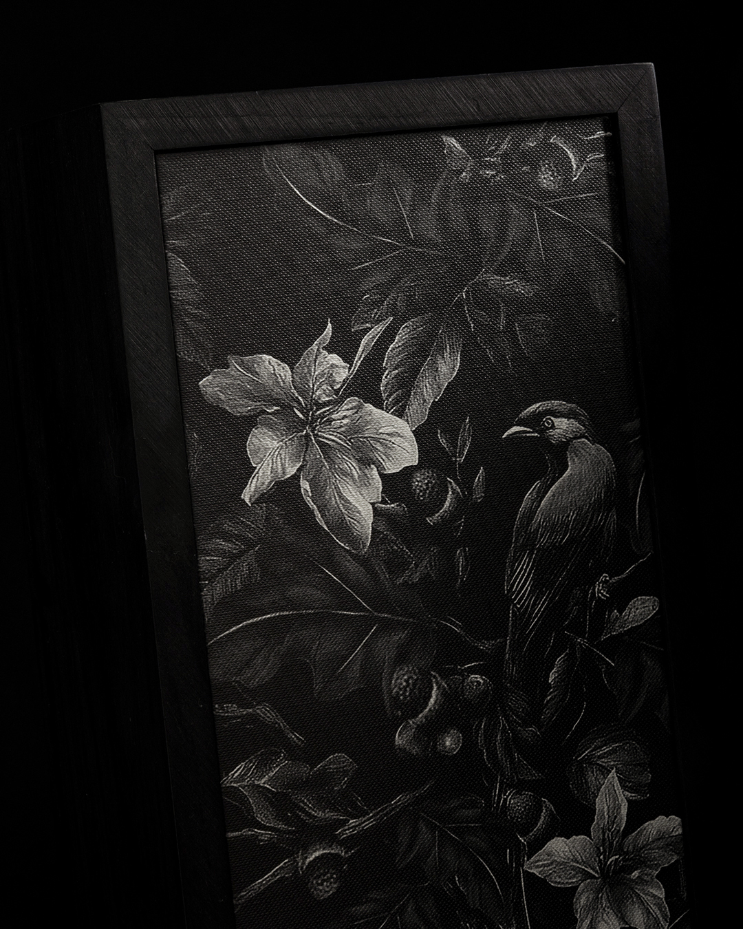 The packaging presents itself as an invitation to a ritual. At first glance, the box conveys understated sophistication, but its true character lies in the interplay between interior and exterior. A live pattern animates the inside, subtly projecting outward like a visual echo that suggests depth and intention. The transparency of the lid creates an elegant tension, it does not fully reveal, yet it does not completely conceal. It offers a glimpse of the bottle, awakening curiosity and anticipation.