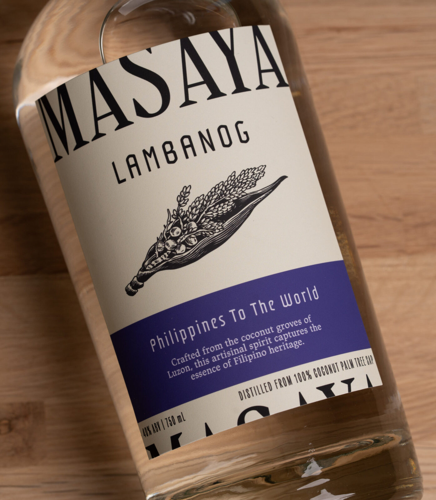 The elongated serif logo further defines Masaya’s personality. Cut off at the top of the label and completed at the bottom, it adds a refined yet expressive gesture that feels both intentional and dynamic. Its stretched form subtly references the towering height of coconut palms, while the broken placement mirrors the spontaneity and intuitive creativity found in traditional Lambanog-making, where resourcefulness and improvisation have always played a role.
