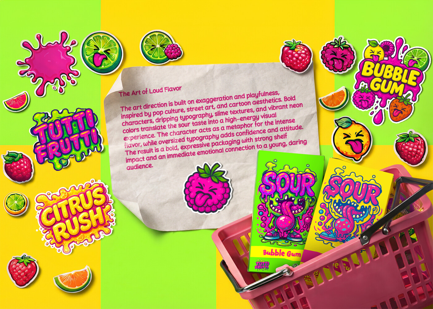 The color palette is based on high-contrast neon tones, primarily acidic greens, vibrant yellows, and bold pinks. These colors were selected to visually represent sourness while maximizing shelf visibility and instant recognition. The palette also creates a strong visual tension that mirrors the sharp taste profile of the product.