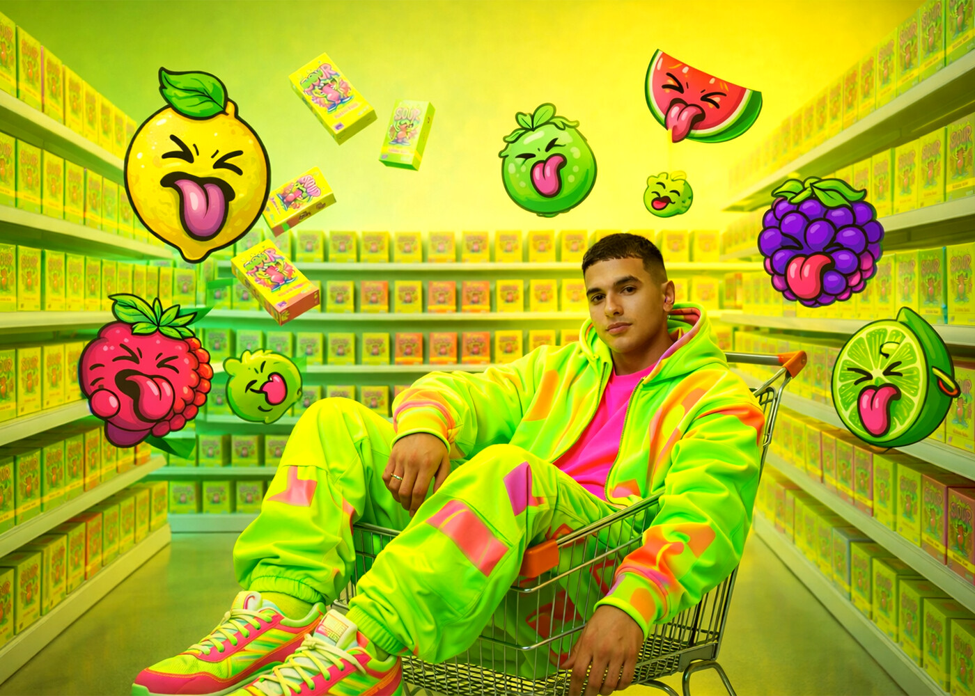 The art direction is rooted in exaggeration and expressive storytelling, inspired by pop culture, street art, and contemporary cartoon aesthetics. The goal was to visually simulate the physical reaction of sourness through form, color, and typography.