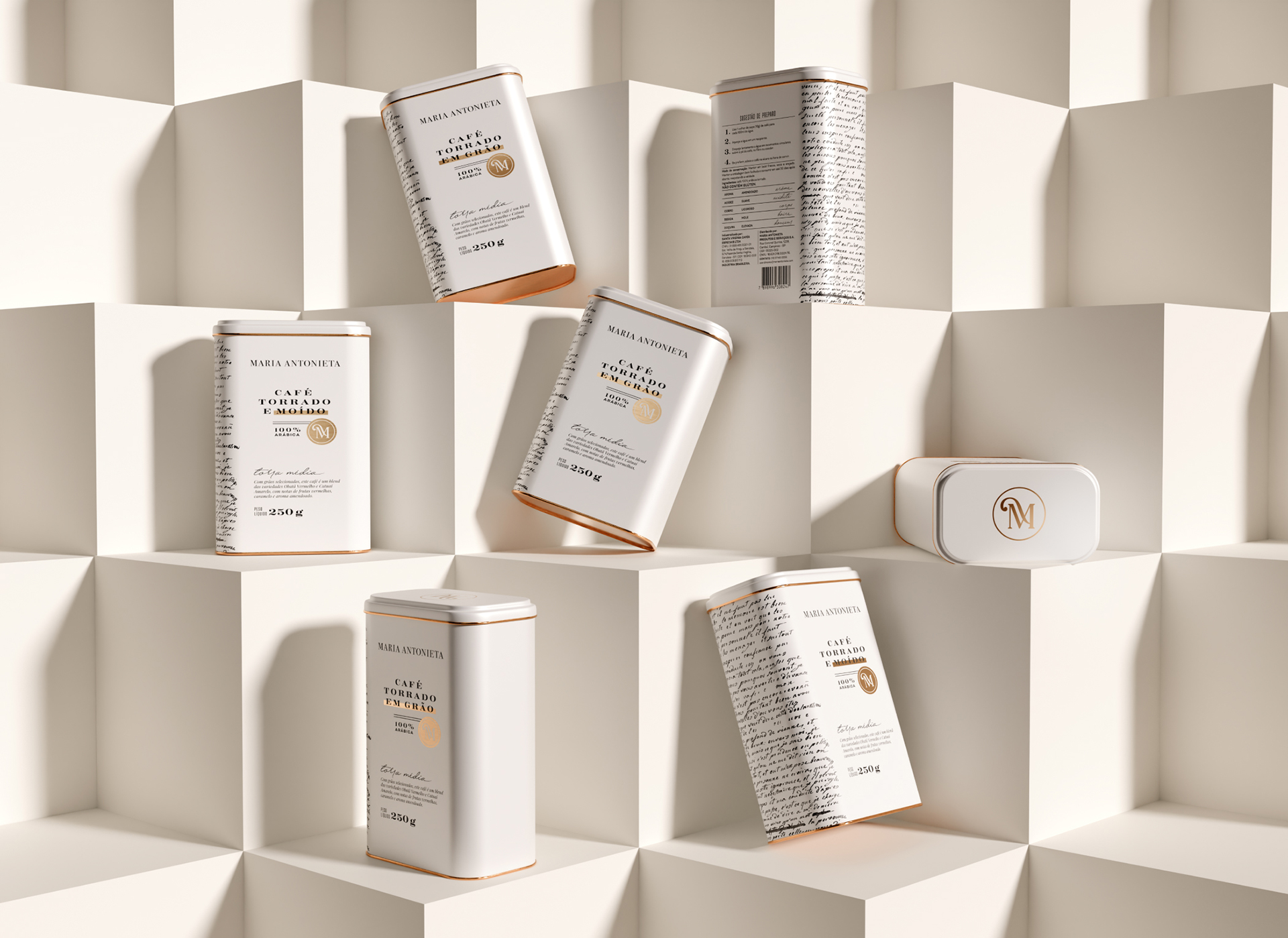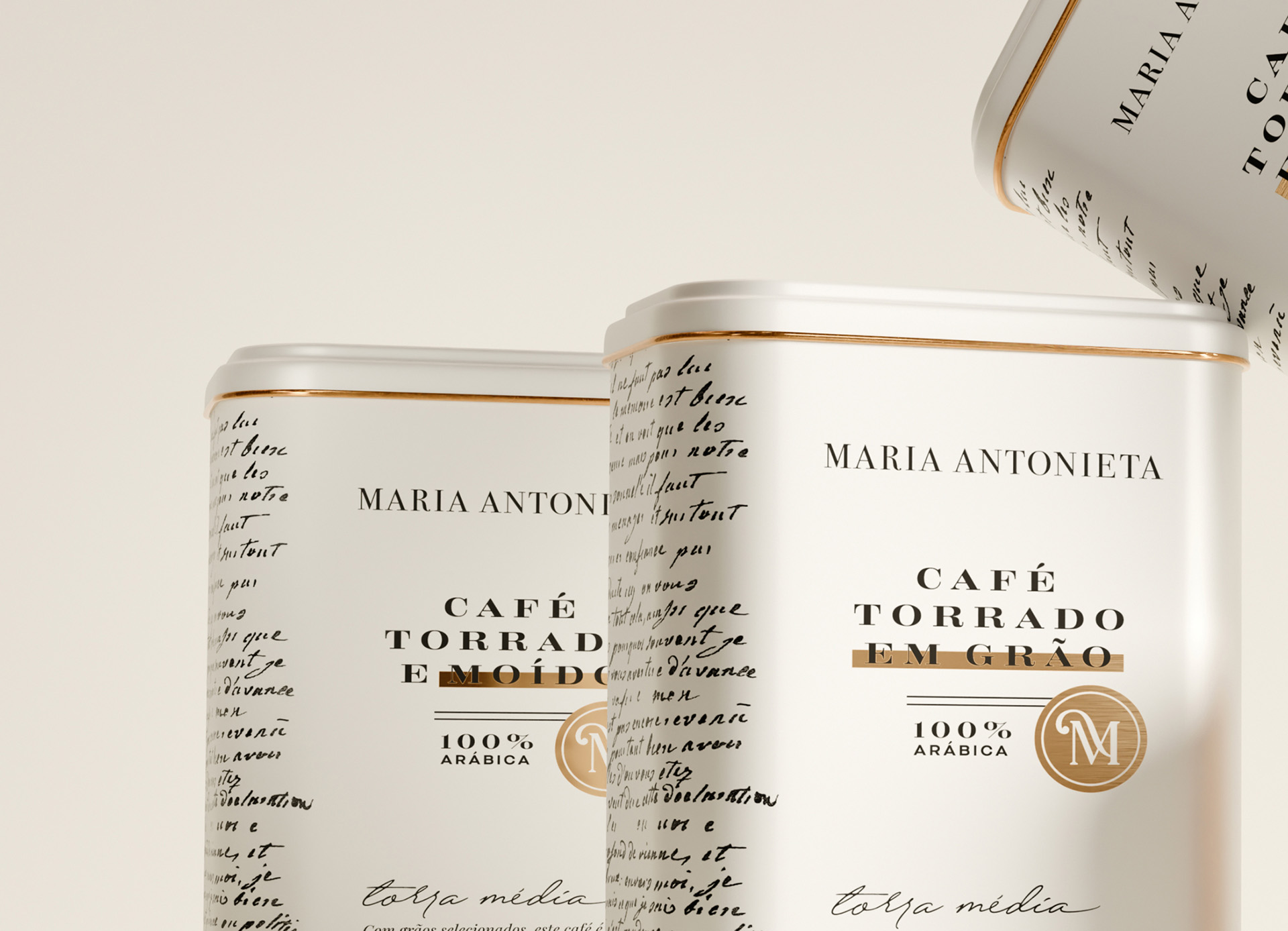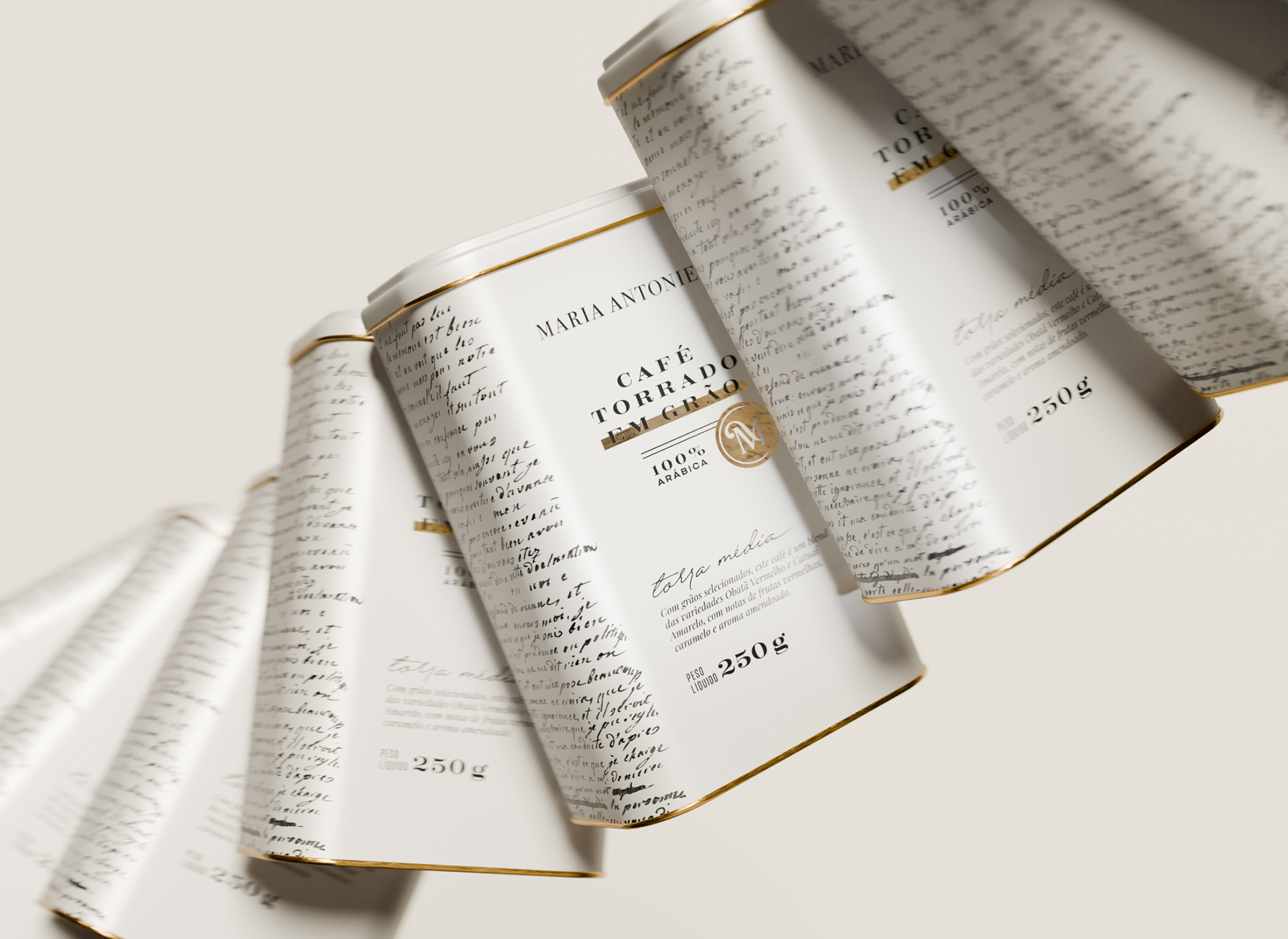 The side of the can features a reproduction of one of the original letters, with the words standing out against a white background and extending across the front and back views, creating a seamless visual flow. Golden details, carefully applied to specific areas of the packaging, add a touch of luxury and sophistication, making the packaging a highly presentable piece – an important aspect for the brand and its consumers.