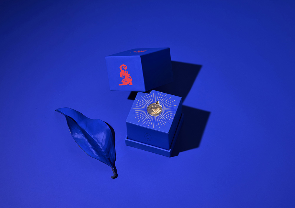 The packaging also features symbols of the four elements of Chinese Astrology, Earth, Water, Air, and Fire, delicately engraved on the box surfaces. The fifth element, Metal, is represented by the gold pendant itself.