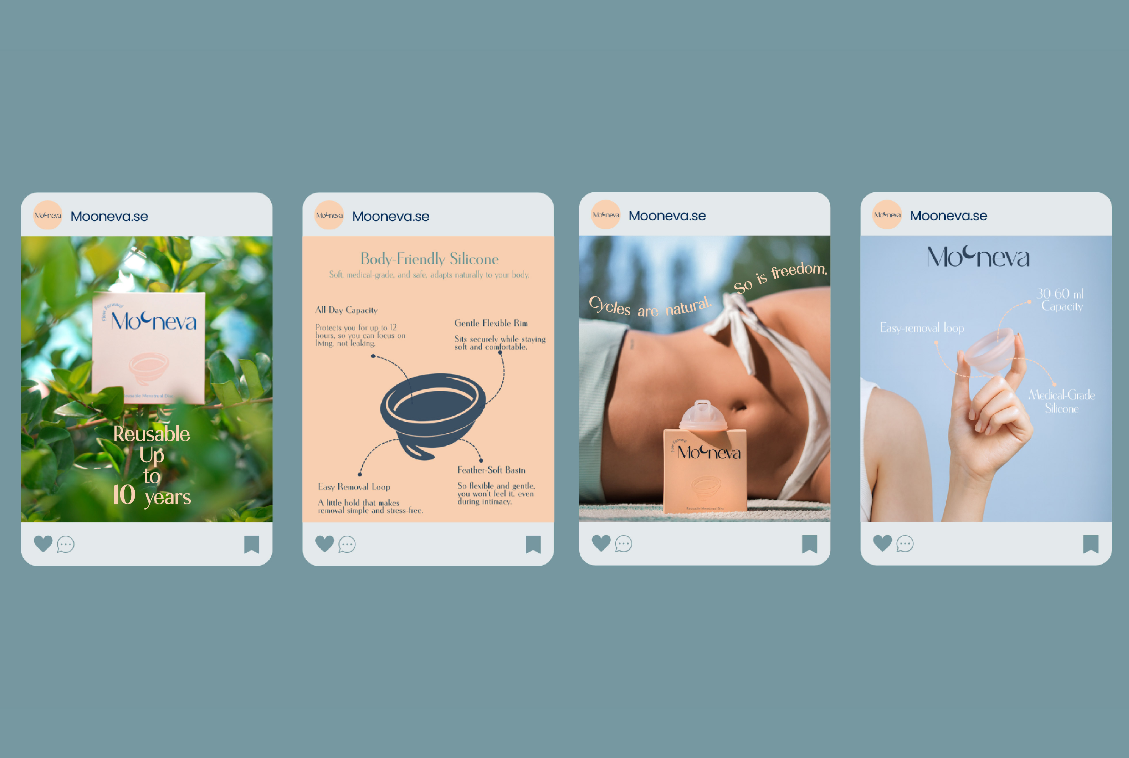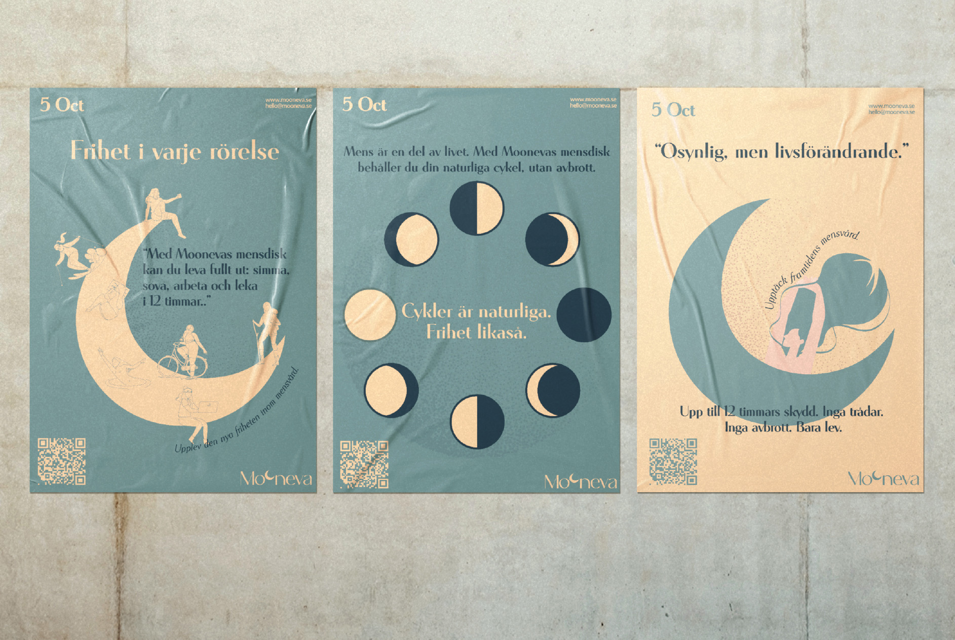 The design strategy is rooted in the brand’s personality. Mooneva brand personality is “sincere”, aiming with calm honesty to transform menstruation from a hidden, tension-filled experience into one that is predictable, gentle, and low-stress, Without overlooking the real, everyday experience of a period. The moon and its cyclical rhythm reinforce this personality and appear across every design layer, from posters and social media to the website and packaging.