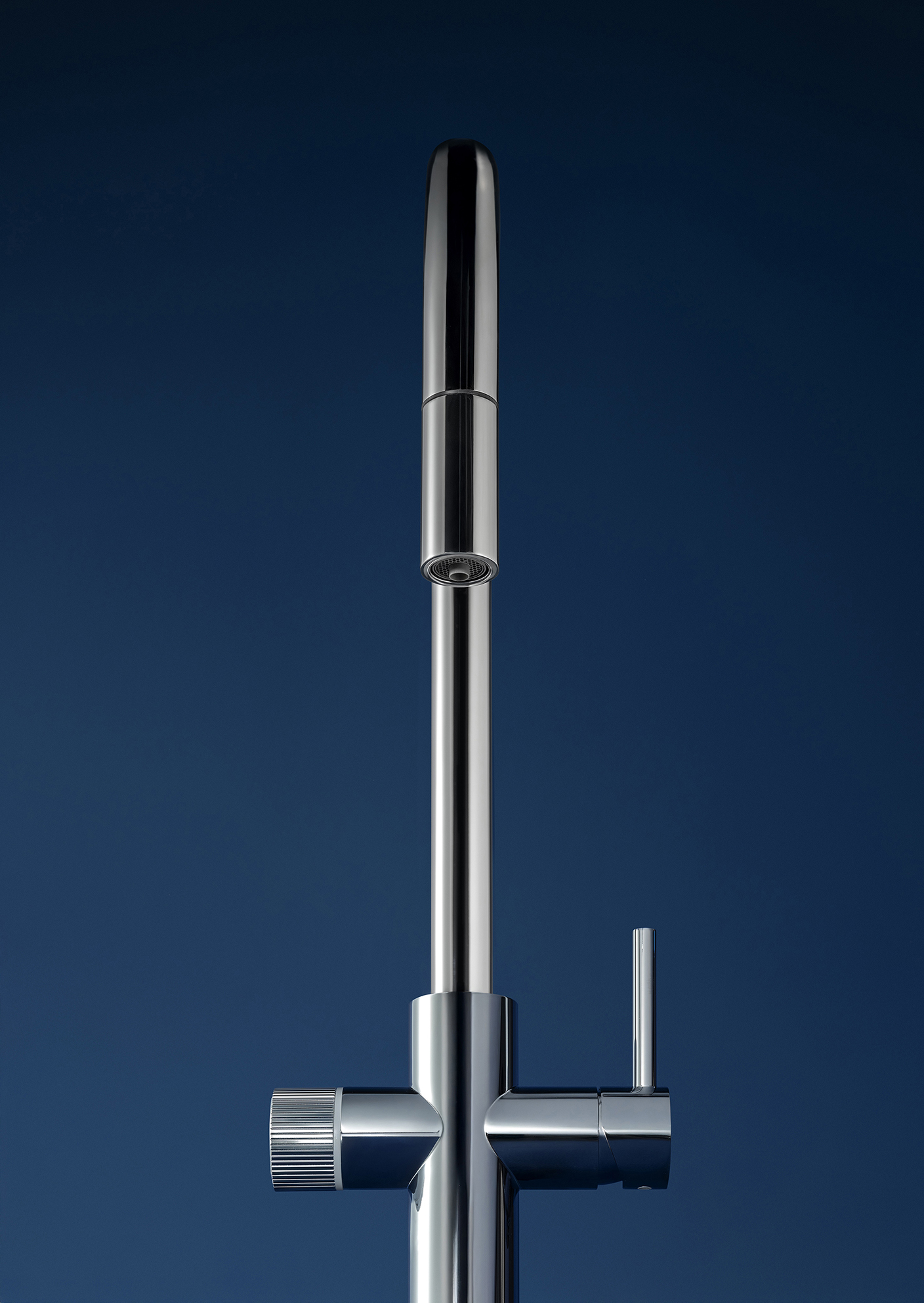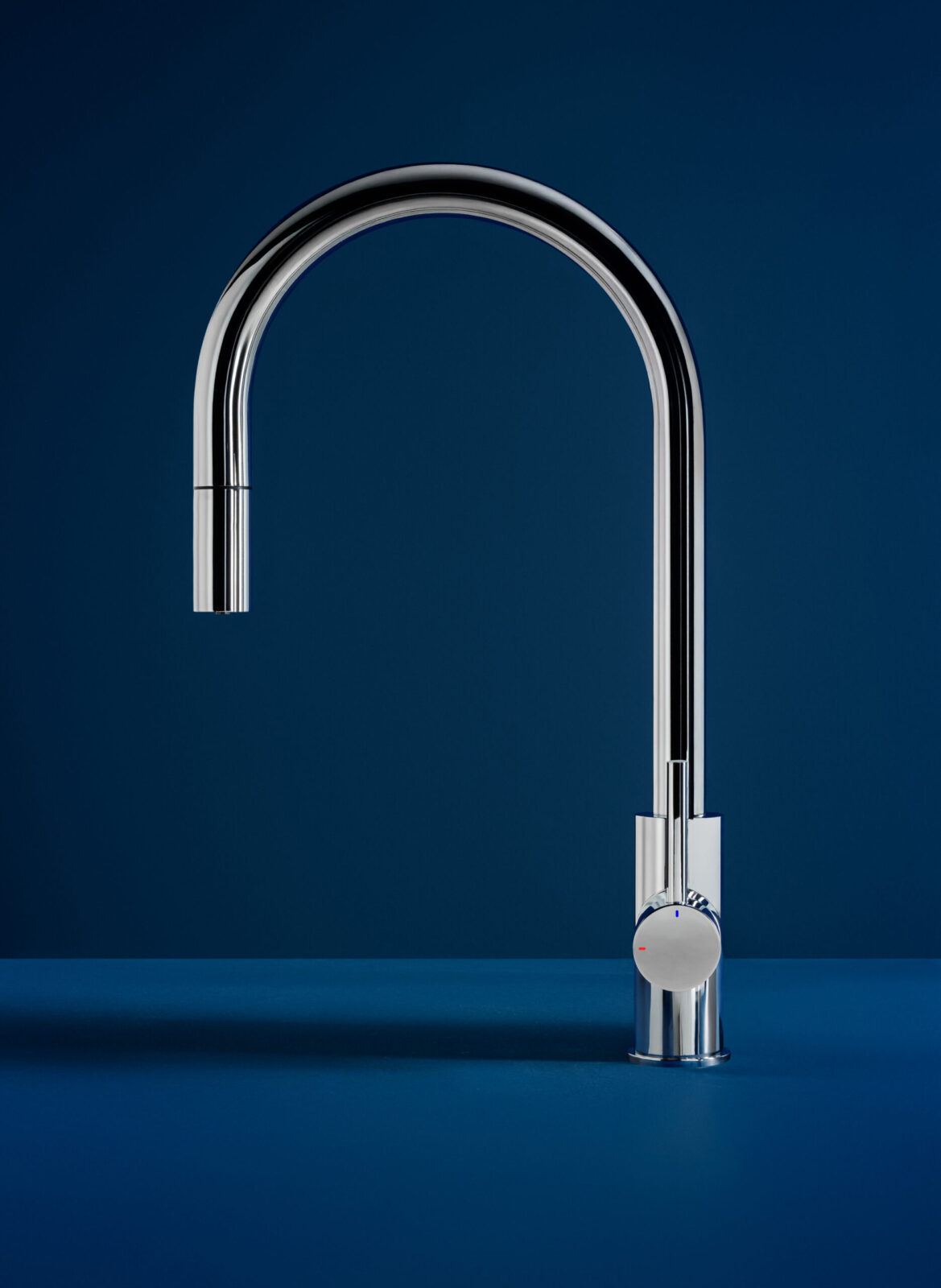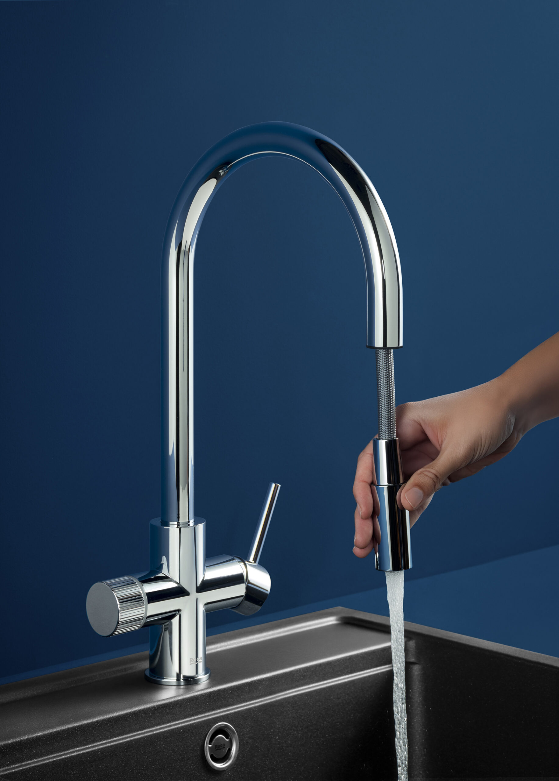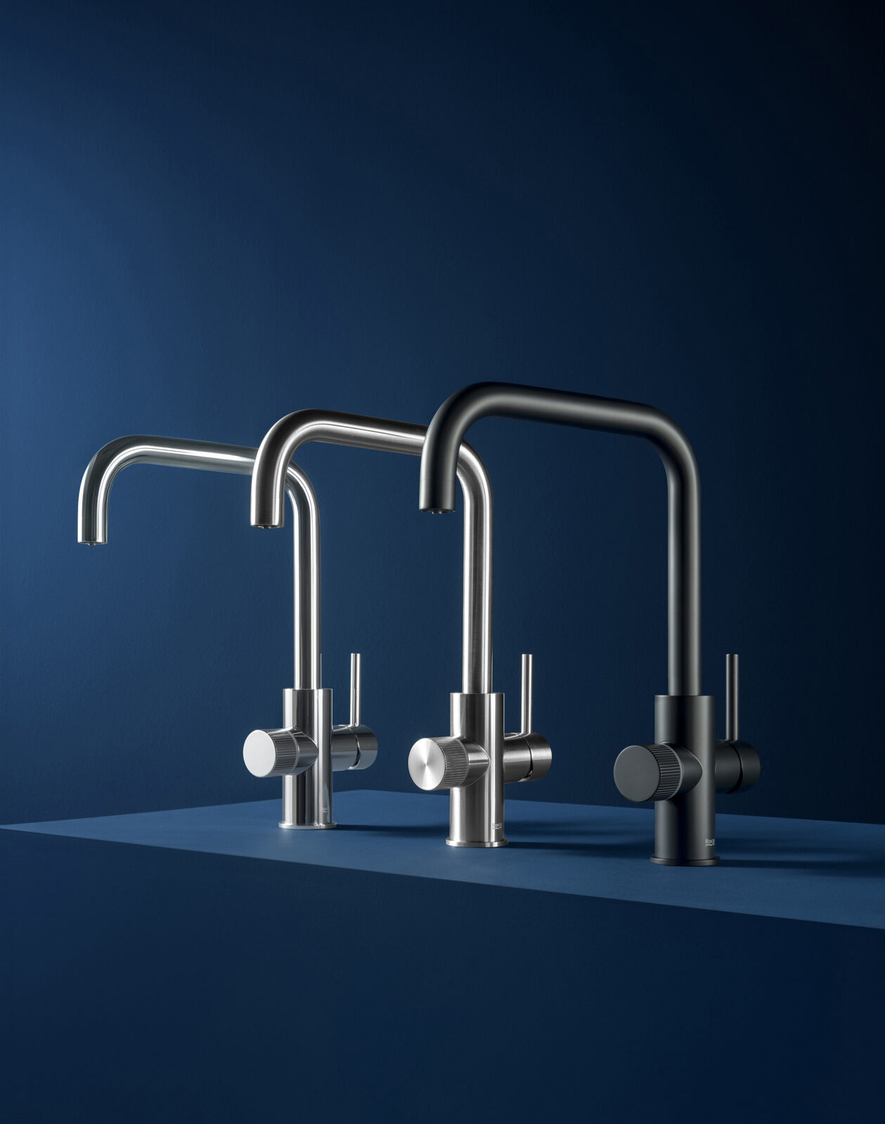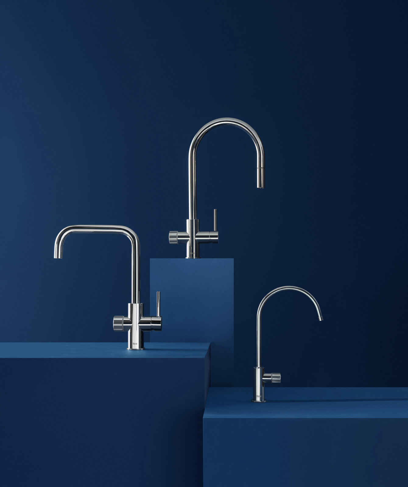 Art direction for the faucets of the Roca brand. This series of images presents a minimalist and sophisticated interpretation of kitchen faucet design, highlighting the modern and functional aesthetics of the products. The compositions, shot in a controlled setting with a dark blue background, create a striking visual contrast that accentuates the meticulous design of the faucets and the serenity of the surroundings. Each faucet is presented independently, creating a visual narrative that emphasizes its clean lines and finish, conveying a sense of high quality and elegance.