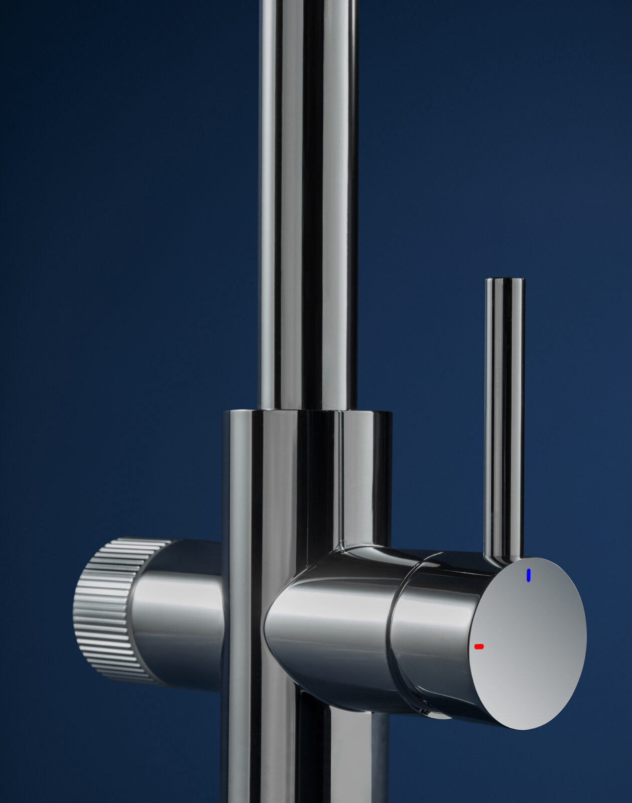 The choice of the blue background is not accidental; it provides a sense of depth and visual harmony that allows the details of each faucet, such as smooth contours and subtle color transitions, to come to life. This background not only frames the product but also reinforces the idea of modernity and exclusivity, making each faucet stand out as a functional piece of art that exudes sophistication.