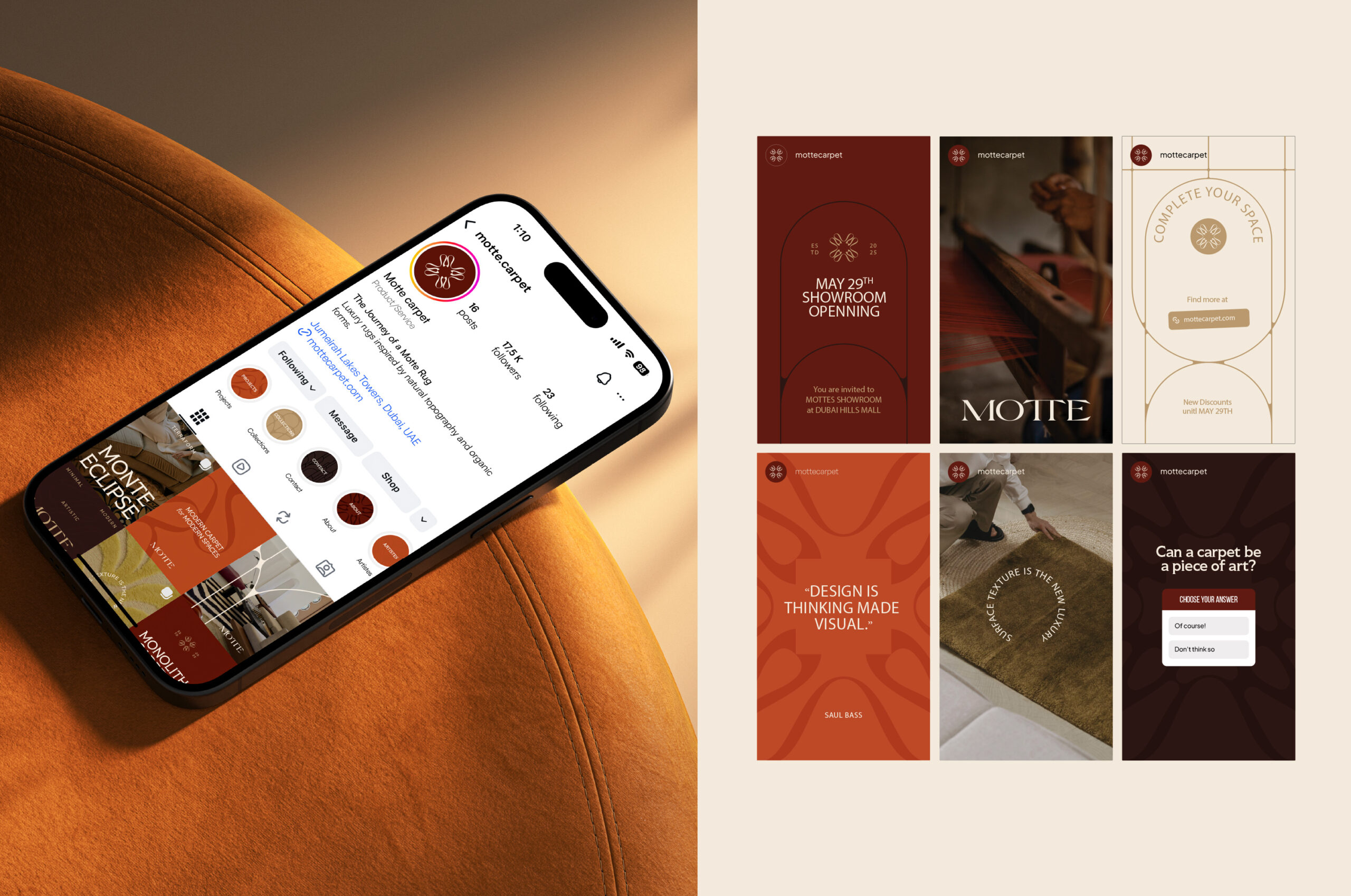 The color palette was intentionally selected using warm, earthy hues. This choice not only echoes the brand’s core sensibility but also ensures distinct contrast across various platforms. As for the sign, the letter M was reinterpreted along with the logic of warp and weft, creating a contemporary typographic voice that communicates refinement, quality, and an elevated modern luxury. Since the brand required a versatile system across printed materials, packaging, digital and social spaces, the visual identity was built to remain cohesive across every touchpoint.