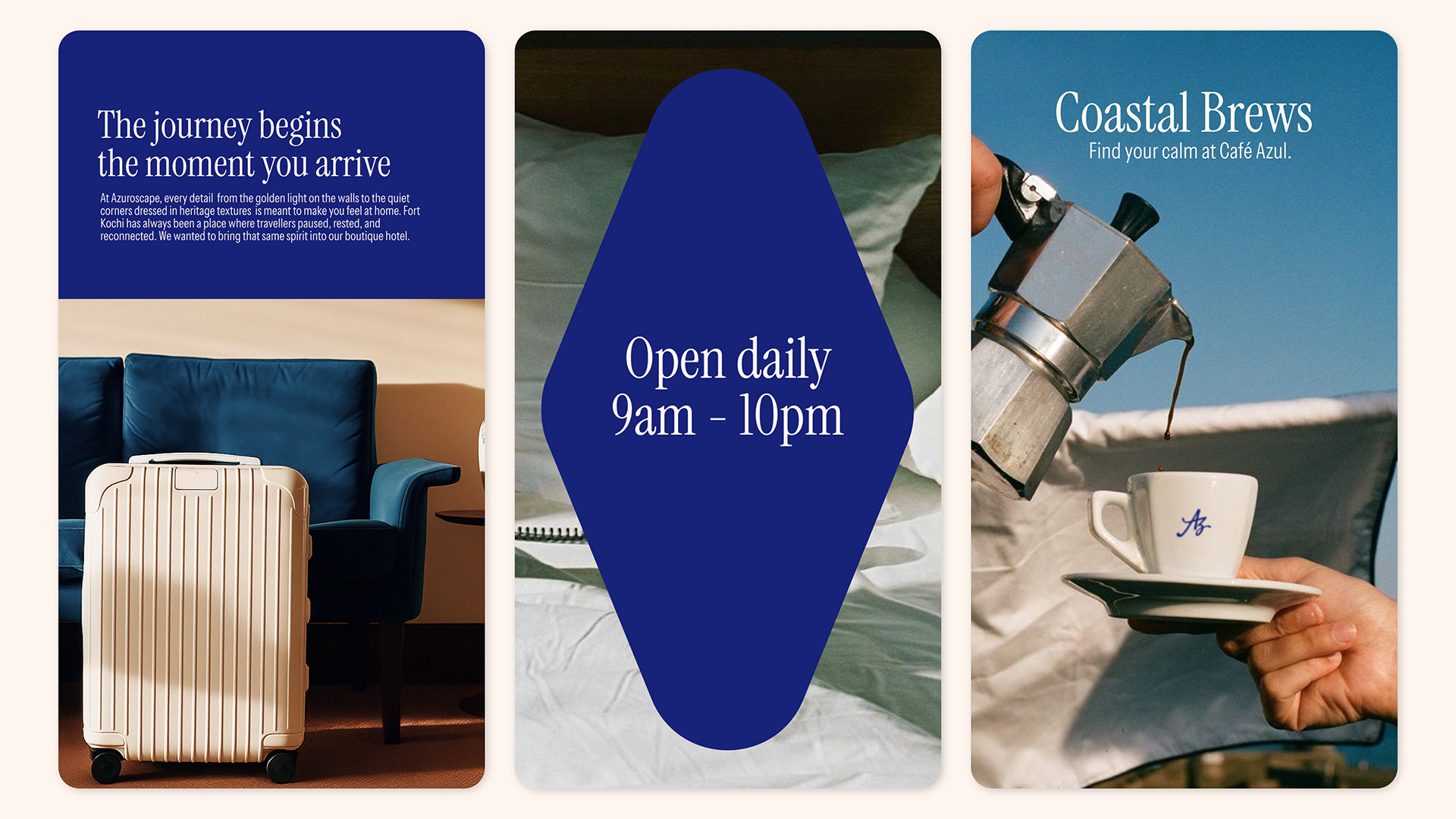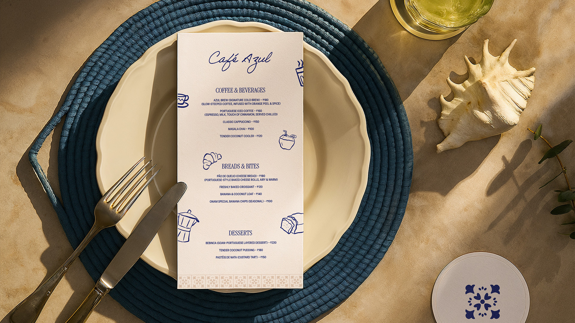 The identity began with the concept of escape in azure, evolving from research into Kochi’s colonial history and the artistic tradition of Portuguese azulejo tiles. The name Azuroscape originally started as an intuitive idea, but once we explored the connection between azulejo tilework and coastal themes, the brand direction aligned naturally. That discovery informed the design system — from logo to patterns, colors, and tone of voice.