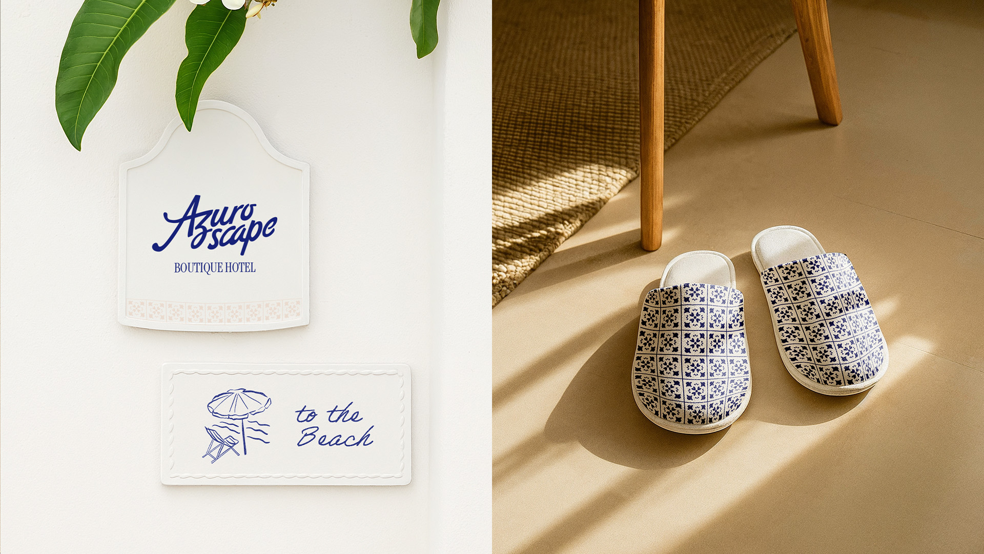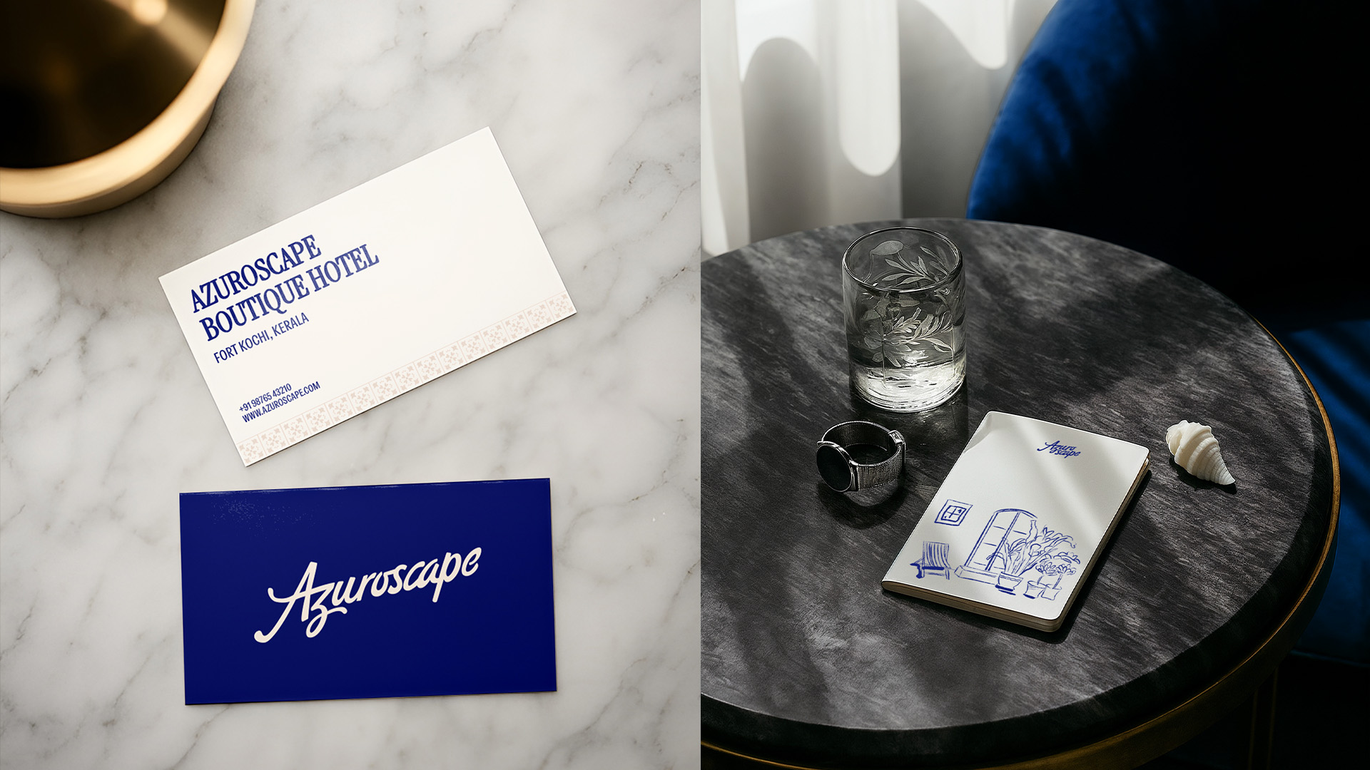 Azuroscape is a boutique hotel branding project inspired by the cultural layers, coastal calm, and Portuguese heritage of Fort Kochi. The core idea was to create a hospitality identity that feels premium and elegant, yet warm, personal, and rooted in place. Rather than building another typical luxury hotel brand, the aim was to balance refined visual language with human, handcrafted details — a brand that feels designed for real people and real experiences.