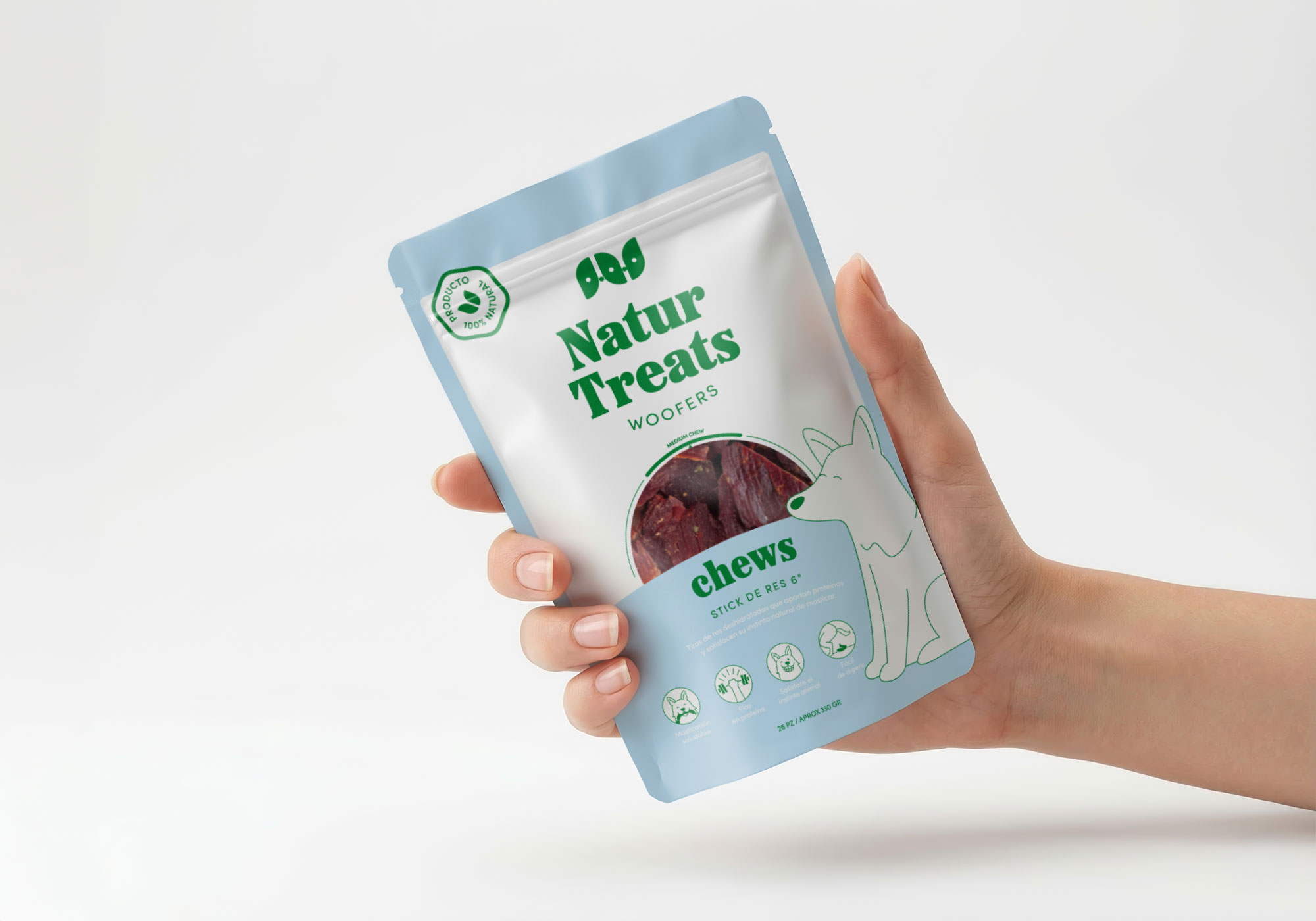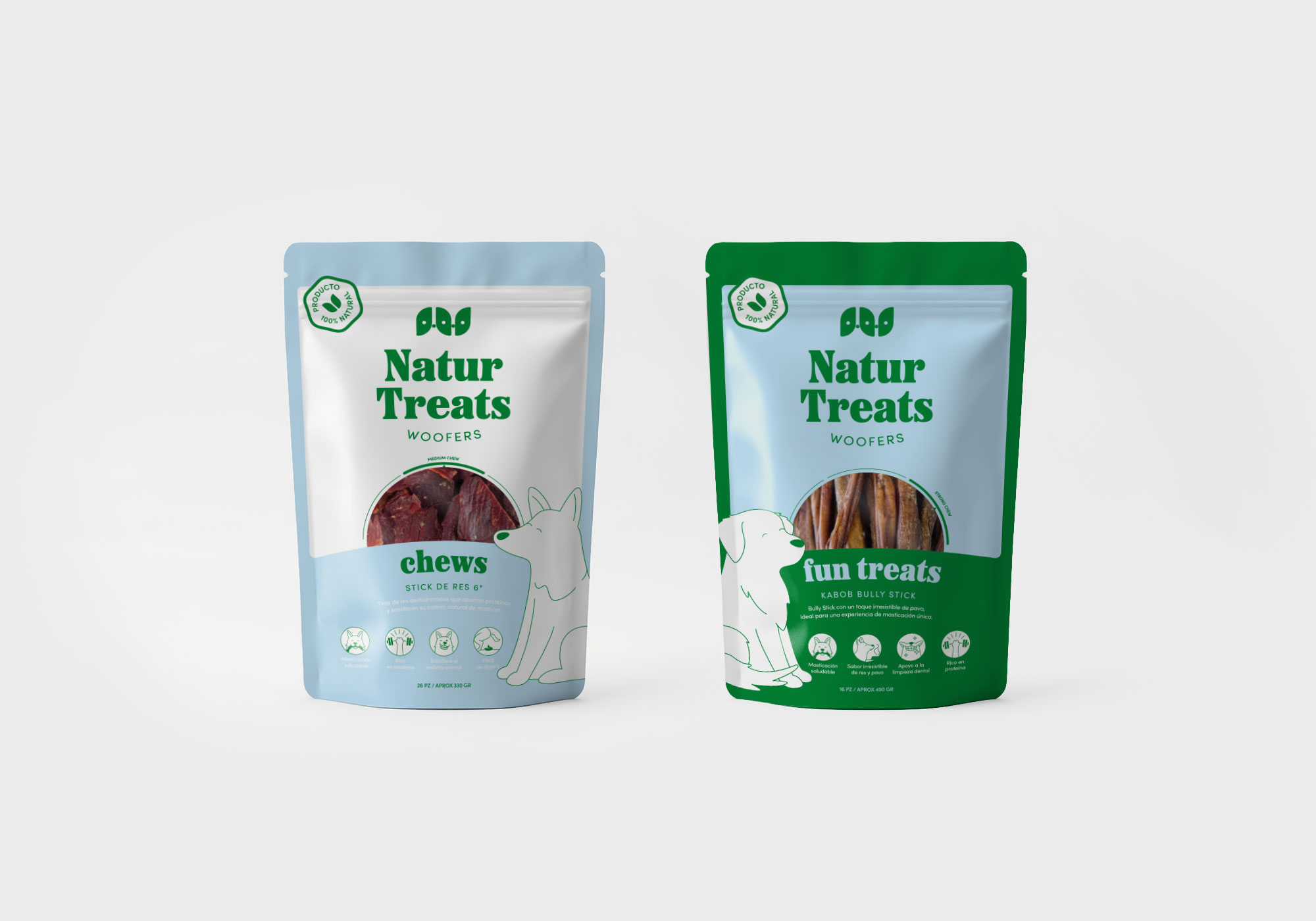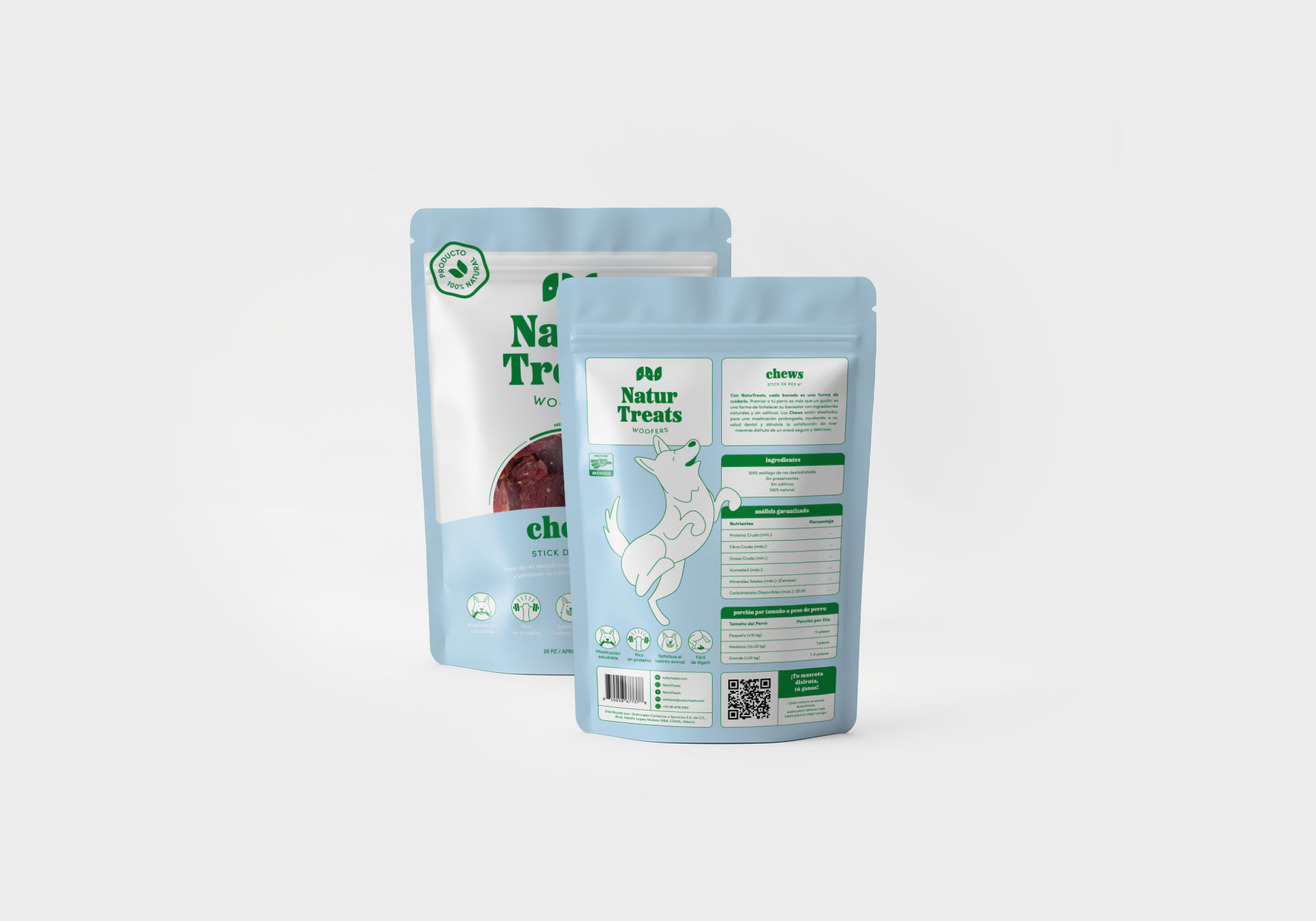 El proyecto Natur Treats nace de la intersección entre el afecto por los animales y la excelencia nutricional, con el firme propósito de redefinir el mercado de premios para perros mediante una propuesta orgánica y de alta calidad. La base conceptual de la marca se fundamenta en la historia personal del fundador, tomando como musas a sus propios compañeros: Kira, una Siberian Husky, y Max, un Golden Retriever. Esta conexión emocional permitió que la identidad visual no solo comunicara frescura y pureza, sino también una calidez auténtica que resuena con los dueños de mascotas que buscan lo mejor para sus fieles amigos. El desafío principal consistió en alejarse de los códigos visuales convencionales de la industria de alimentos para animales, optando por una paleta de colores vibrante en tonos verdes y celestes que refuerza de inmediato la promesa de un producto cien por ciento natural y sustentable, aportando una frescura visual que destaca en el anaquel. El diseño del logotipo es el pilar de esta identidad, donde la letra N de Nature Treats se transforma en un símbolo inteligente y minimalista compuesto por tres hojas entrelazadas. Este isotipo no solo rinde homenaje a la naturaleza, sino que oculta una ingeniosa representación de las razas que inspiraron el proyecto. Las dos primeras hojas, con orientación descendente, emulan las orejas caídas características de un Golden Retriever, mientras que las dos últimas, con puntas hacia arriba, proyectan la silueta de las orejas erguidas de un Siberian Husky. Complementando esta estructura, se integraron ilustraciones personalizadas y dinámicas de Kira y Max, diseñadas bajo una estética que equilibra la sutileza con el dinamismo. El resultado final es un sistema de empaque que proyecta una imagen divertida y cercana, sin sacrificar la sofisticación de un producto de categoría premium, logrando una armonía perfecta entre el juego visual y la limpieza gráfica.