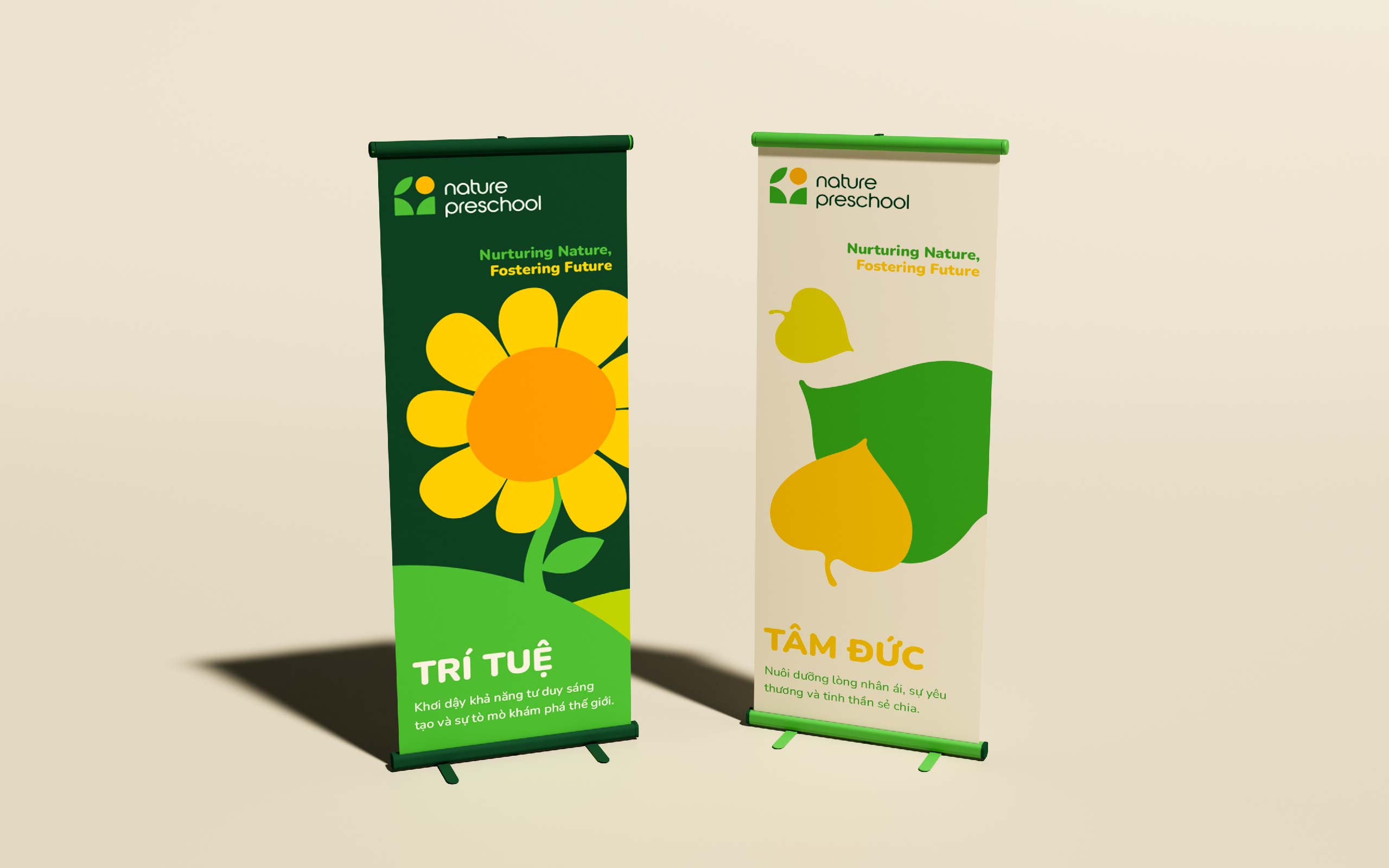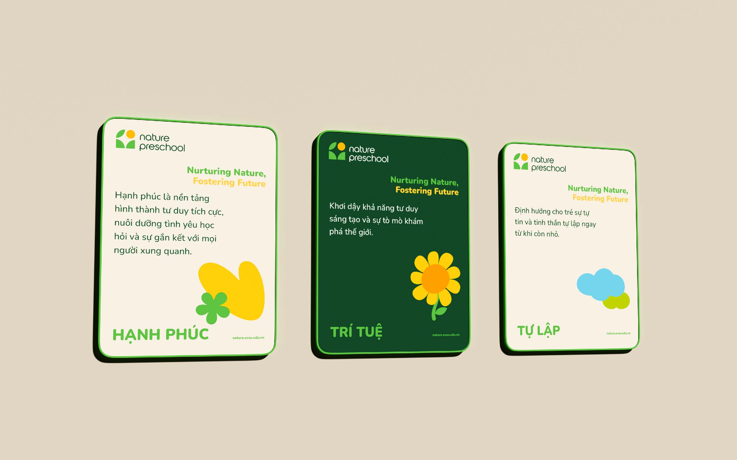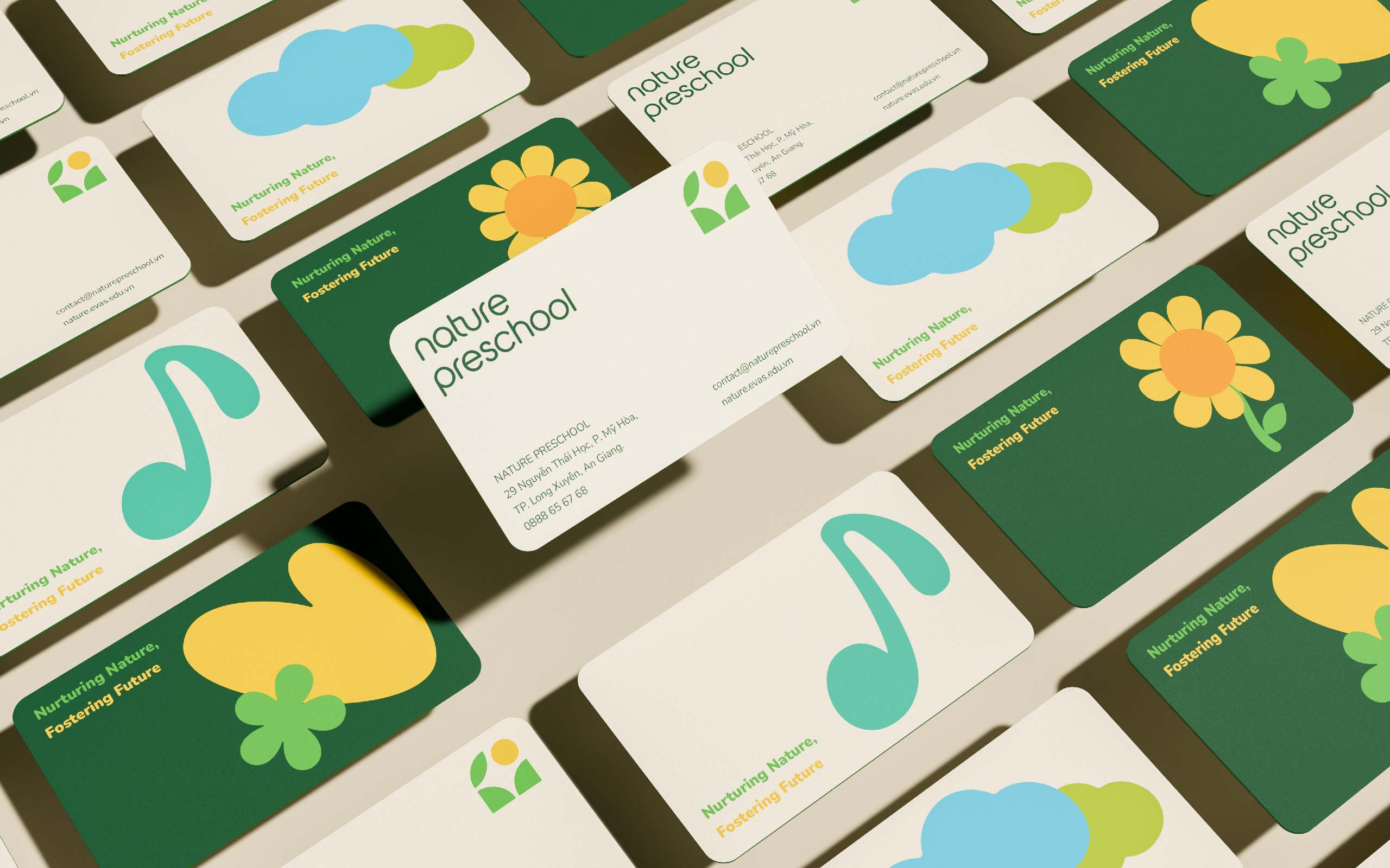 To realize the vision and mission of Nature Preschool, Tree Creative focused on developing a brand identity using images familiar to children in nature: sunflowers symbolizing strength and positivity, Bodhi leaves representing peace and luck, and other elements like the sun, clouds, musical notes, small footprints, and waving hands. These were expressed through delicate “scribble” drawings in bright colors, capturing the worldview of children and enhancing the brand’s friendliness. The simple and familiar design reaffirms Nature Preschool’s commitment to understanding and nurturing children, establishing it as the best “companion” on their developmental journey, while also providing parents with confidence and trust in their choice.
