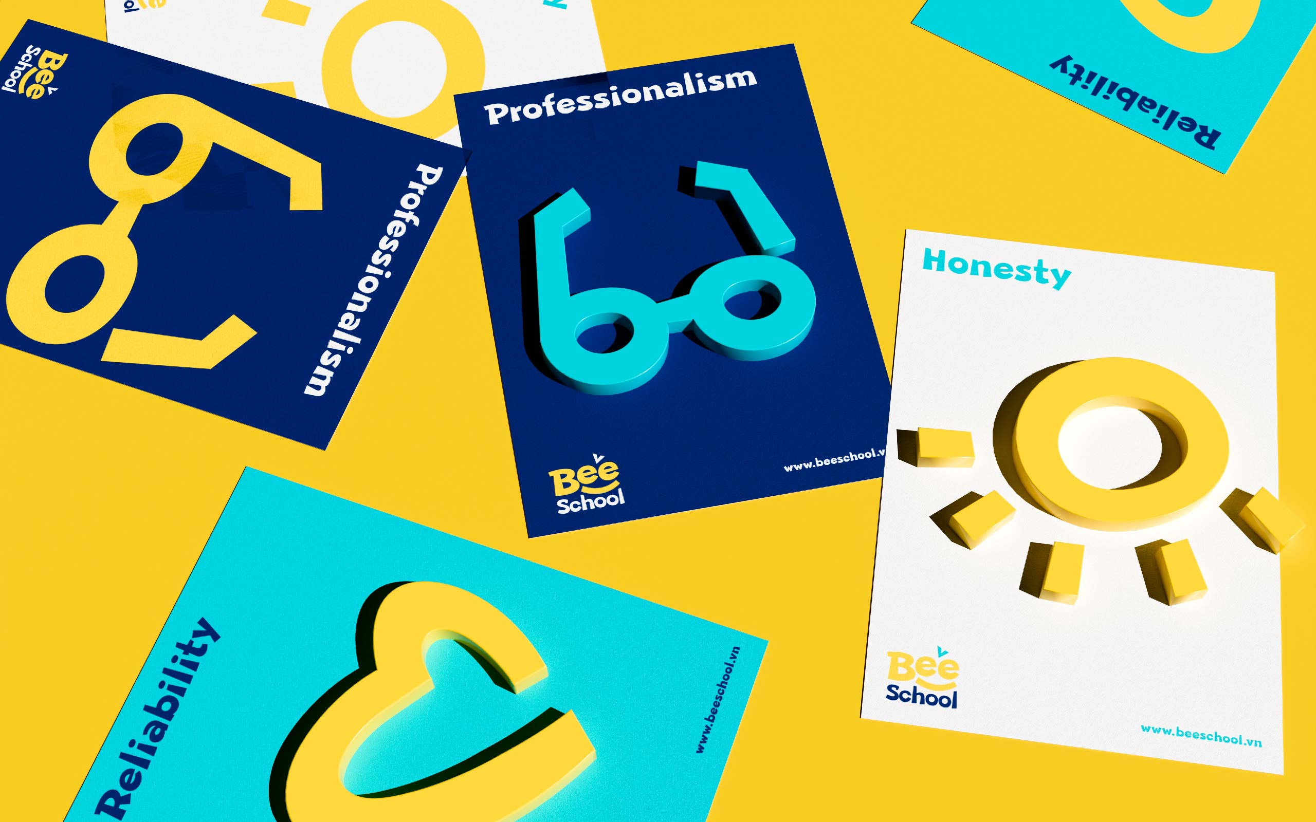 The 3 main colors selected are: dark blue, turquoise and yellow, representing the characteristics of the educational environment and people at BeeSchool. Dark blue represents wisdom, strength, firm will and professionalism for increasing trust and prestige. Turquoise creates a feeling of closeness, friendliness, peace and comfort. Yellow, the color of sunshine, the color of joy, brings warmth, optimism and prosperity.
