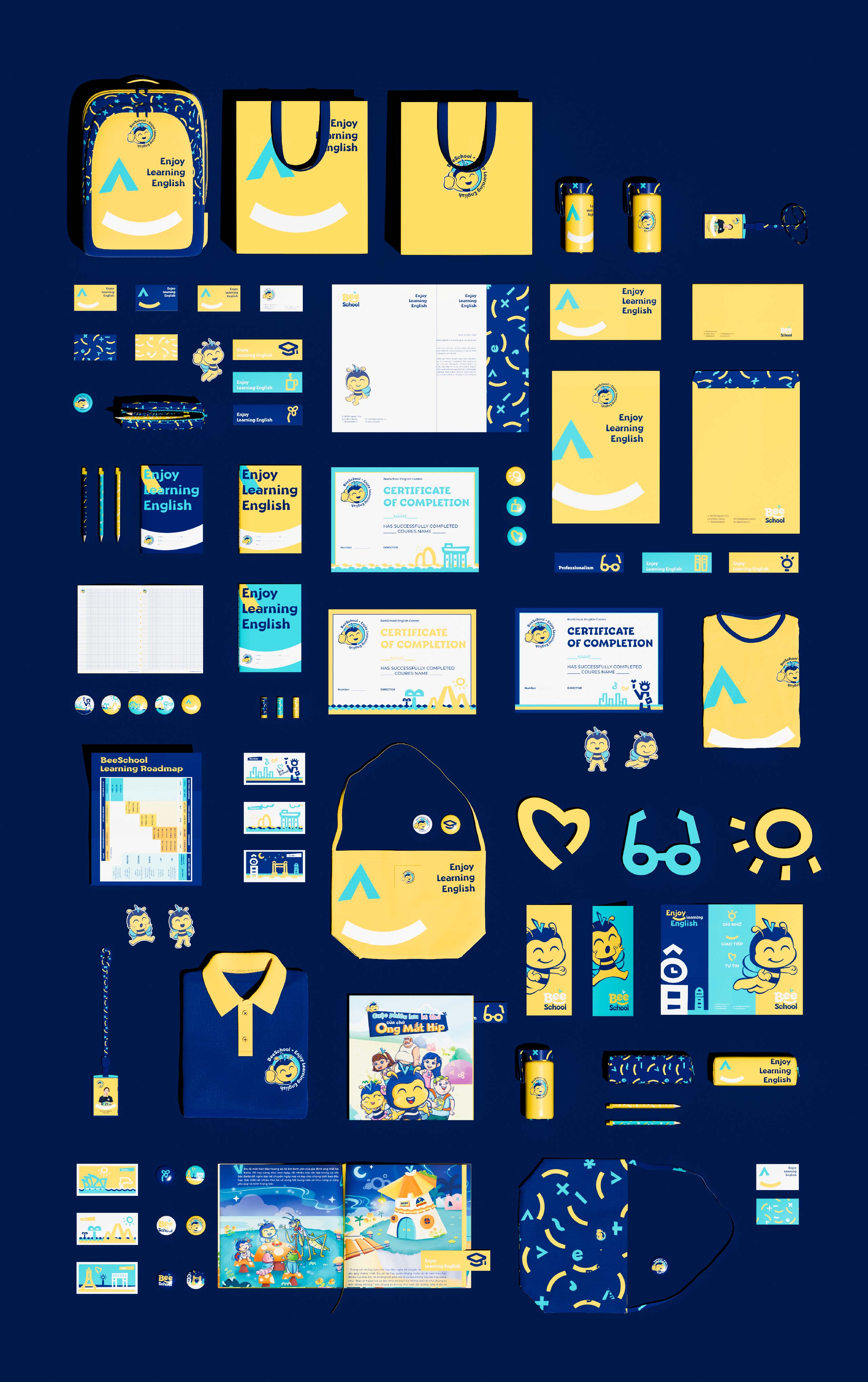 In this project, BeeSchool desires to find new and unique colors to alternate the monotonous and common image which has been built over the last 6 years. Thus, Tree Create is tasked to give a refresh to the logo, recreate the brand identity that evokes a close, professional and reliable experience while still maintaining the funny features that fit the age of the learners. The brand image should convey the spirit of “Enjoy Learning English” with emphasis on the enjoyable and joyful experience for each young learner at BeeSchool.