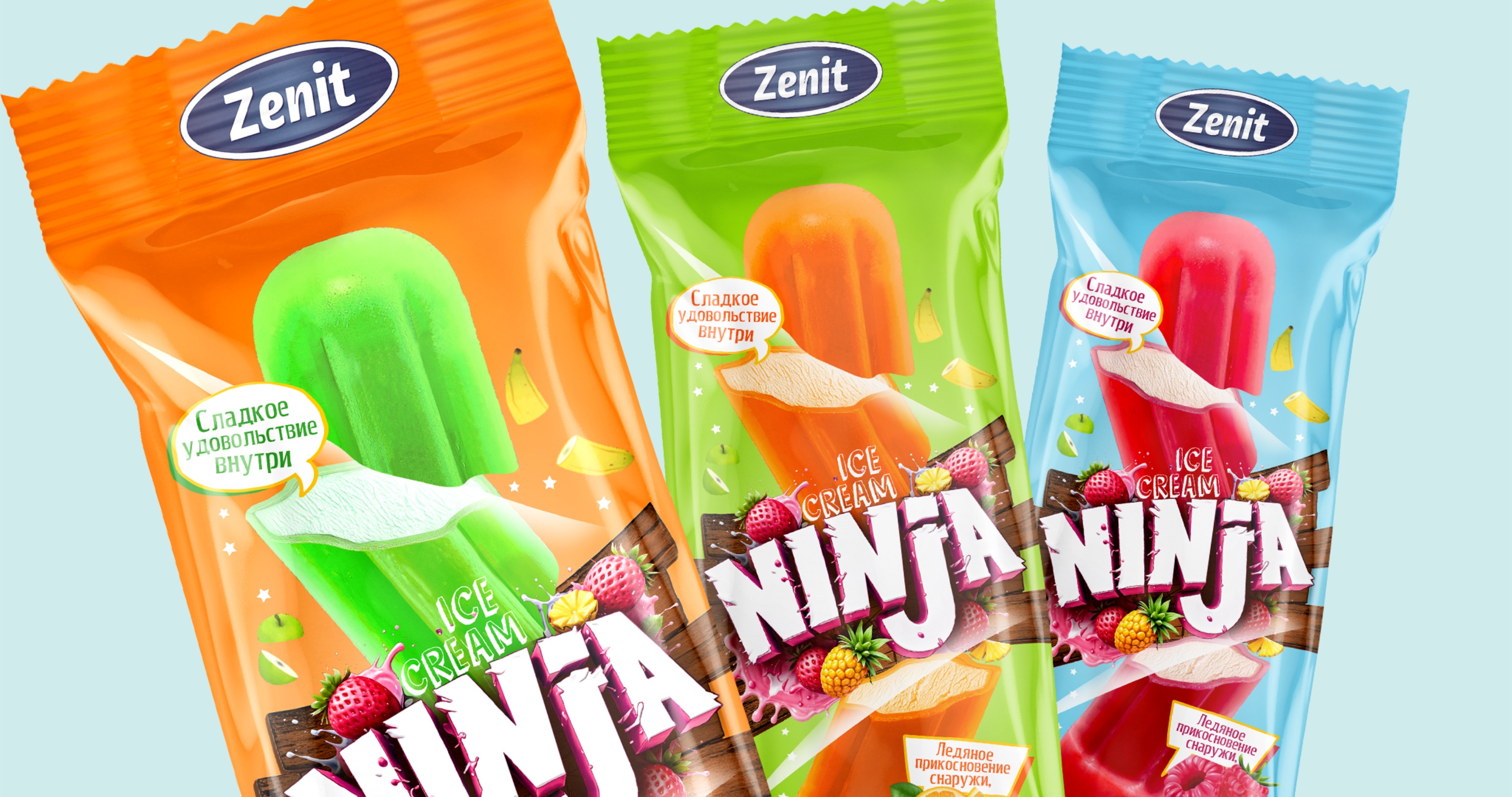 The product featured fruit ice on the outside and creamy plombir inside. The primary audience was teenagers aged 12–16. The objective was to develop a powerful name and cohesive packaging that would capture the attention of a trend-driven audience and communicate the product’s unique taste.
