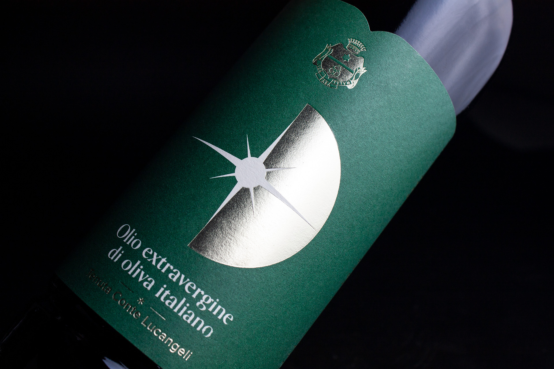 Across the three labels, the interplay between star and sphere establishes a dynamic balance between roots and aspiration, between stability and movement. The white wine, red wine, and extra virgin olive oil become three distinct expressions of a single vision. The graphic design not only highlights the individuality of each product but also translates the family’s long-standing tradition into a contemporary visual language, making tangible the identity of the Conte Lucangeli family and their profound connection to the land they cultivate.