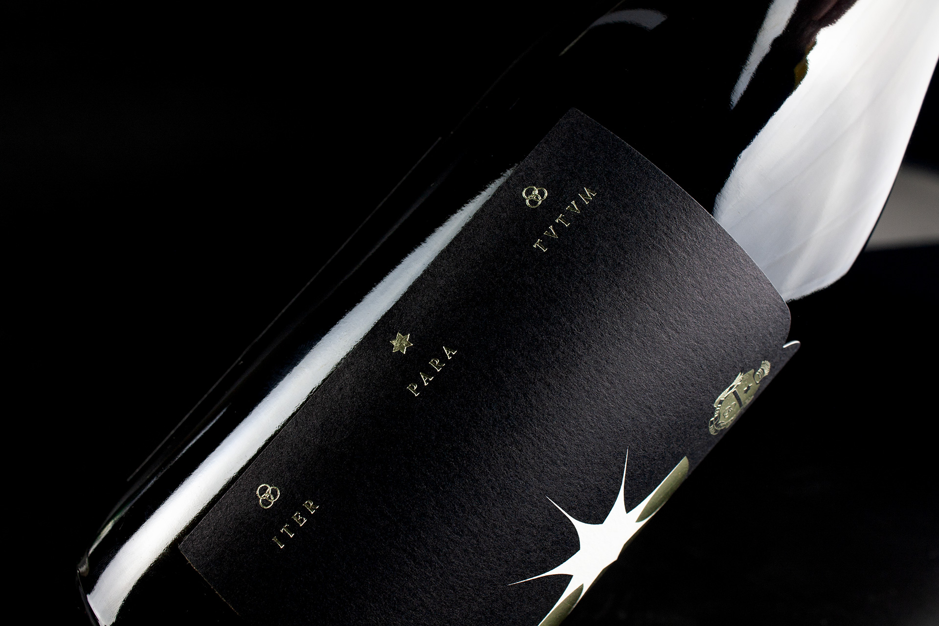 At the heart of the family’s visual identity lies the heraldic coat of arms, featuring three interlaced rings, a star, and the motto ITER PARA TVTVM (“protect our path”). This emblem serves as the conceptual starting point for a contemporary graphic design project, in which the heraldic elements are deconstructed, reinterpreted, and layered to create a distinctive series of three labels: a white wine, a red wine, and an Italian extra virgin olive oil.