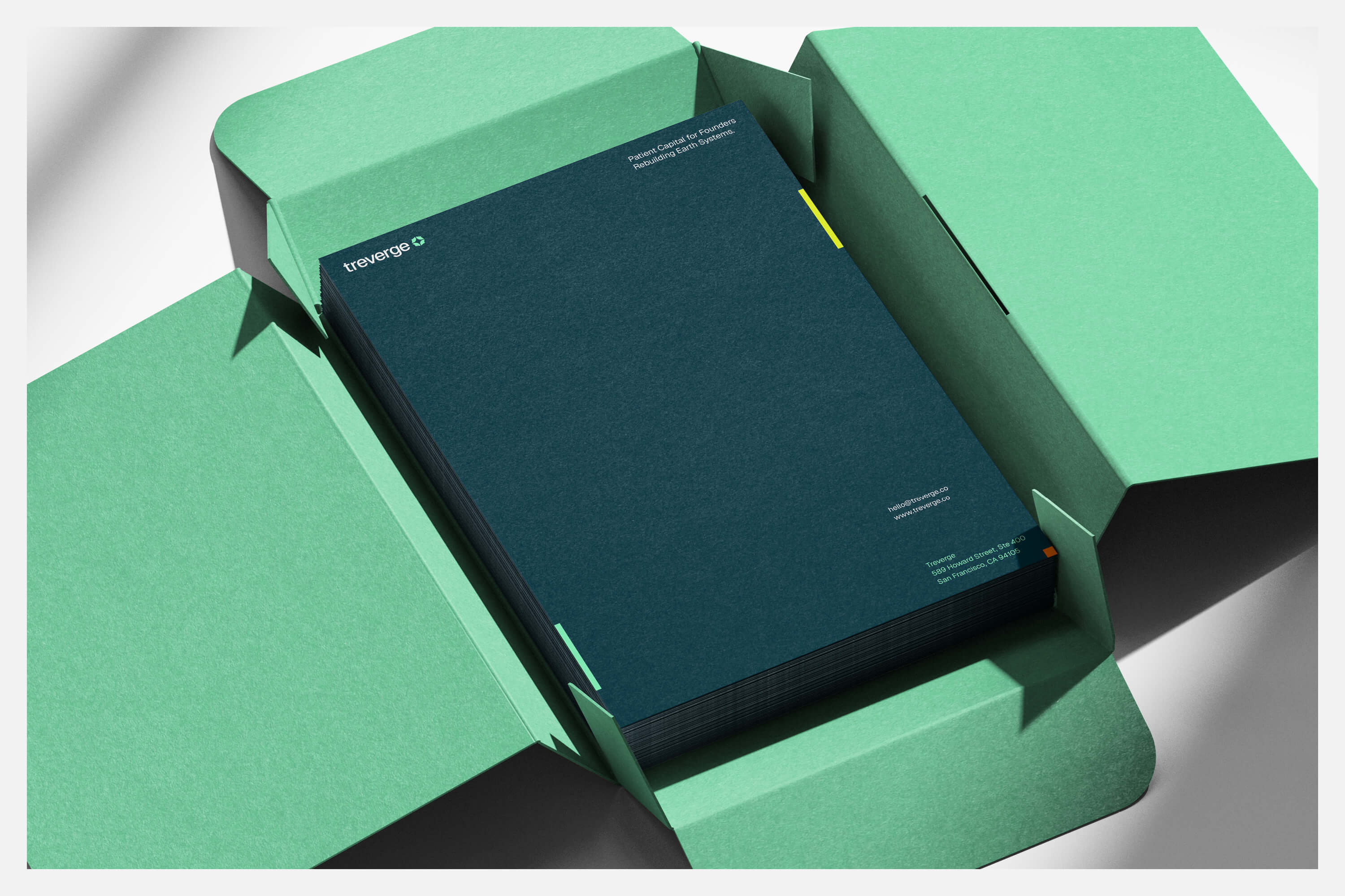 The venture capital brand identity positions Treverge to filter for the right founders rather than appeal broadly. Every brand touchpoint reinforces their core insight: infrastructure measured in gigatons and terawatts requires patient capital structured for decades, not quarters. The result is a brand identity system as systematic and precise as the planetary infrastructure it represents, successfully differentiating Treverge within the venture capital landscape.