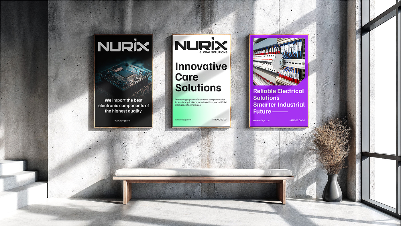 NURIX offers a wide and diverse range of services and products, including electronic and electrical components as well as technical units. For this reason, we have chosen a versatile and flexible color palette that can be applied in a cohesive and practical way. This choice reflects the company’s goal of expressing the diversity of its commercial, technical, and electronic component offerings.