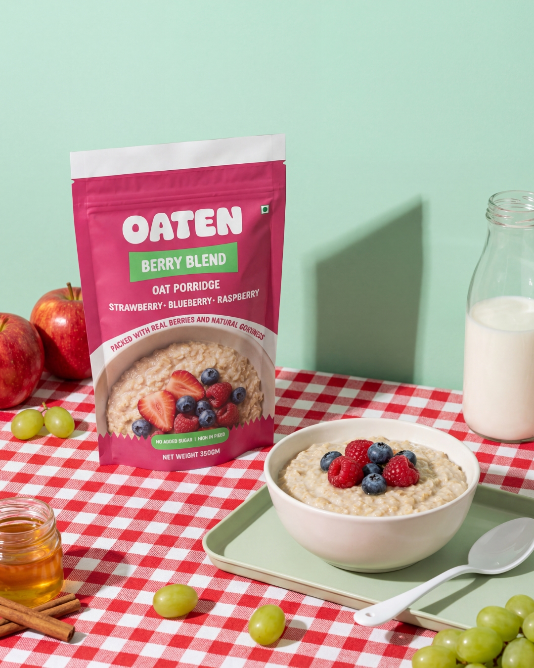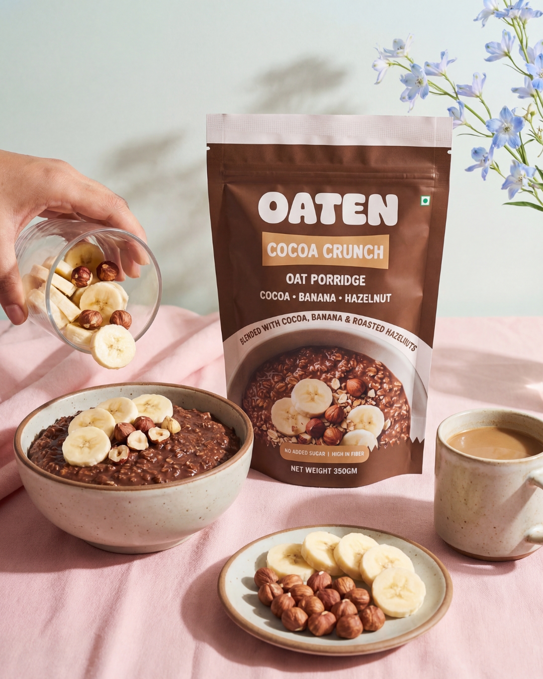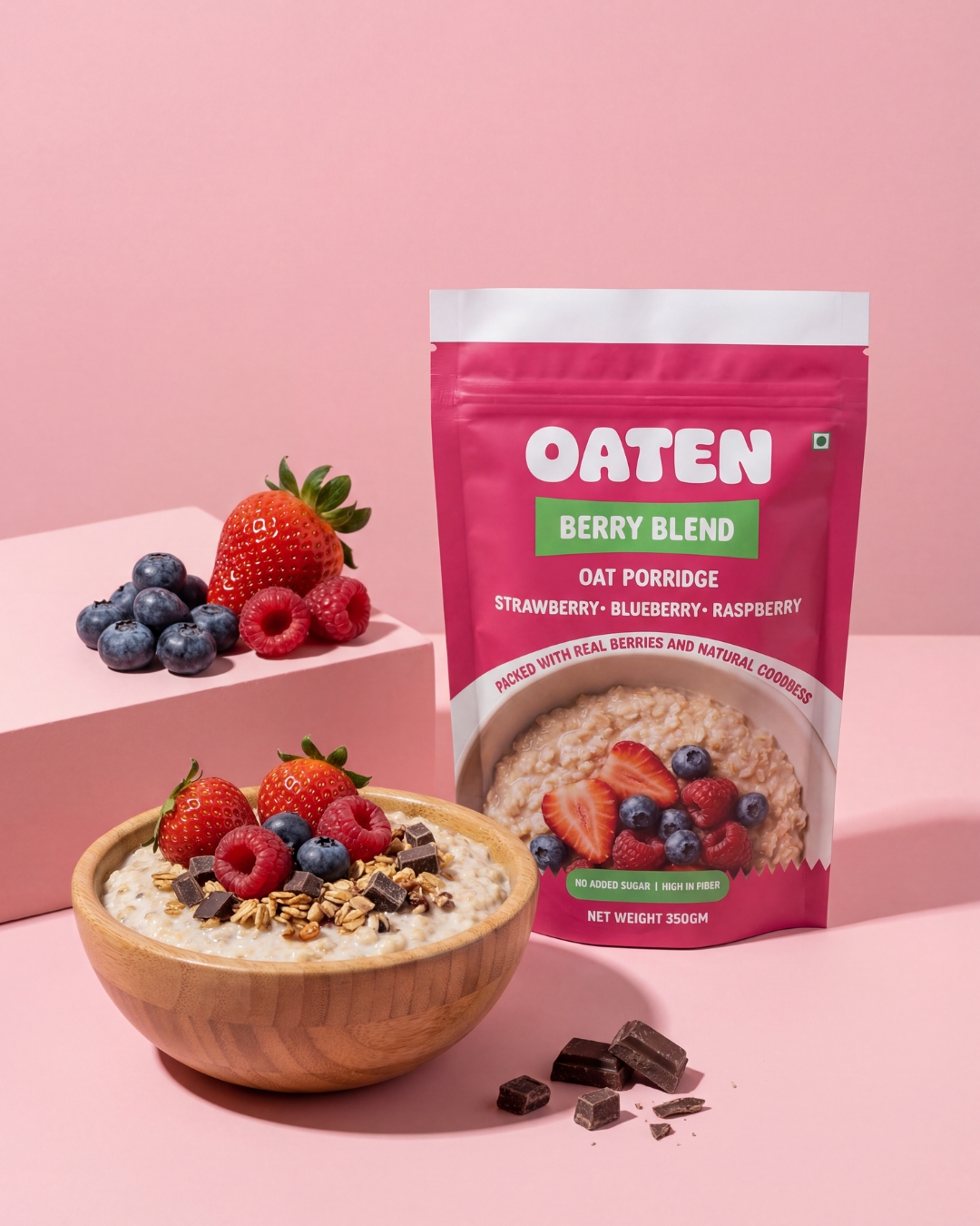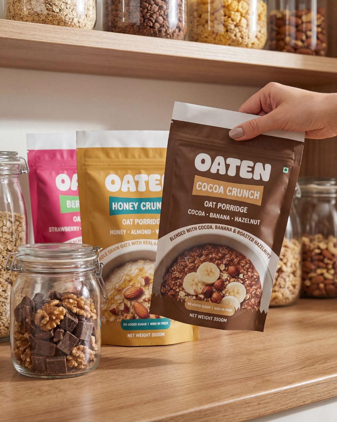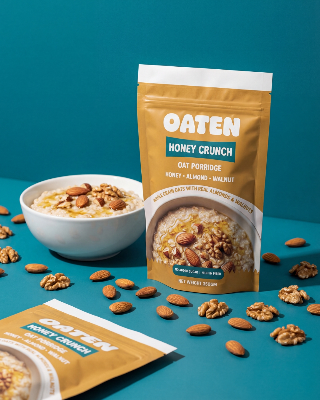 Food imagery plays a key role in the design. Each pack features a top-view bowl of oat porridge with real ingredients, enhancing appetite appeal and reinforcing authenticity. The use of simple typography and minimal yet effective claims such as “No Added Sugar” and “High in Fiber” ensures the packaging remains informative without feeling overwhelming.